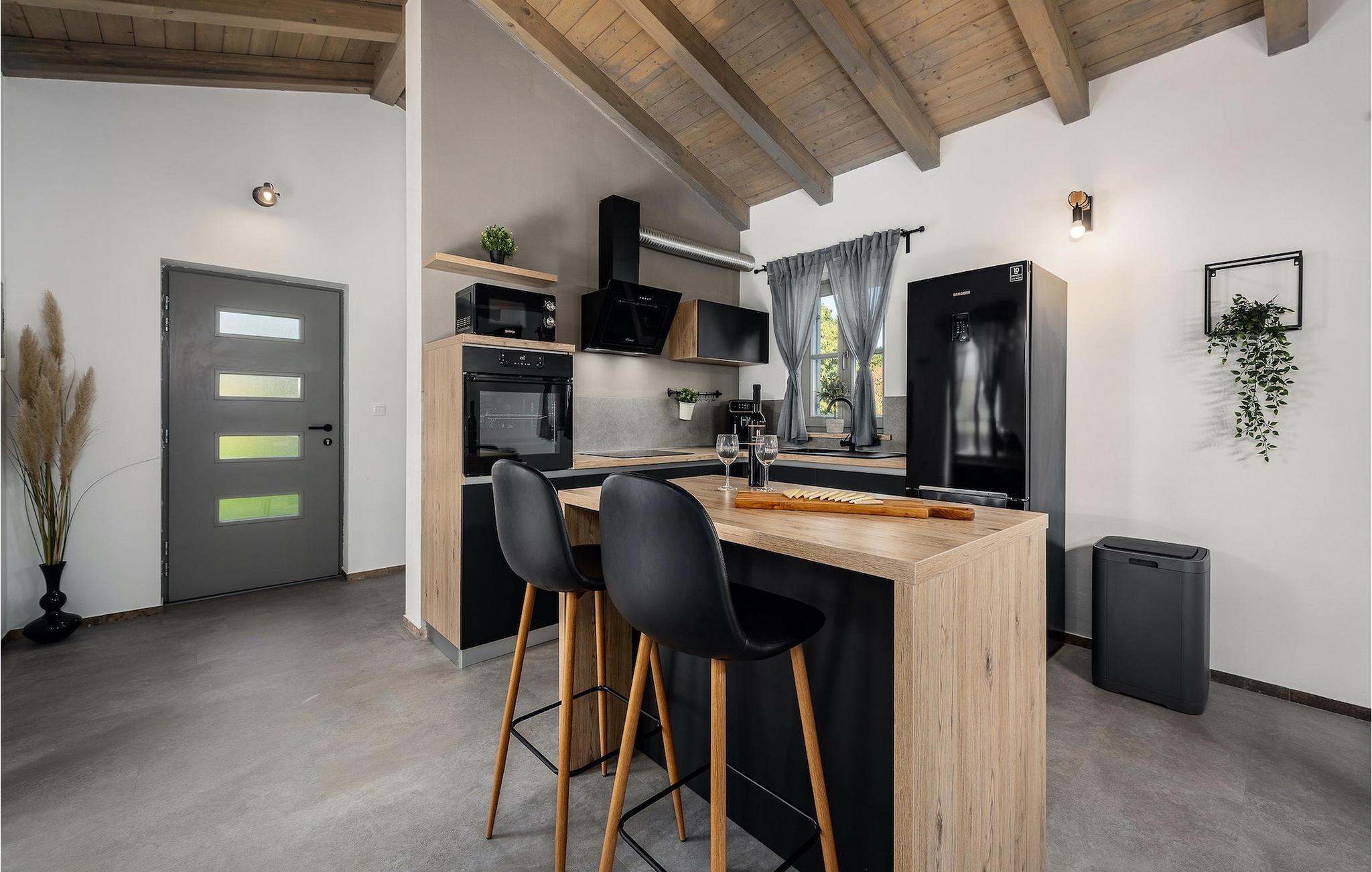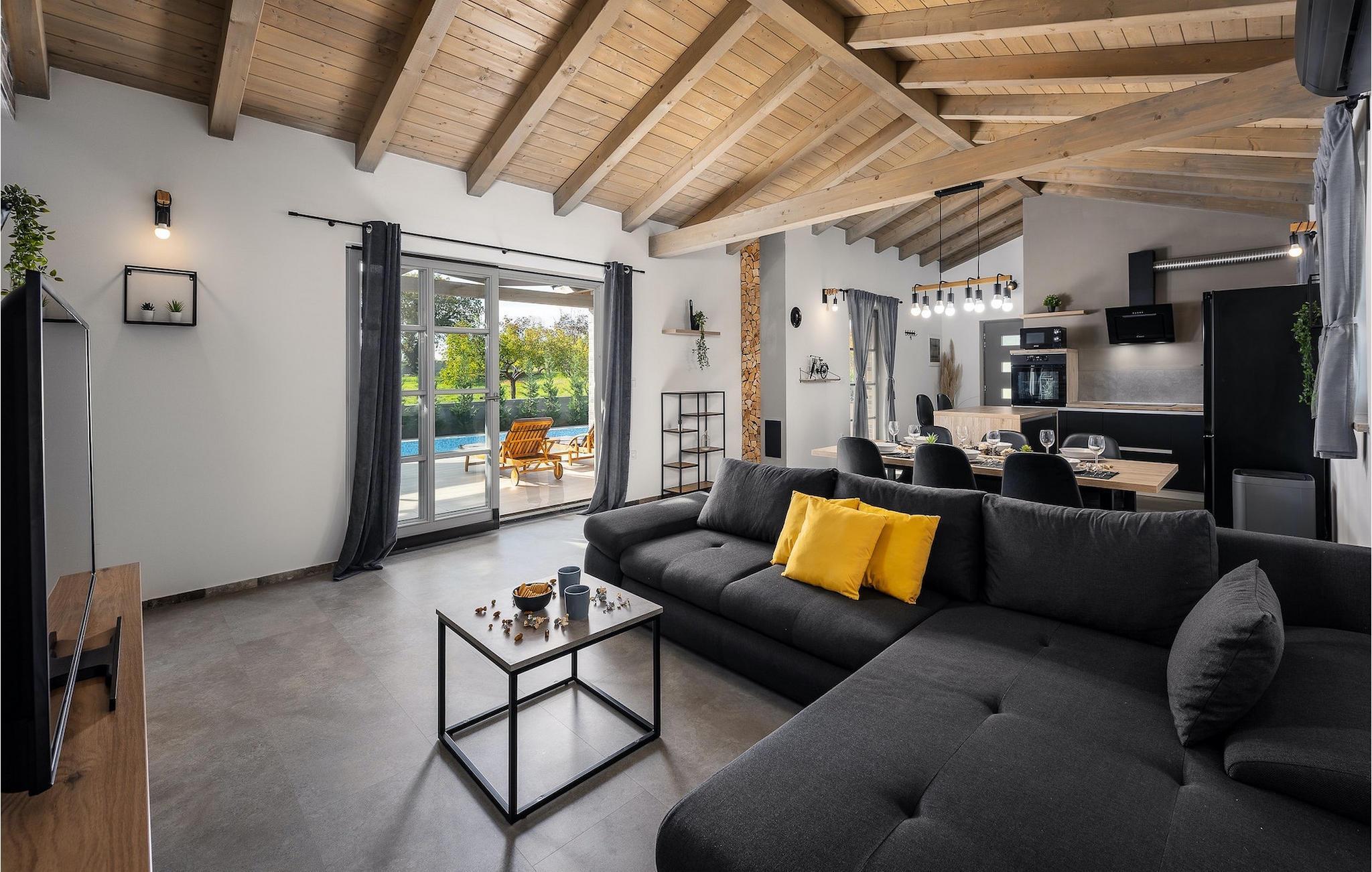 Interiøret i denne villa er simpelthen fortryllende. Villaen har en rummelig moderne stue, en stilfuld spiseplads og et fuldt udstyret køkken, hvor trædetaljerne giver huset et varmt, naturligt præg. I villaen finder du tre hyggelige soveværelser. Det ene soveværelse har sit eget elegant møblerede badeværelse, men der er også et andet badeværelse og et separat toilet i villaen.