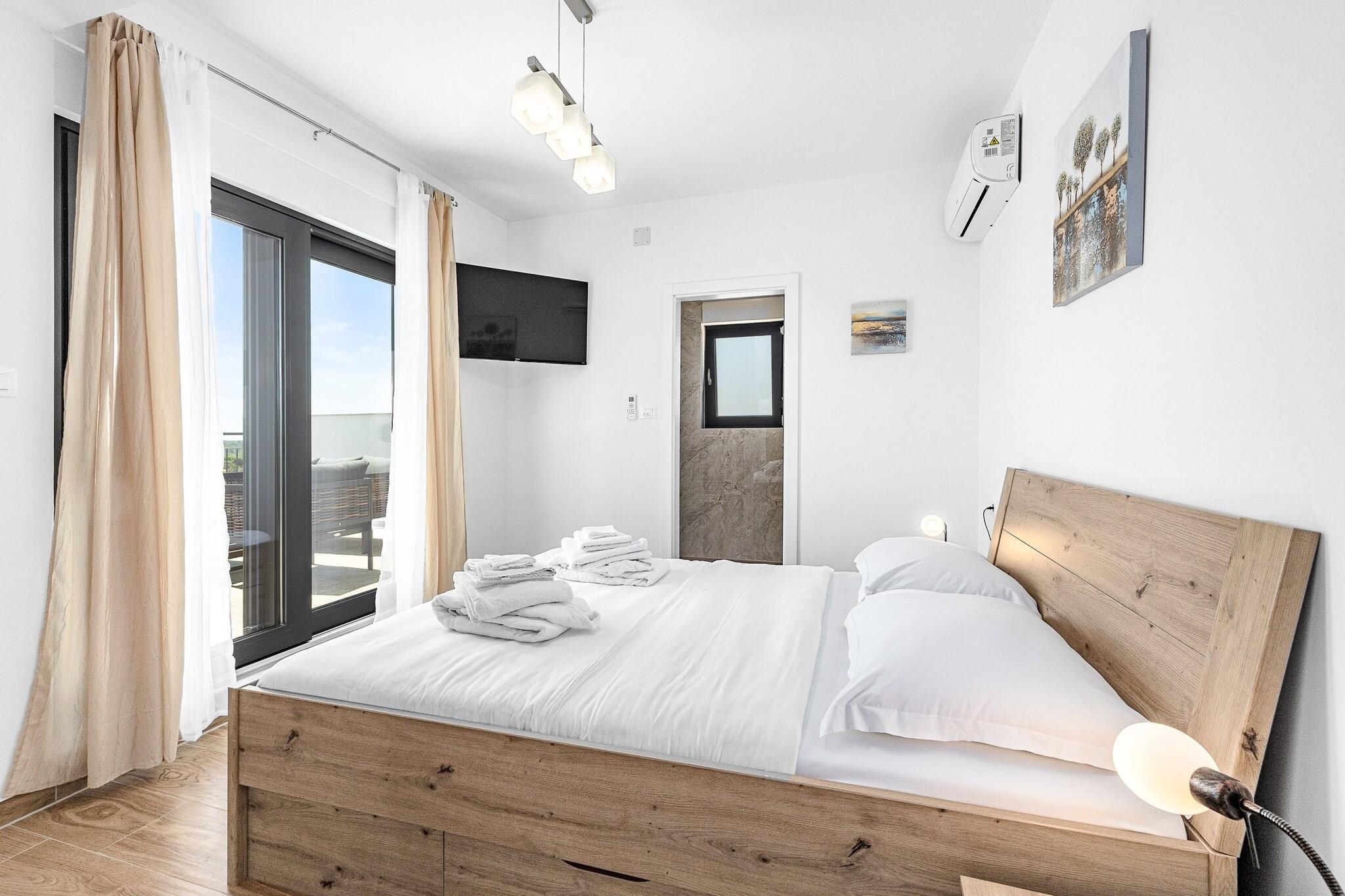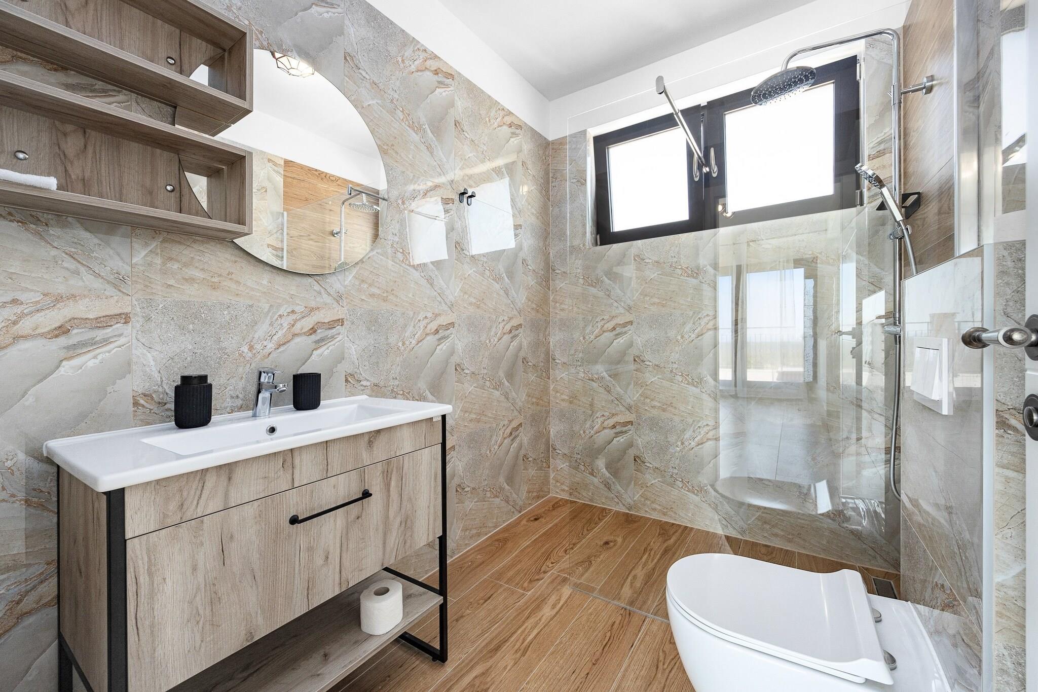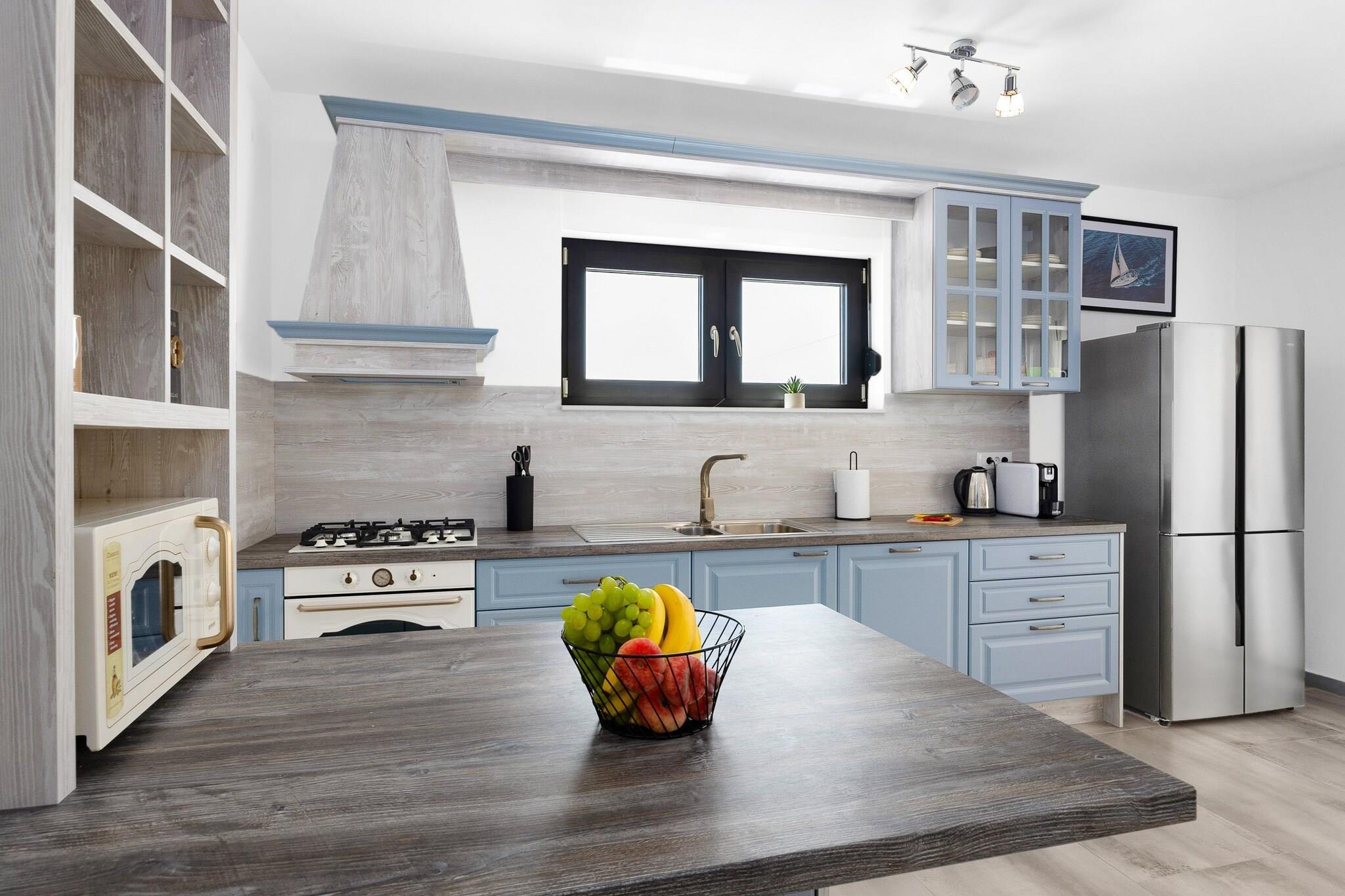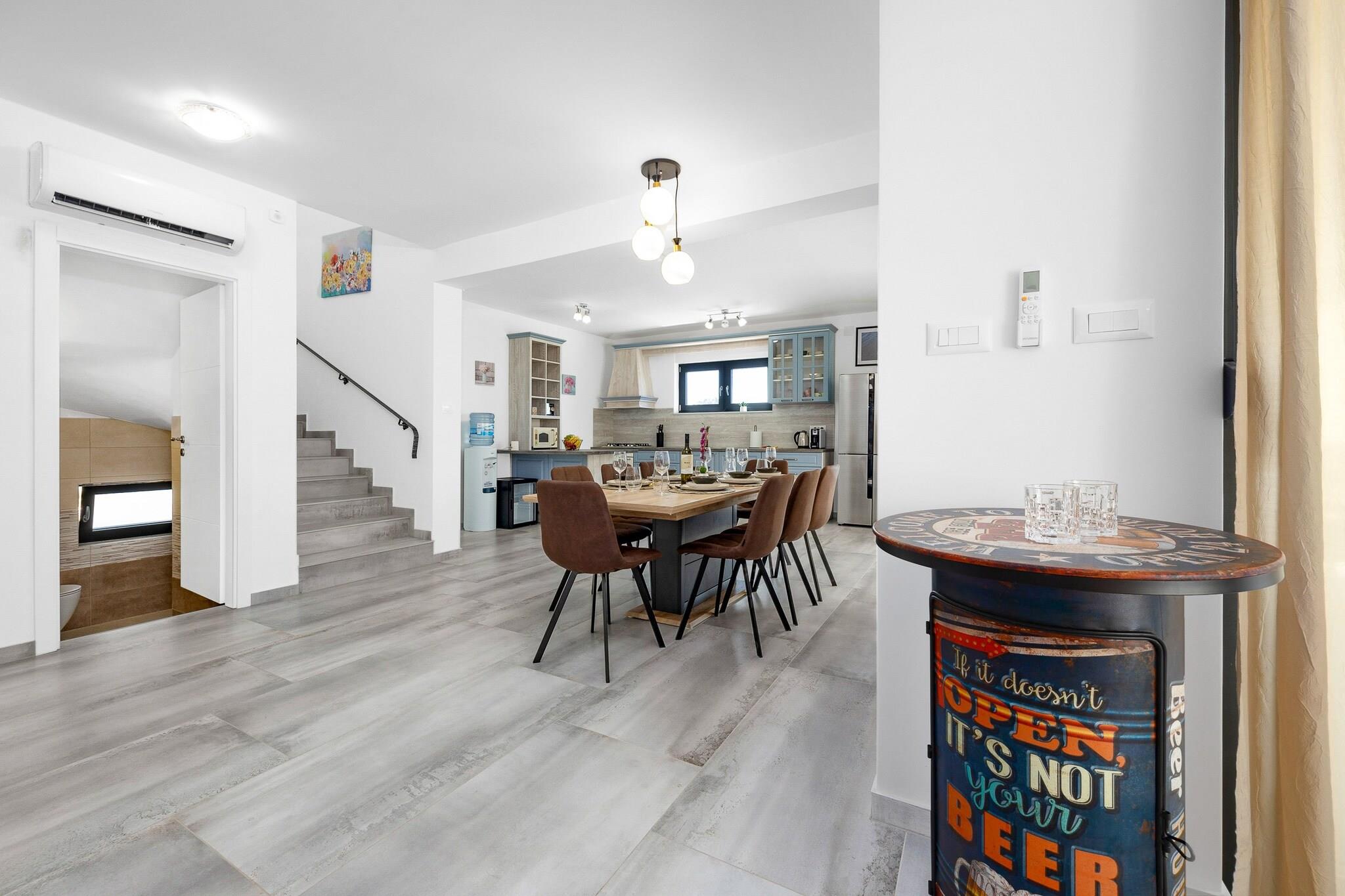 Denne fantastiske villa i Krnica tilbyder rummelig indkvartering med 4 smagfuldt indrettede soveværelser, der giver rigelig plads til op til 10 gæster (maksimalt 8 voksne). Den 200 m² store villa er en nybygget ejendom, designet med moderne stil og komfort i tankerne. Gæsterne kan nyde en række faciliteter, herunder en privat swimmingpool, spabad, aircondition og 5 tv med satellitkanaler til underholdning. Ejendommen har også en smuk have, udendørsmøbler, en terrasse og en grill, hvilket gør den ideel til at slappe af eller spise udendørs. Derudover tilbyder villaen væsentlige tjenester såsom vaskemaskine, strygejern, pengeskab og gratis Wi-Fi. Beliggende i et fredeligt og familievenligt landområde, er villaen bekvemt beliggende kun 200 meter fra en restaurant og 300 meter fra et supermarked, hvilket sikrer nem adgang til væsentlige tjenester. En klippestrand ligger kun 1 km derfra, mens en sandstrand 15 km fra ejendommen byder på forskellige kystoplevelser. Busstationen ligger kun 1 km væk og giver bekvemme transportmuligheder, og lufthavnen og togstationen ligger begge 15 km væk, hvilket gør det nemt at rejse til og fra villaen. Villaens fuldt udstyrede køkken i åbent plan har moderne induktionsapparater, herunder køleskab, mikroovn, ovn, fryser og opvaskemaskine. Gæsterne vil finde alt, hvad de har brug for til at tilberede måltider, herunder kaffemaskine, brødrister, kedel, komfur og køkkenudstyr. Med så omfattende faciliteter giver villaen det perfekte miljø for et afslappende og behageligt ophold med familie eller venner.