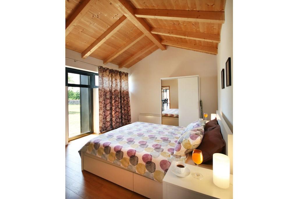 Huset har et boligareal på 115 kvadratmeter. Det indeholder to soveværelser på 16 kvadratmeter, hver med en dobbeltseng, garderobe, kommode og natborde. Hvert soveværelse har adgang til terrassen og haven. Hoveddelen af huset består af en rummelig stue med to store vinduer og en dejlig udsigt over haven. Huset er udstyret med tv, Wi-Fi og parabolantenne. Et spisebord til seks personer, en lang bar og et køkken er integreret i stuen. Køkkenet er fuldt udstyret med køleskab, fryser, ovn, opvaskemaskine, filterkaffemaskine osv. Trætrappe med LED-belysning fører fra stuen til en 22 kvadratmeter stor hems. Hemsen har en dobbeltseng med natborde og et garderobeskab. En del af hemsen er indrettet som opholdsområde, perfekt til læsning og afslapning. Huset har aircondition og en brændeovn til vinteren.