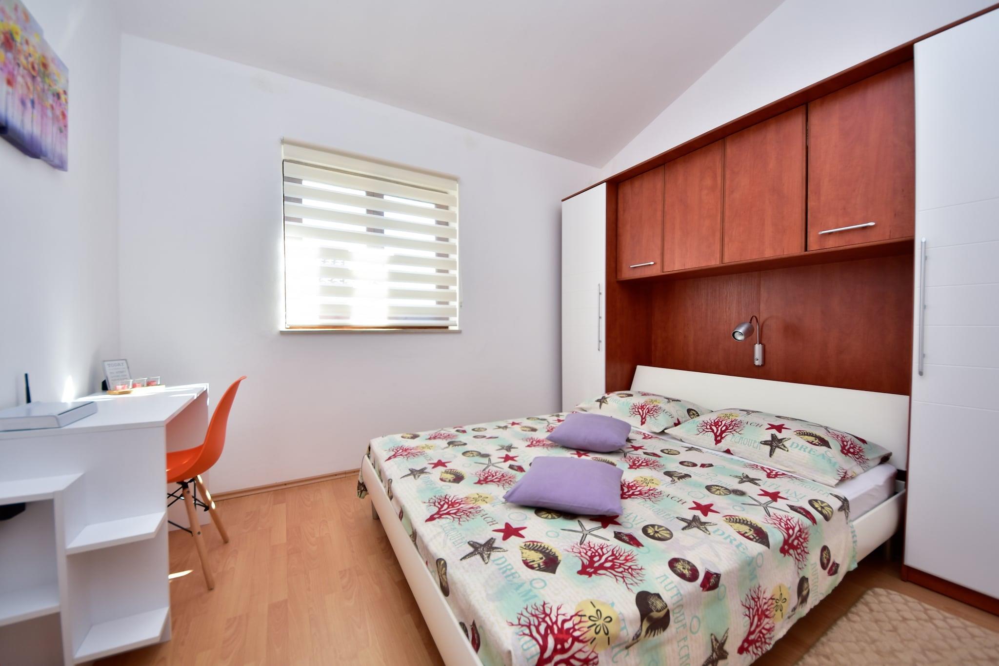 På 1. etage: (åbent køkken(elkedel, komfur(Komfur med fire kogeplader, gas, elektrisk), kaffemaskine, ovn, køleskab, fryser), stue / spisestue(dobbeltsovesofa, Fjernsyn(fladskærm, parabol), spisebord, klimaanlæg), soveværelse(dobbeltseng), badeværelse(bruser, håndvask, toilet, føntørrer), balkon eller terrasse) vaskemaskine(deles med andre gæster), have(deles med andre gæster, oplyst, 1000 m2), havemøbler, grill, parkering, trampolin, rutsjebane, bordtennisbord, dart, cykler til rådighed, Gyngestativ