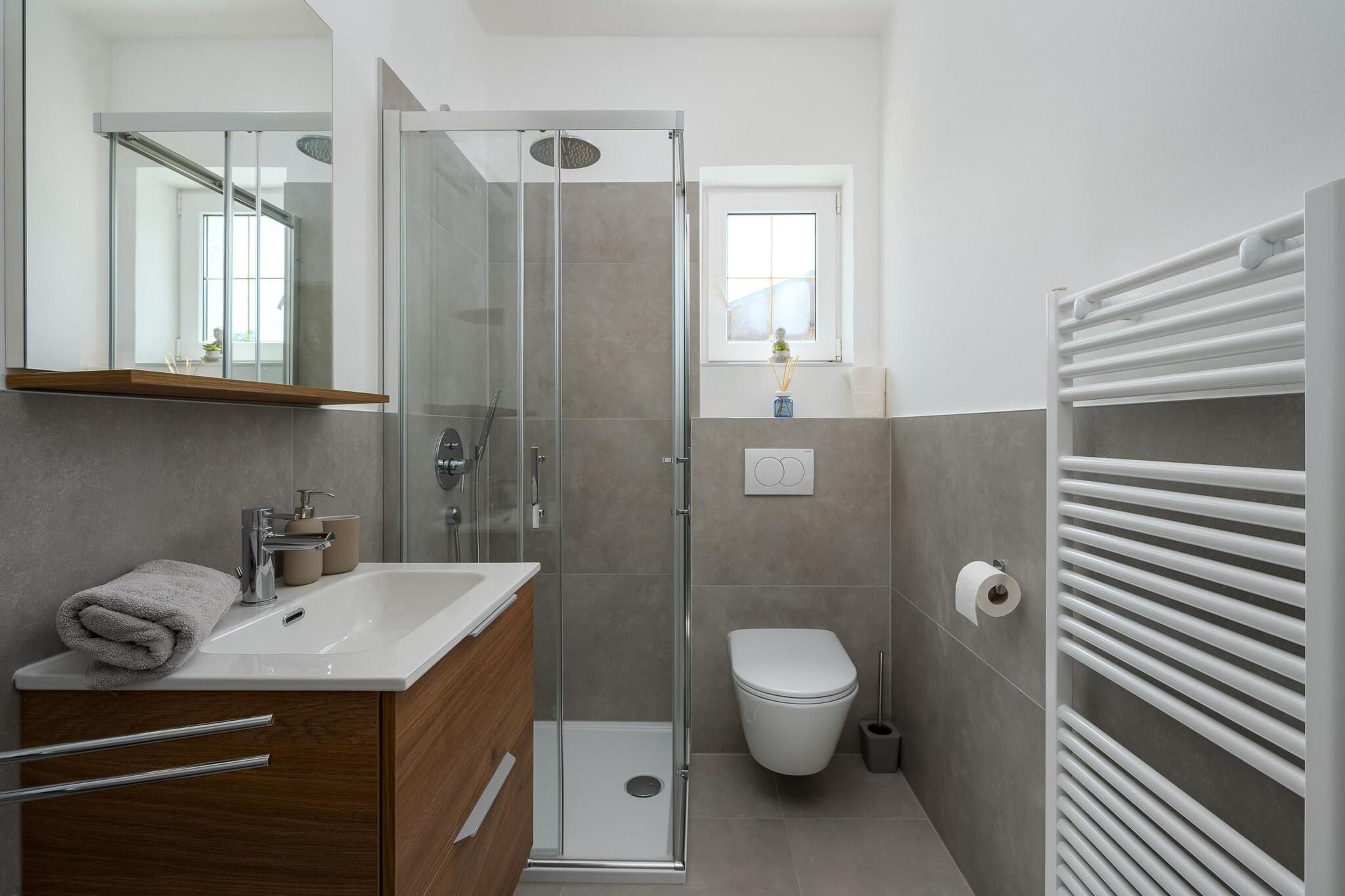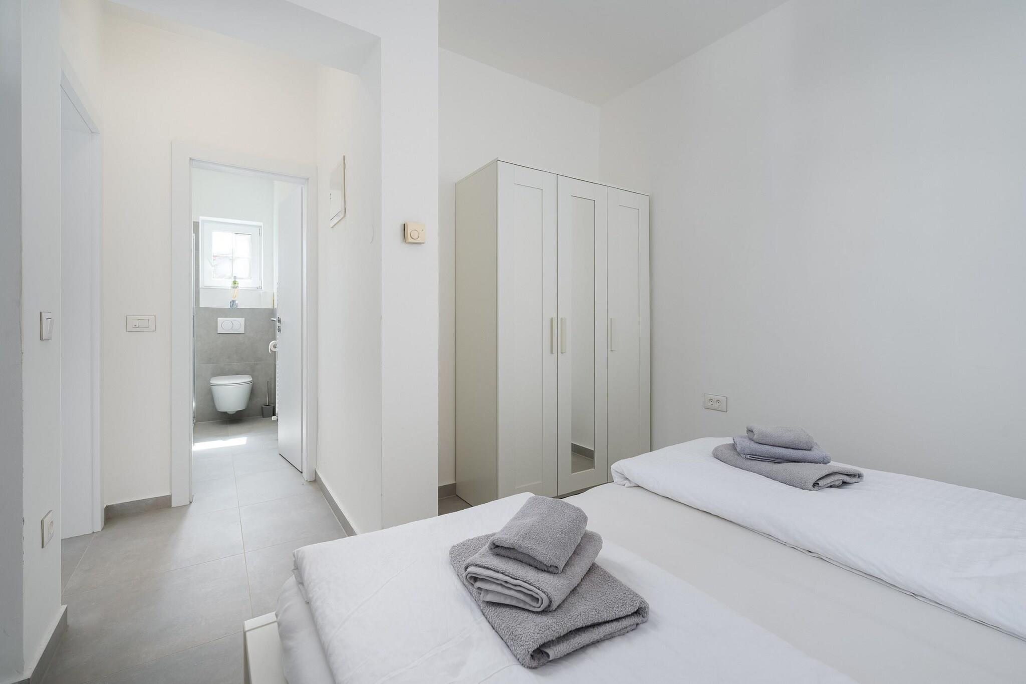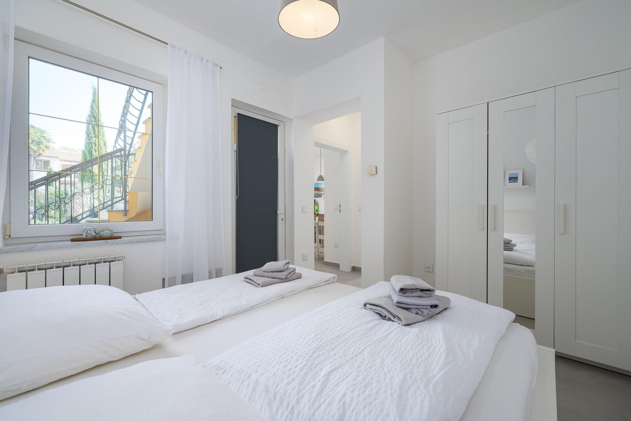 Lejligheden byder sammen med sin moderne og veldesignede indretning et værelse med 1 soveværelse med plads til op til tre gæster. Det har en have med udendørsmøbler, en 15 m² stor terrasse og en grillplads til udendørs spisning. Gæsterne kan nyde den fælles swimmingpool, perfekt til at slappe af i solen. Lejligheden har aircondition og en varmepumpe til komfort året rundt. Yderligere faciliteter omfatter Wi-Fi, et tv med satellitkanaler på engelsk og tysk og udendørs parkering i samme bygning. Lejligheden er beliggende i Kukci, et familievenligt område, som tilbyder fredelige omgivelser, mens den stadig er tæt på flere attraktioner. Den nærliggende strand og lokale restauranter ligger inden for en kort køretur, med Porecs centrum kun 5 km væk, der byder på shopping, restauranter og kulturelle oplevelser. Gæster kan også besøge nærliggende vandlande og forlystelsesparker, herunder "Aquacolors Porec" (8 km) og "Dino Park Funtana" (12 km), hvilket gør dette til en fantastisk mulighed for familier. Lejlighedens åbent køkken er udstyret med moderne induktionsapparater, herunder køleskab, mikroovn, fryser, opvaskemaskine, kaffemaskine, brødrister og kedel. Det leveres også med alt nødvendigt køkkenredskaber, tallerkener og bestik, så du kan tilberede måltider praktisk og let Med sin kombination af praktiske faciliteter og et afslappende miljø er lejligheden et ideelt valg for par eller små familier, der søger en behagelig base for deres ophold i Istrien.