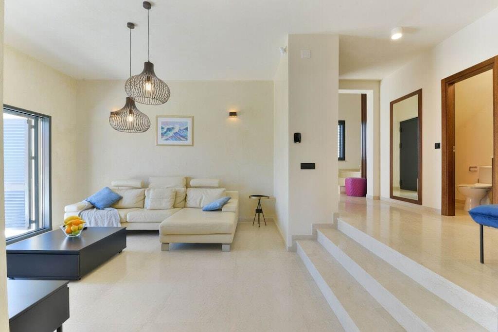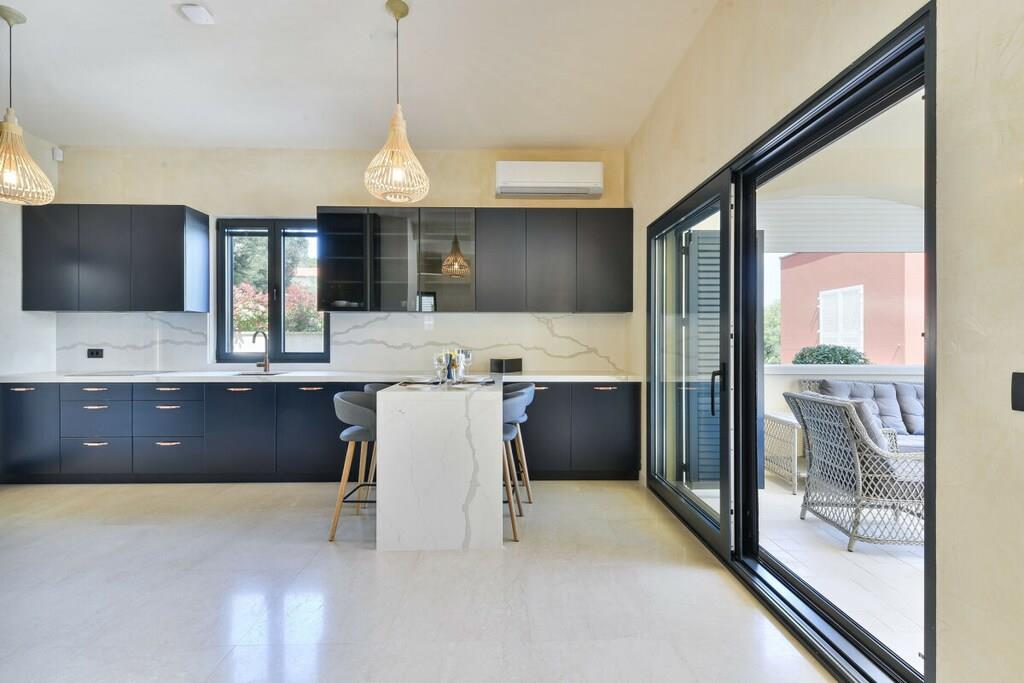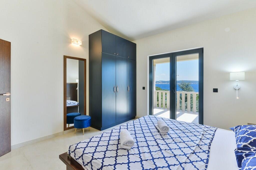 Interieur auf 270m2 erweitert, sondern auch mit einem erstaunlichen Meerblick. Erdgeschoss besteht aus einer voll ausgestatteten Küche mit hochwertigen Geräten, geräumiges Wohnzimmer mit herrlichem Panoramablick auf das Meer und Ausgang zur Terrasse, Wi-Fi, TV SAT; A/C. Auf dieser Etage befindet sich ein Hauptschlafzimmer mit eigenem Bad und extra Toilette. Auf der ersten Etage finden Sie 3 geräumige Schlafzimmer mit einem Doppelbett, eigene Bäder und Balkon mit herrlichem Meerblick. Alle Schlafzimmer sind klimatisiert. Die zweite überdachte Terrasse befindet sich auf der Rückseite des Hauses mit einem Essbereich im Freien und einer Grillstation. Das Anwesen ist komplett eingezäunt mit einem Garten von 1000m2, großen Swimmingpool, Sonnenliegen, Außendusche und einen privaten Parkplatz.