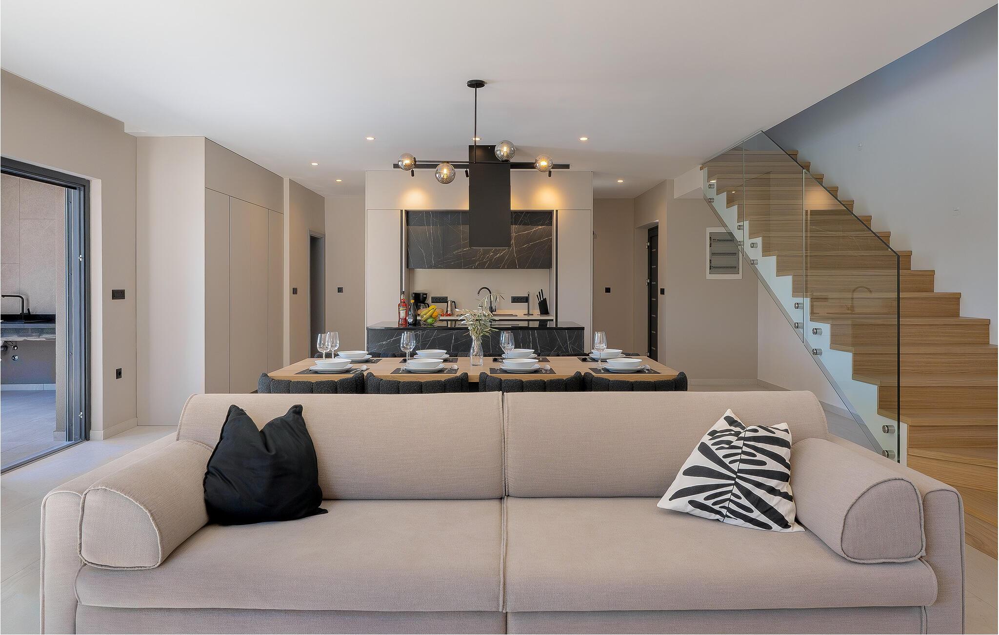 Dette moderne, rummelige feriehus med sit tidløse design er ideel til familier eller vennegrupper. Lav mad sammen i det fuldt udstyrede designerkøkken og nyd jeres måltider ved det store spisebord. Udfordr hinanden med bordfodbold eller billard eller slap af i de komfortable sofaer med en god film.