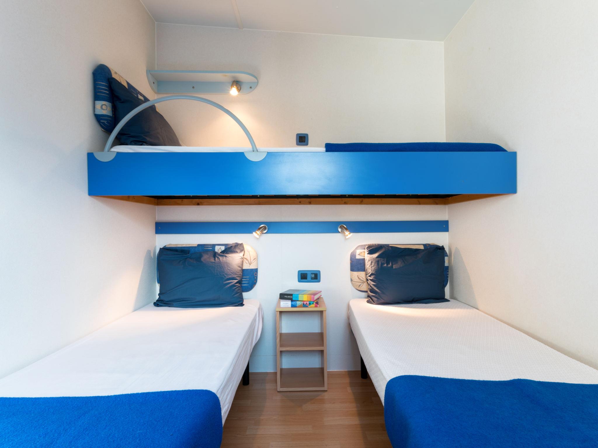 "Baia Lux", 3-room mobile home 31 m2. Practical furnishings: living/dining room with 1 sofabed, satellite TV and air conditioning. 1 room with 1 french bed (140 cm). 1 room with 2 beds (70 cm). Kitchenette (4 gas rings, freezer). Shower/WC. Air-conditioning (extra). Heating not available in all rooms. Terrace 10 m2, roofed. Terrace furniture. Facilities: baby cot for up to 2 year olds (extra). Parking (1 car). Please note: non-smoking house. Maximum 2 small pets/ dogs allowed. Bed layout is flexible. There are more sleeping options available than the maximum number of people allowed which may, however, not be exceeded.