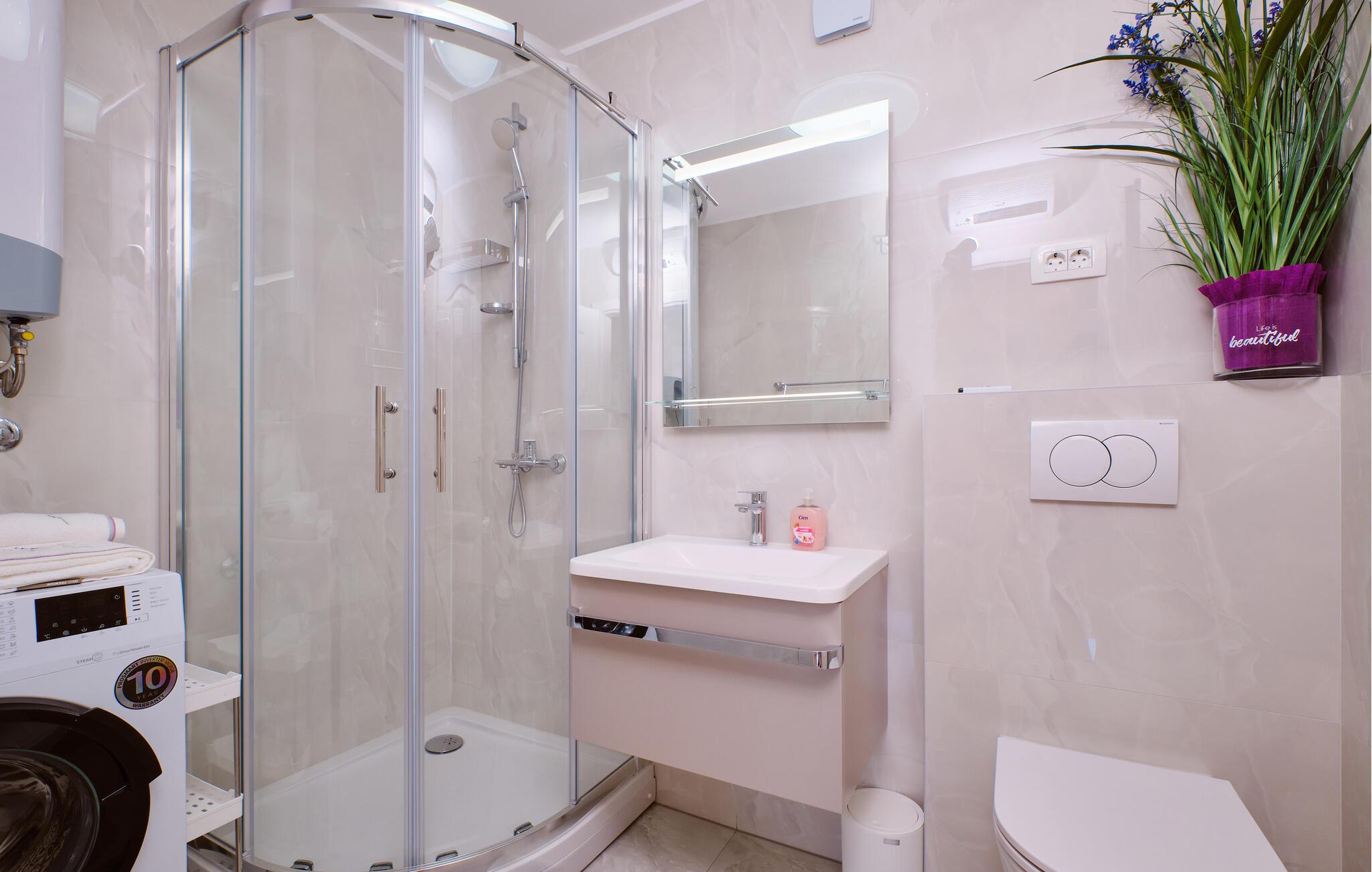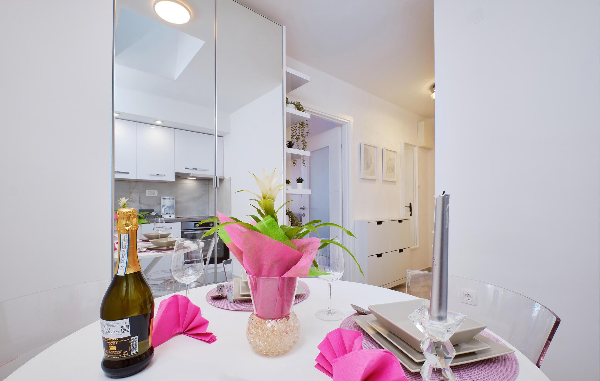 Denne attraktive og rummelige ferielejlighed tilbyder et komfortabelt tilflugtssted kun få minutters gang fra Mali Lošinjs centrum og forkæler jer med en smuk udsigt over byen og havet. Gør nogle lækre ferieretter klar i det moderne køkken og nyd jeres tid sammen med stilfulde måltider ved spisebordet. Slap af om aftenen på den behagelige sofa, hvor I kan streame en film eller forkæle jer selv med en god bog, som I ikke har tid til i hverdagen.