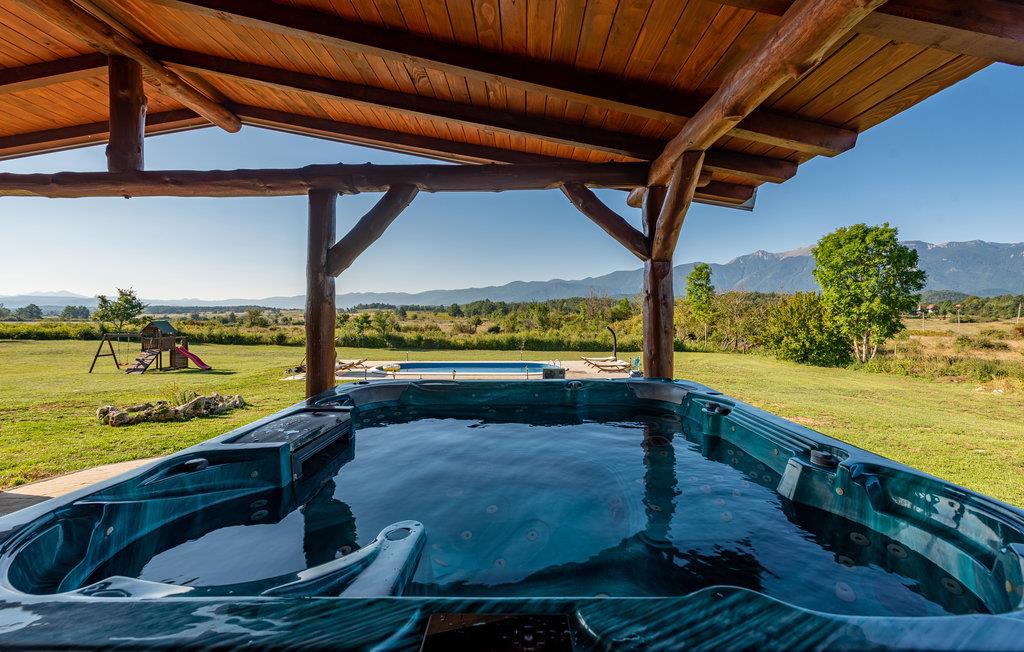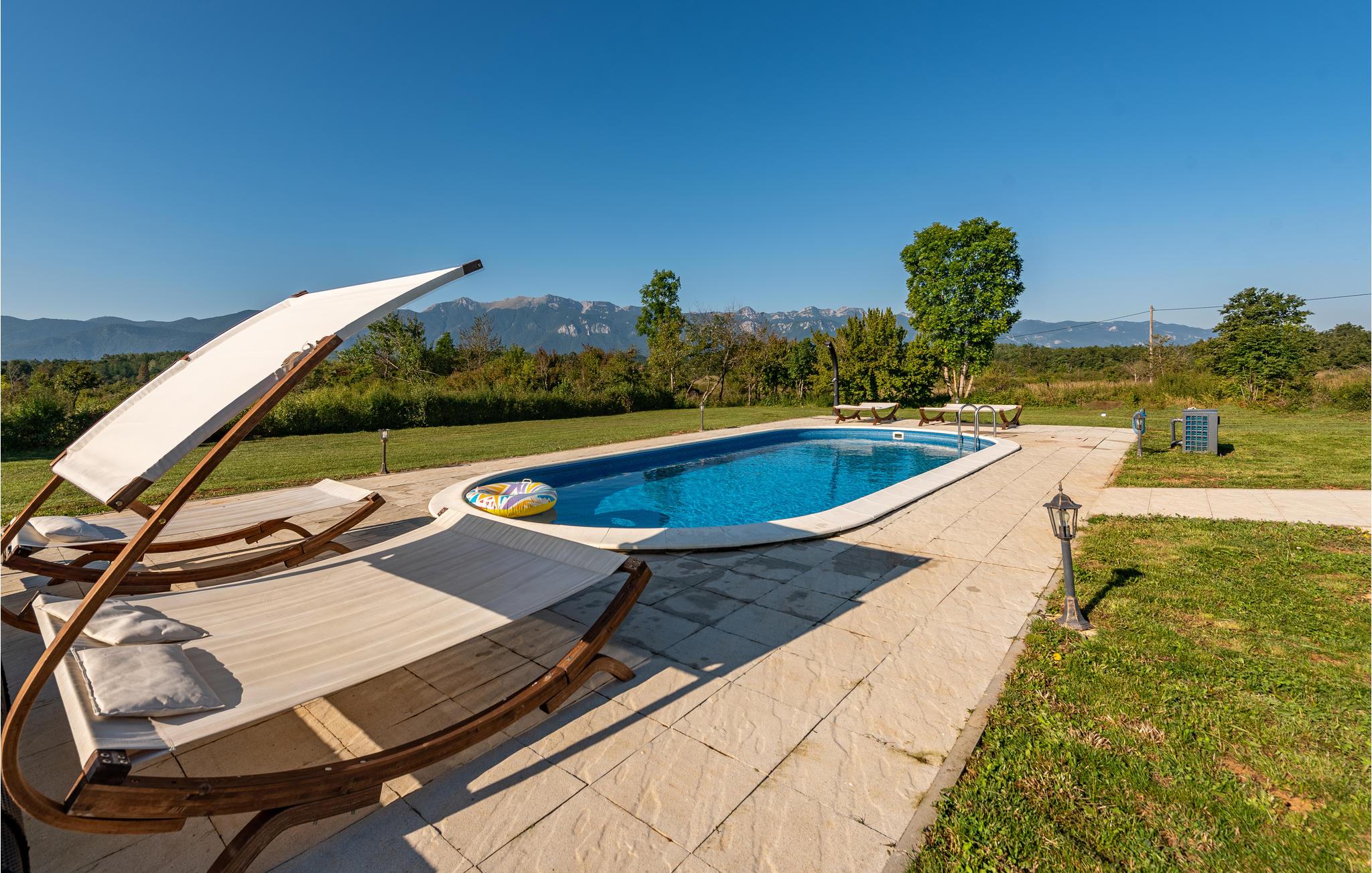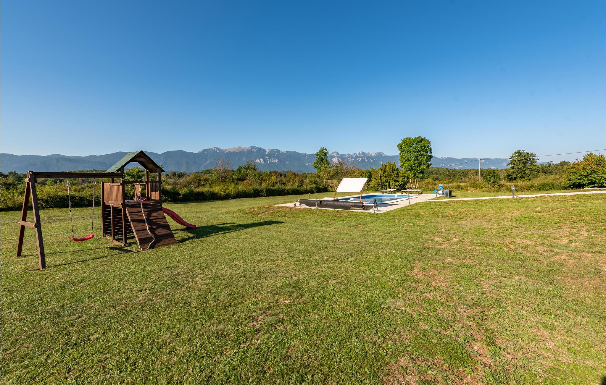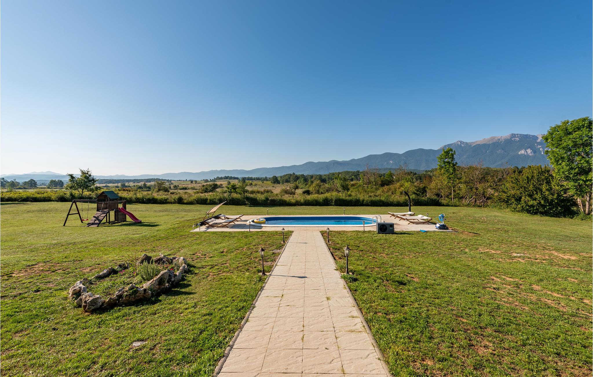 Udenfor inviterer den smukke terrasse med havemøbler og poolområdet med opvarmet pool dig til at tilbringe afslappende timer i den friske luft. Slap af med panoramaudsigt over bjergene, mens børnene leger på ejendommen eller plasker rundt i den smukke pool.