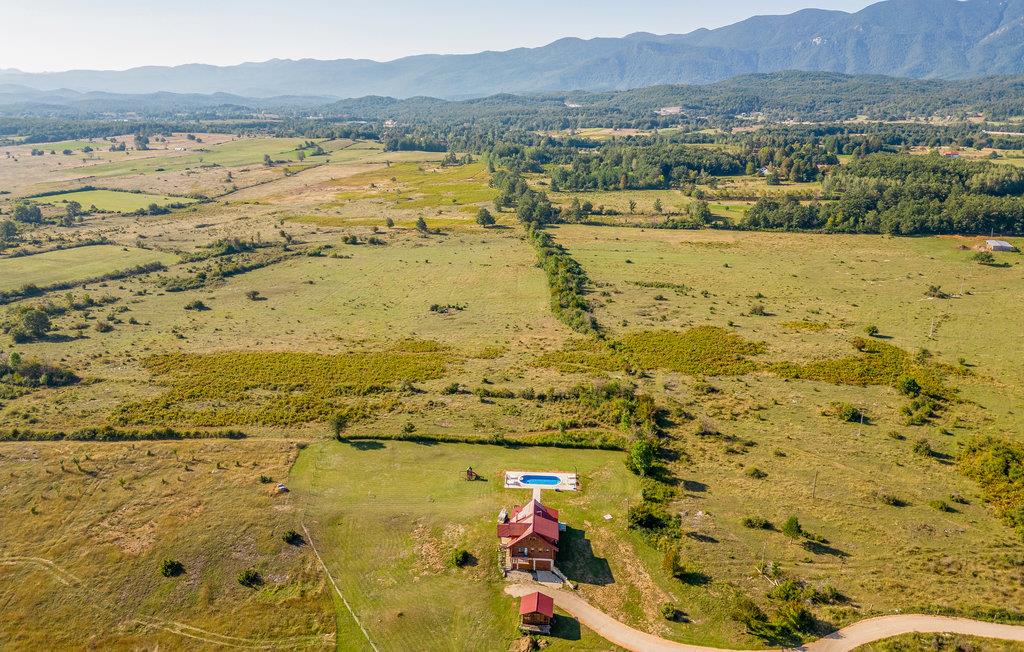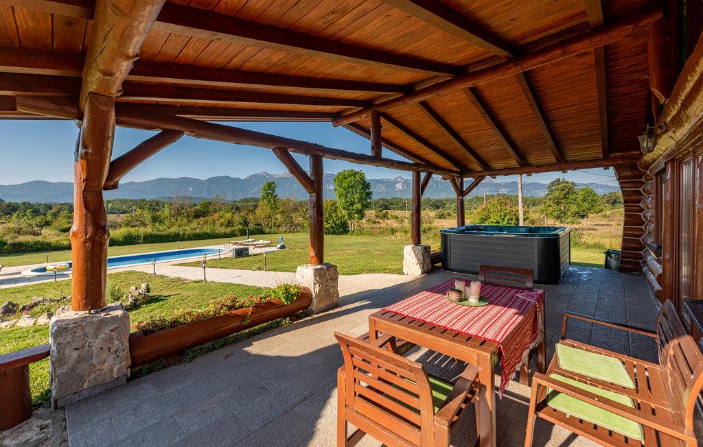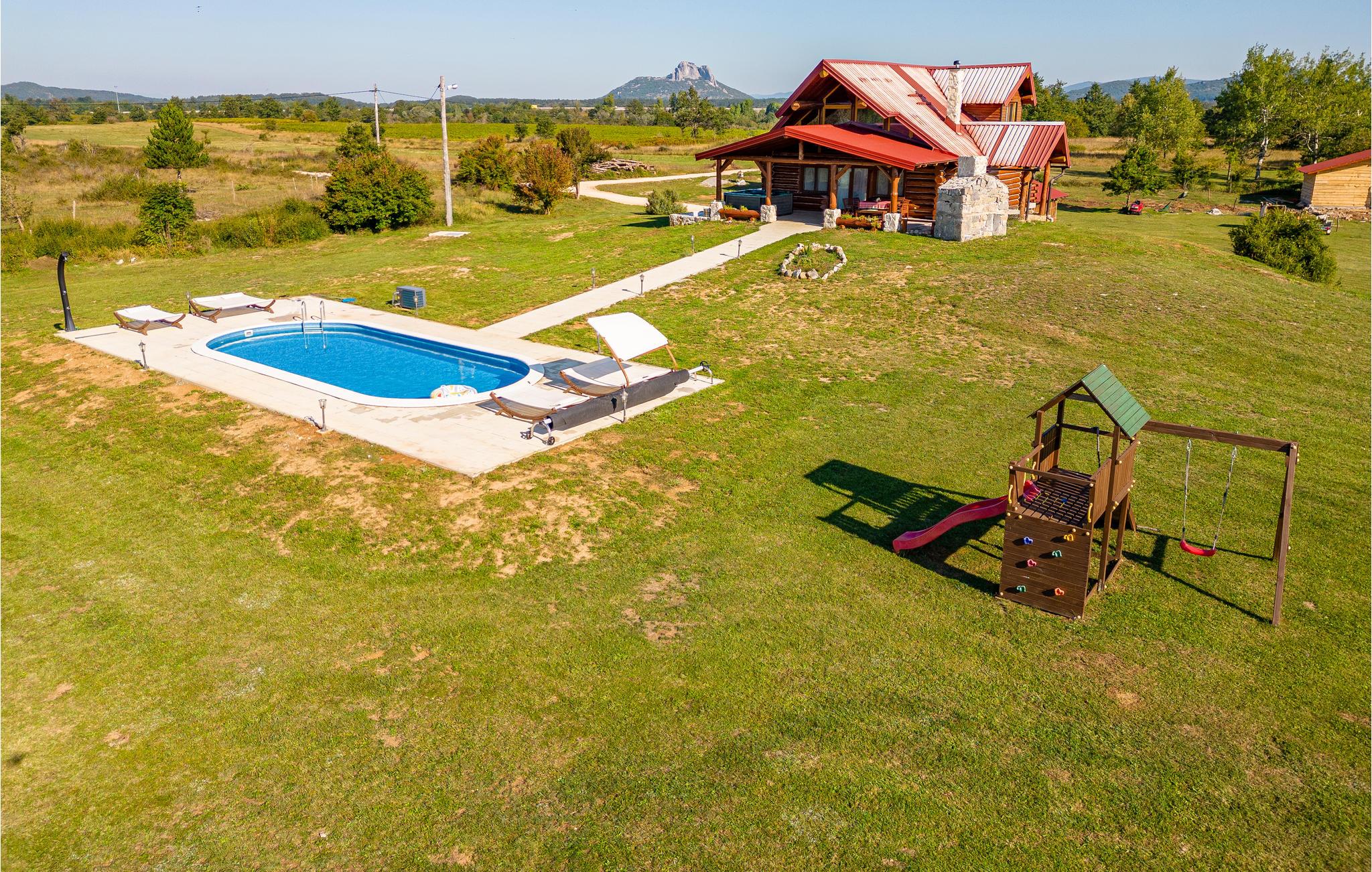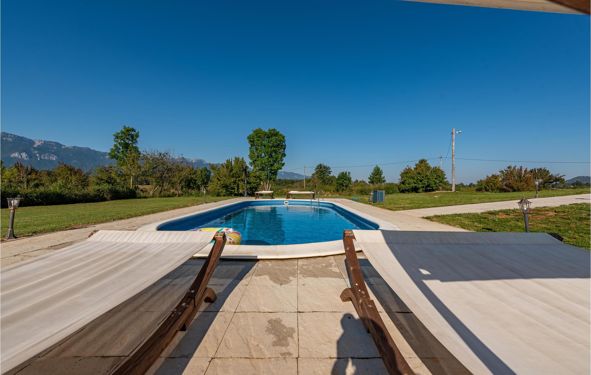 Udenfor inviterer den smukke terrasse med havemøbler og poolområdet med opvarmet pool dig til at tilbringe afslappende timer i den friske luft. Slap af med panoramaudsigt over bjergene, mens børnene leger på ejendommen eller plasker rundt i den smukke pool.