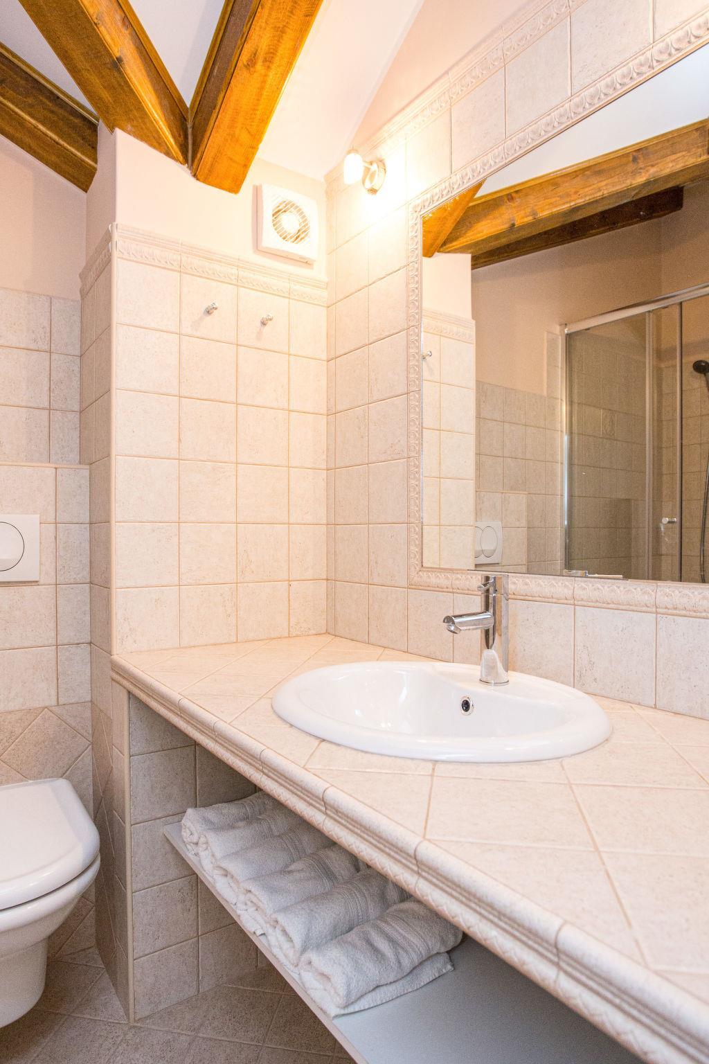 4-room semi-detached house 125 m2 on 2 levels, south facing position. Beautiful and tasteful furnishings: living/dining room with open-hearth fireplace (only for decoration), satellite TV (flat screen), air conditioning. Exit to the balcony. Open kitchen (oven, dishwasher, 4 induction hot plates, toaster, kettle, freezer, electric coffee machine). Exit to the garden. Sep. WC. Upper floor: with sloping ceilings, 3 rooms, ceiling height 170 - 210 cm, each room with 1 french bed (160 cm, length 200 cm), shower/WC and satellite TV (flat screen), air conditioning. Electric heating, forced-air heating. Balcony 13 m2. Terrace furniture, deck chairs (6). Panoramic view of the countryside. Facilities: Internet (WiFi, free). 1 small pet/ dog allowed. On the lower ground floor tavern (45 m2) with open fireplace and dinig table.