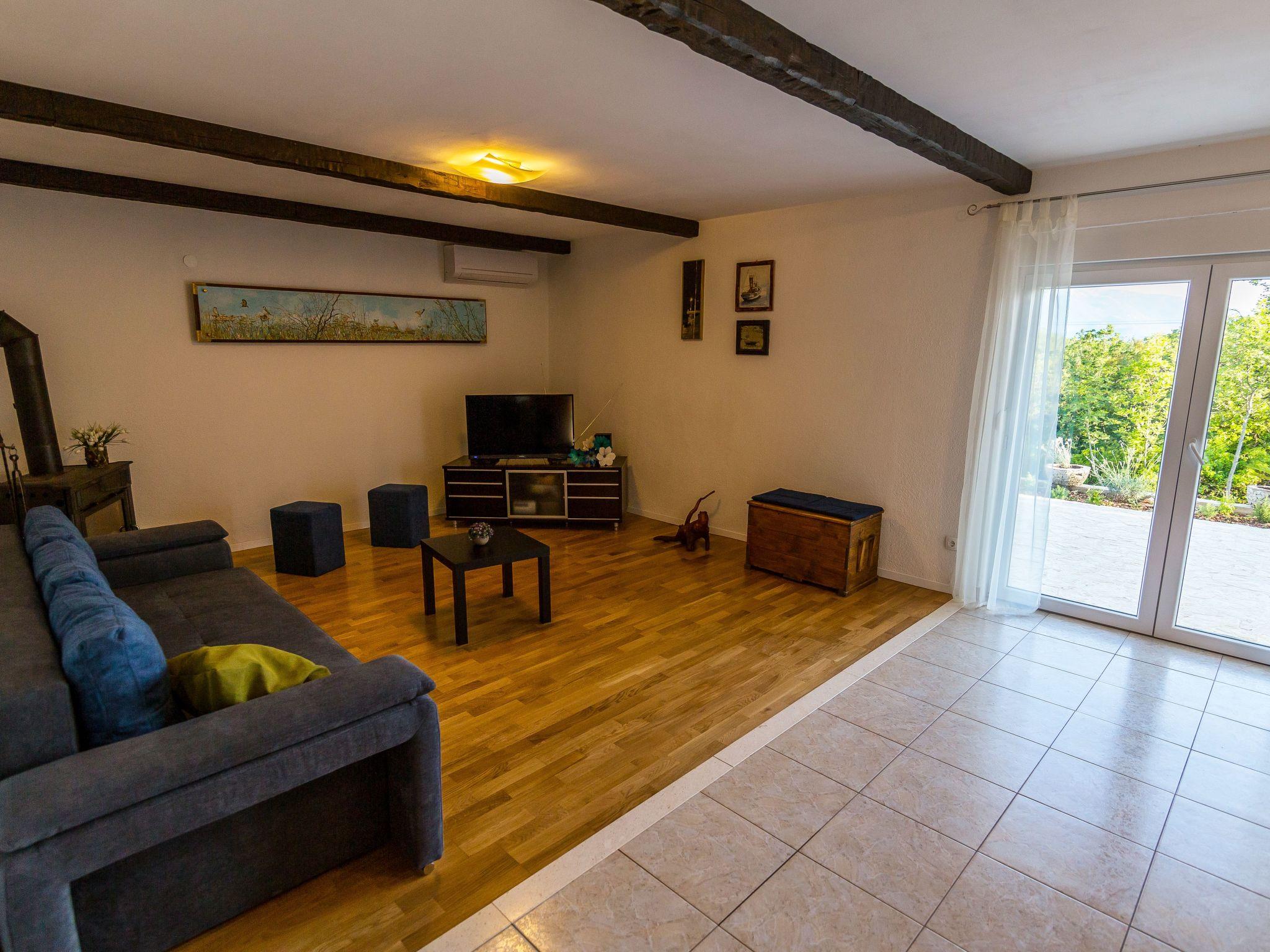 The tennis court is multifunctional and can also be used for mini football or basketball. The green areas around the house are mostly part of the property, so it’s not a problem if tennis or other balls end up there. The pool is private, spacious enough for a larger number of users, with heated water and an outdoor shower. The house is oriented north-south, with bedrooms on the north side and living areas on the south side.