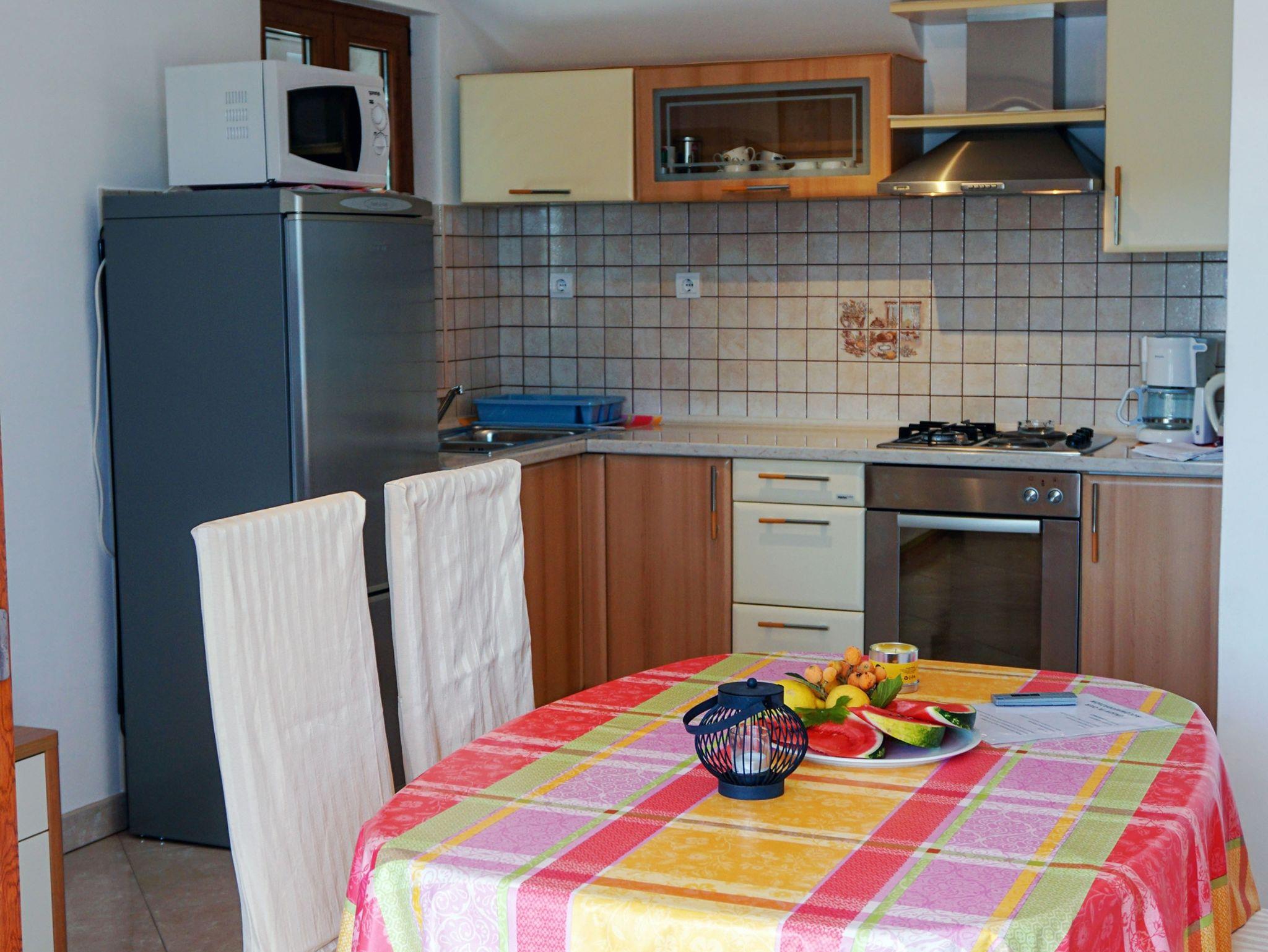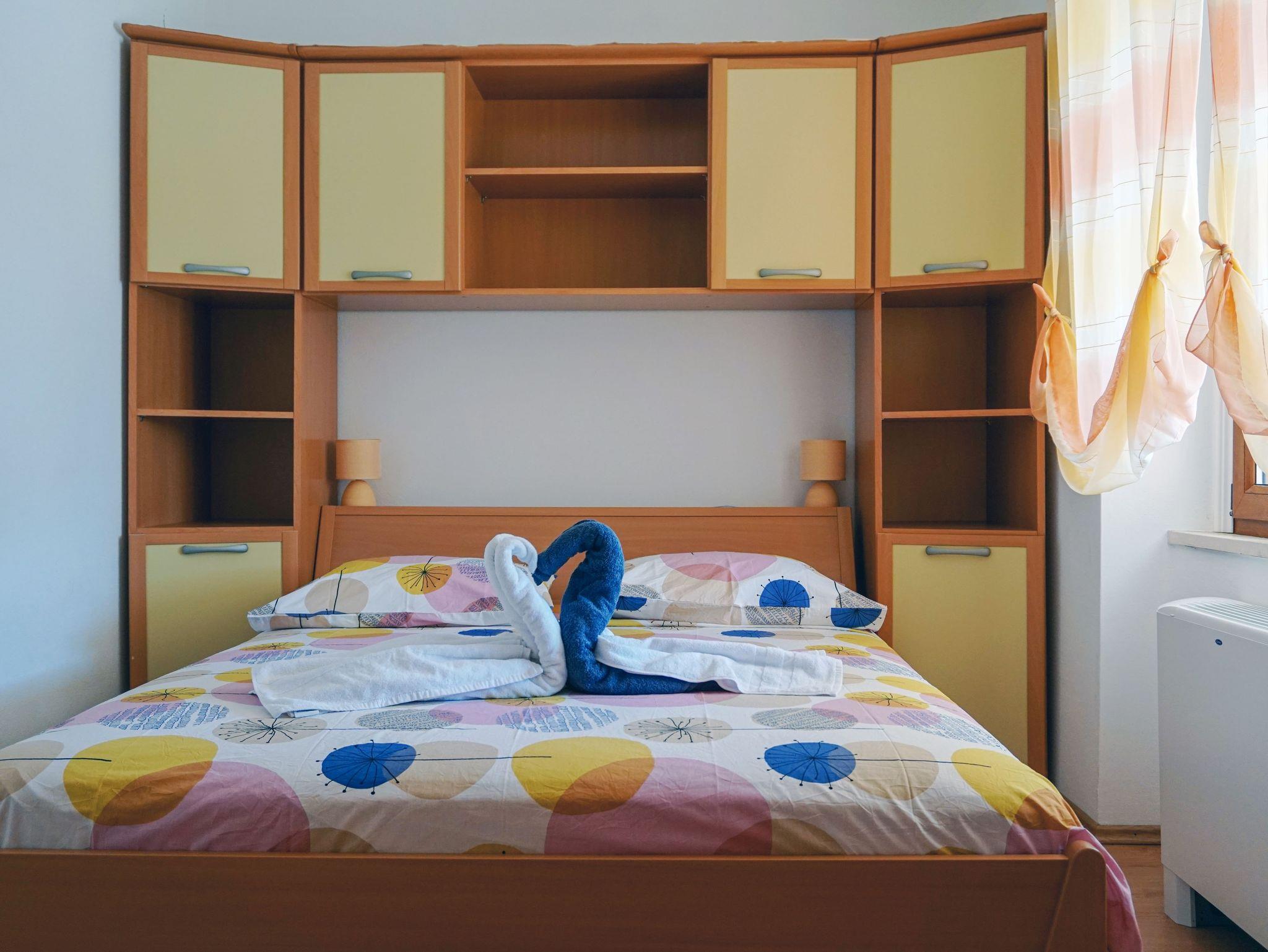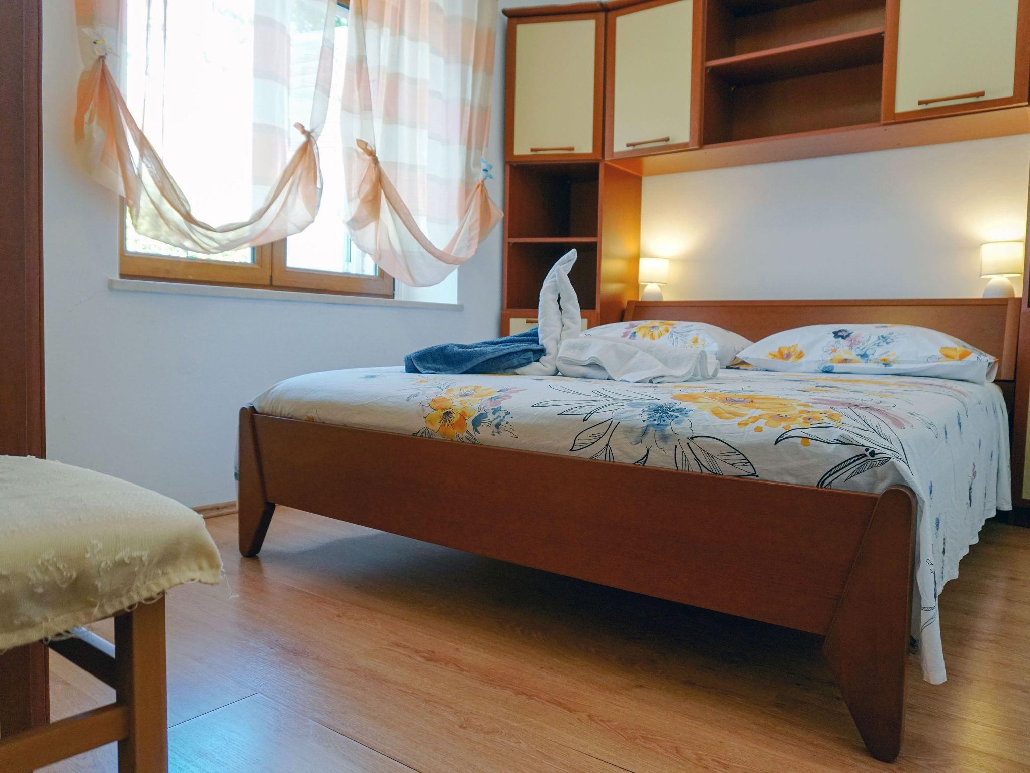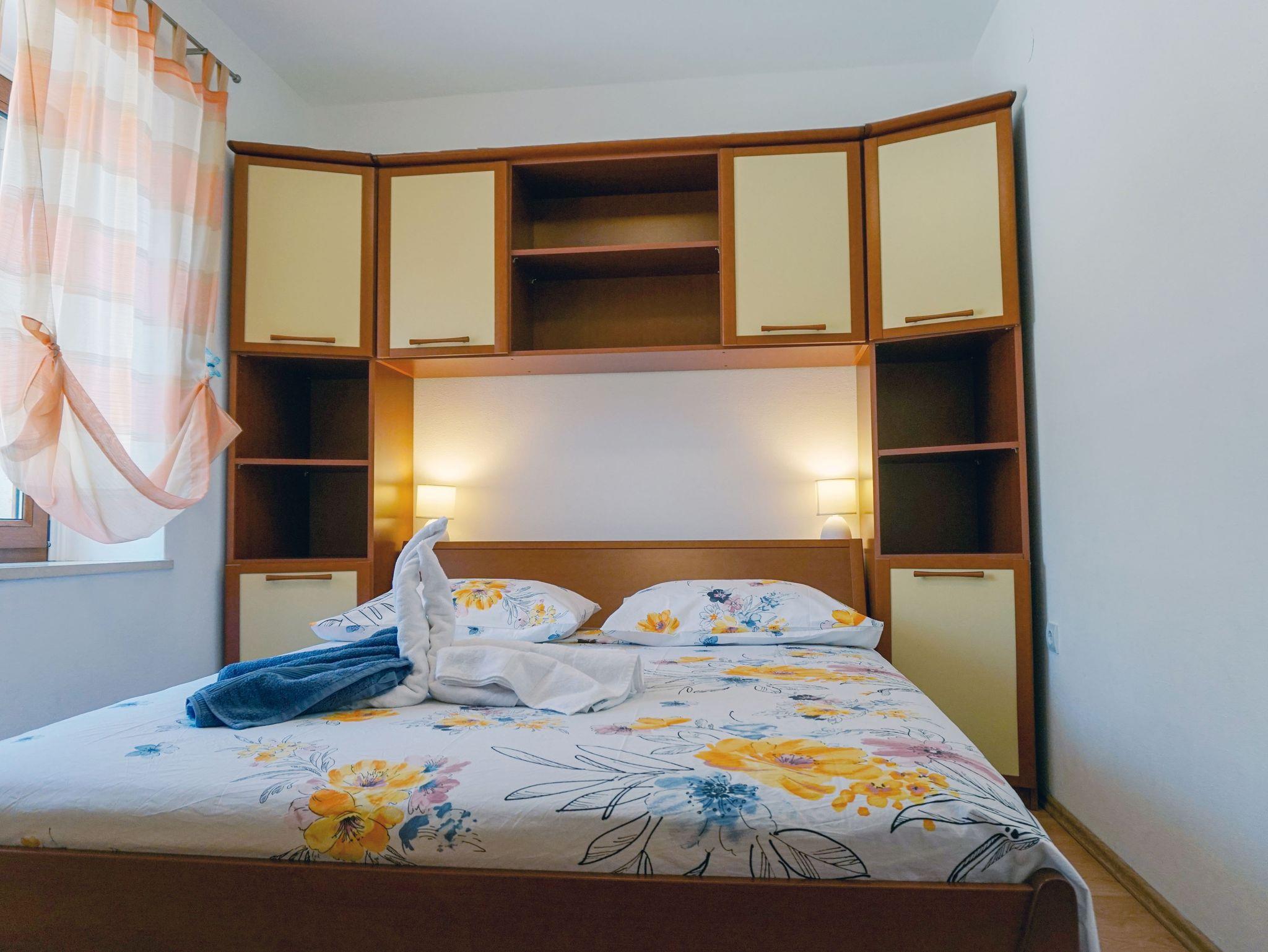 Ferienwohnung bietet Platz für 5 Gäste. Die Betten sind in Schlafzimmern, die es 2 gibt, und in Esszimmer, innerhalb einer Gesamtfläche von 52m2, angeordnet. Die Gäste haben eine eigene Terrasse zur Verfügung, auf der sie in warmen Sommernächten genießen können. Das Apartment bietet Meerblick. Es ist erlaubt, Speisen auf dem Gemeinschafts-Grill vorzubereiten. IM PREIS INBEGRIFFEN: Kurtaxe, Endreinigung, Klimatisierung, Zentralheizung, Parkplatz, Internet, Wäschewaschen, Bootsanlegeplatz, Kinderbett, Bügeleisen, Bügelbrett, Föhn. VERBINDLICHE ZUSÄTZLICHE KOSTEN: Aufzahlung für Kurzaufenthalte (prozentualer Zuschlag pro Nächtigungsanzahl: 30% - 1, 20% - 2, 10% - 3). UNVERBINDLICHE ZUSÄTZLICHE KOSTEN: Frühstück (10,00 €, 50% Nachlass für Kinder zwischen 4 und 12 Jahren, Kinder bis 4 Jahre sind frei.), Halbpension (30,00 €, 50% Nachlass für Kinder zwischen 4 und 12 Jahren, Kinder bis 4 Jahre sind frei.). Die Verfügbarkeit zusätzlicher Dienstleistungen in Ihrem reservierten Termin und die Preise derselben (falls nicht aufgeführt) müssen im Voraus überprüft werden. Zusätzliche Dienstleistungen die in der Zahlungsaufforderung nicht aufgeführt sind werden direkt beim Vermieter bezahlt, angenommen der Gast nutzt auch diese. Ermäßigung auf den Grundpreis: Gratistag 14=13 (bei einem Aufenthalt von 14 Tagen oder mehr erhalten Sie einen Gratistag für den Aufenthalt bis 31.12.26).
