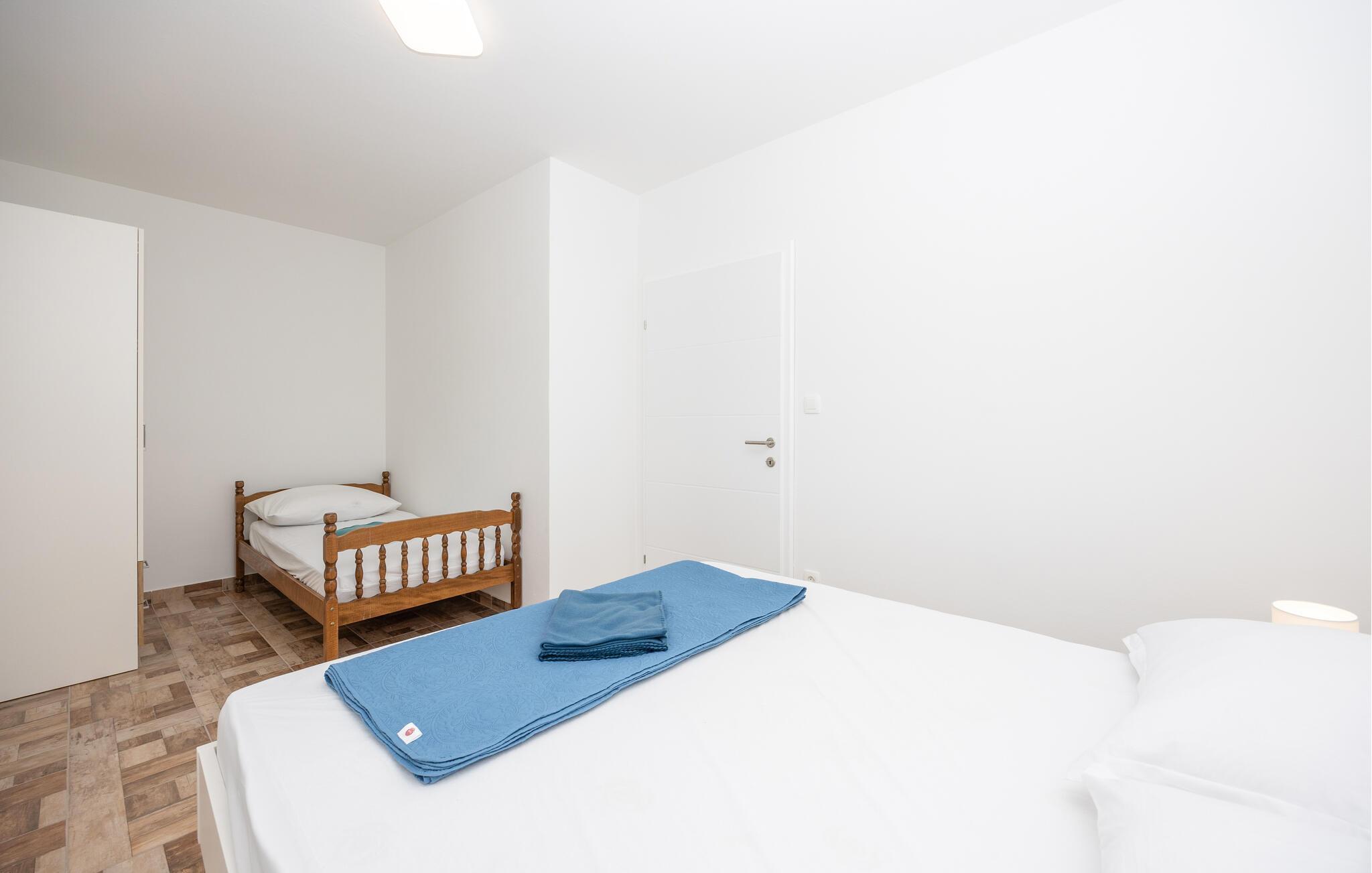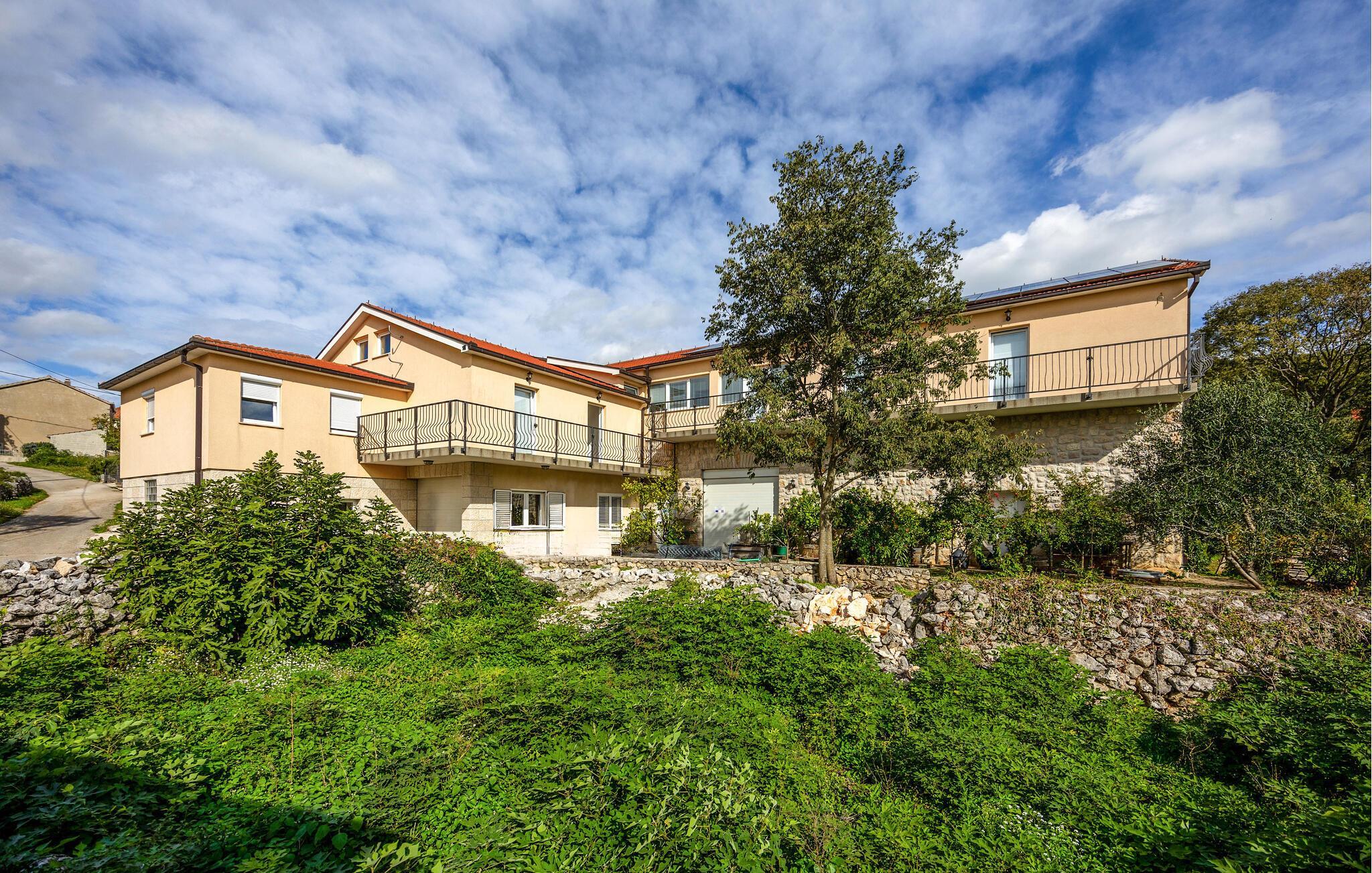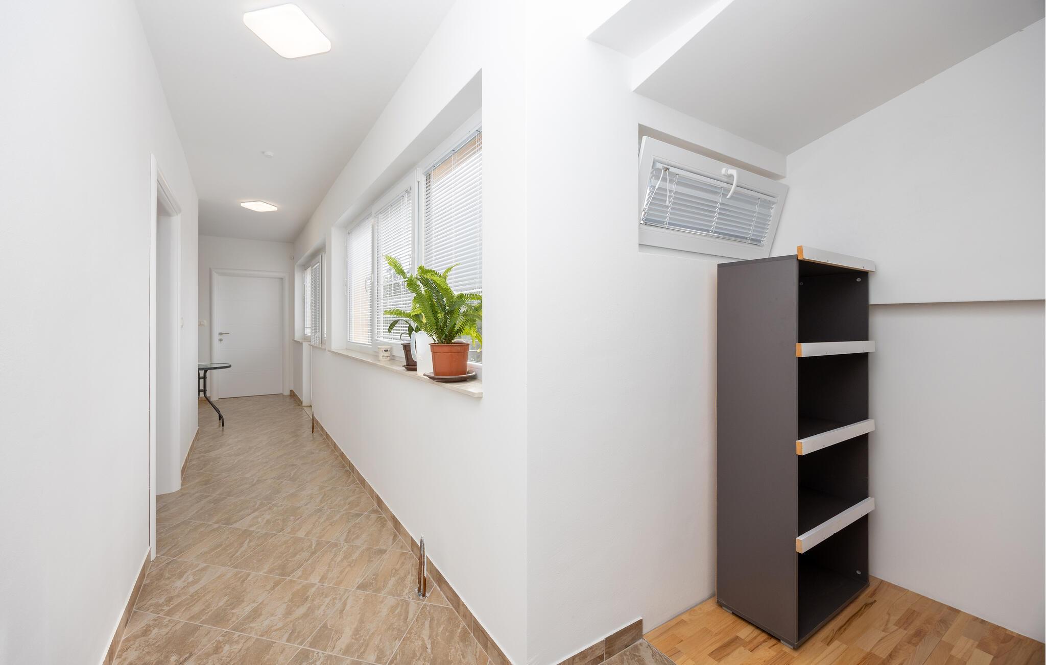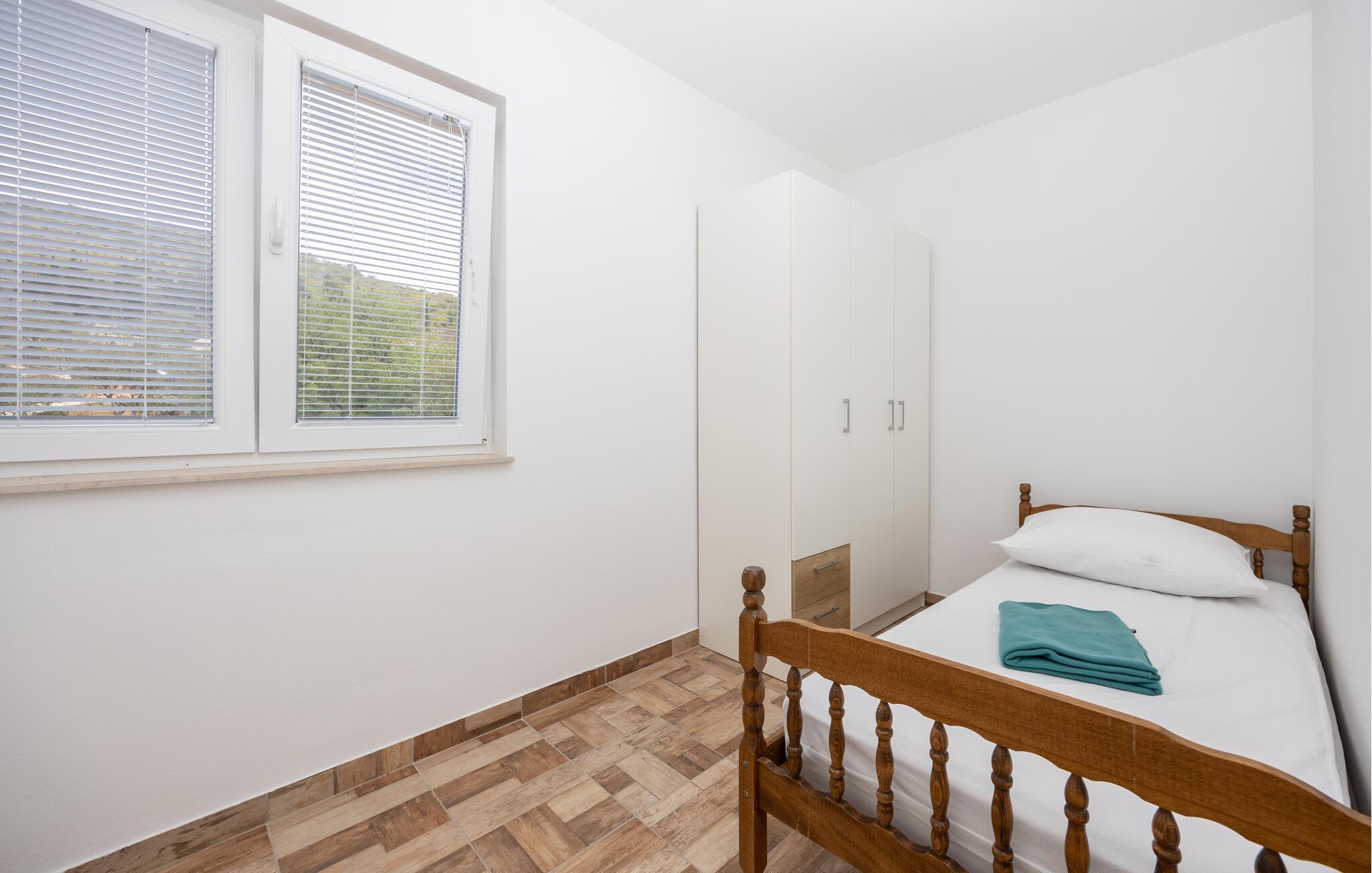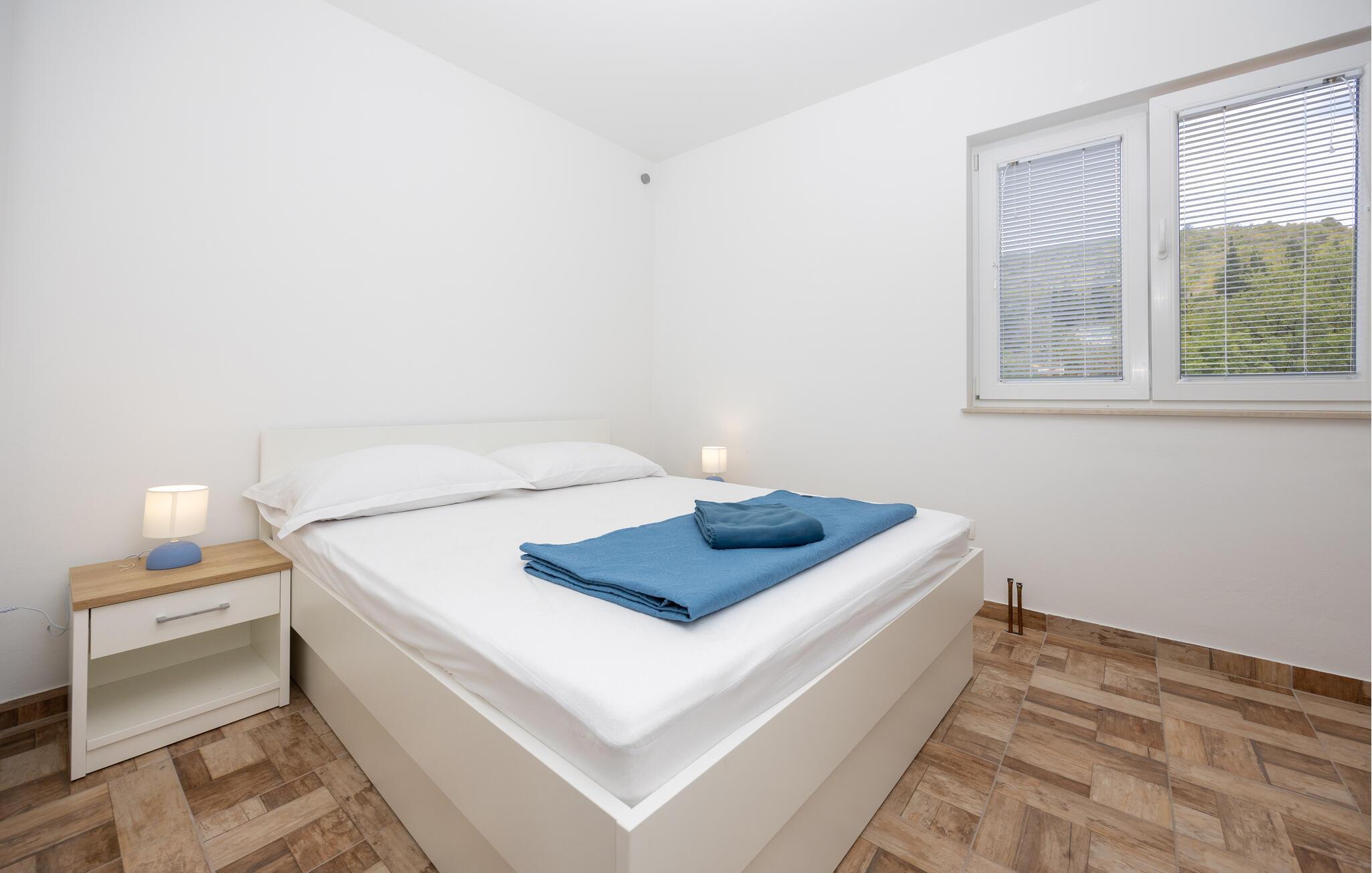 Denne ferielejlighed giver jer en særlig pause på en idyllisk grund omgivet af smuk natur. Den lyse og praktiske indretning samt det lysfyldte miljø skaber et behageligt fristed, hvor I kan nyde roen og slappe helt af. Balkonen med indgangsområde indbyder til afslappende stunder med et glas vin – prøv de lækre vine og lokale produkter direkte fra Rebic-vingården og oplev regionens autentiske charme.