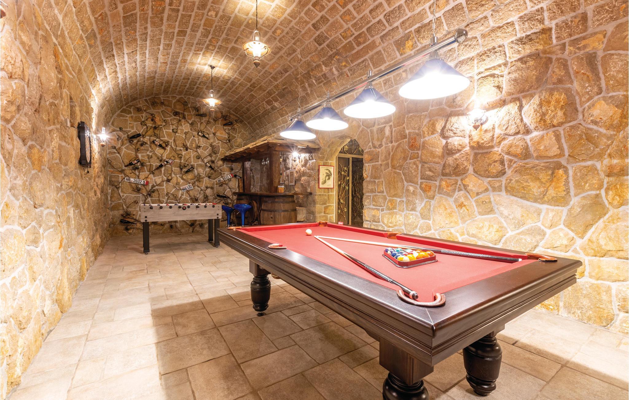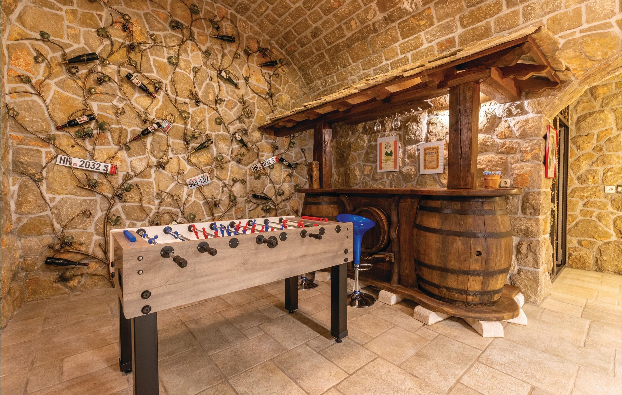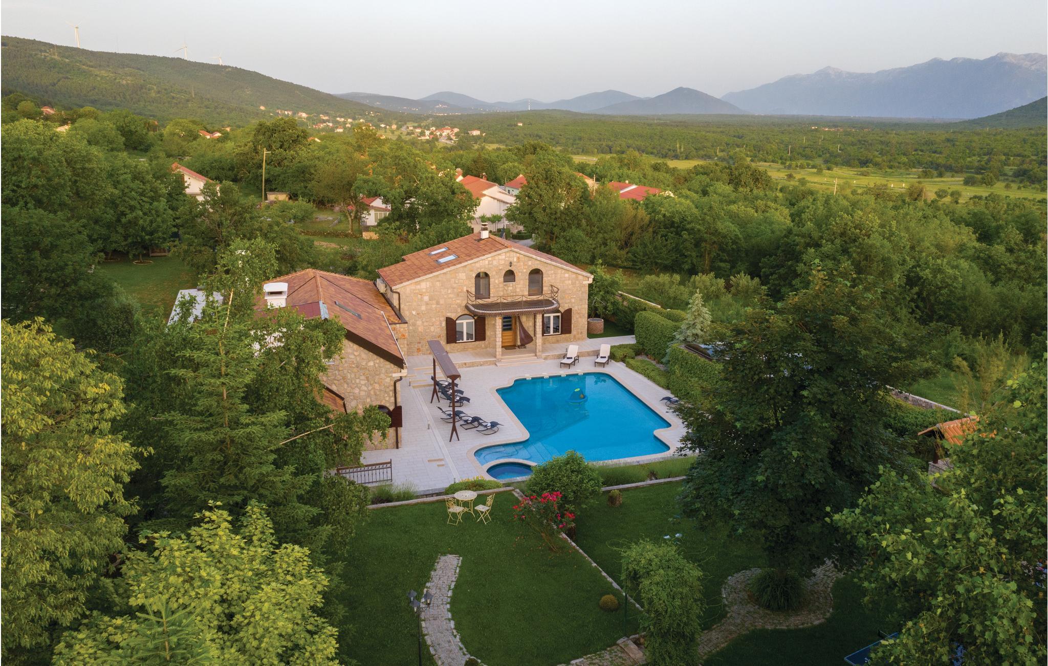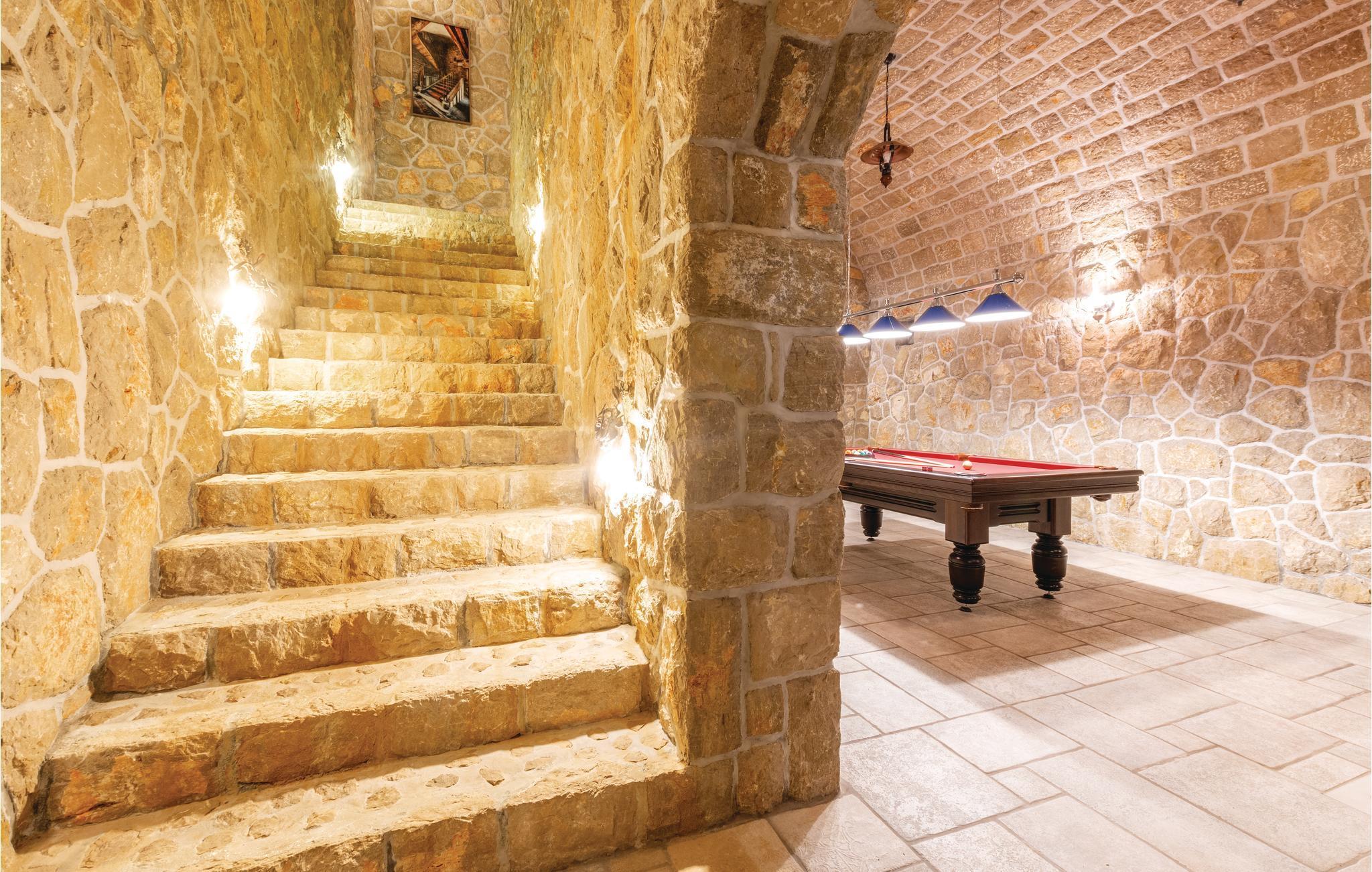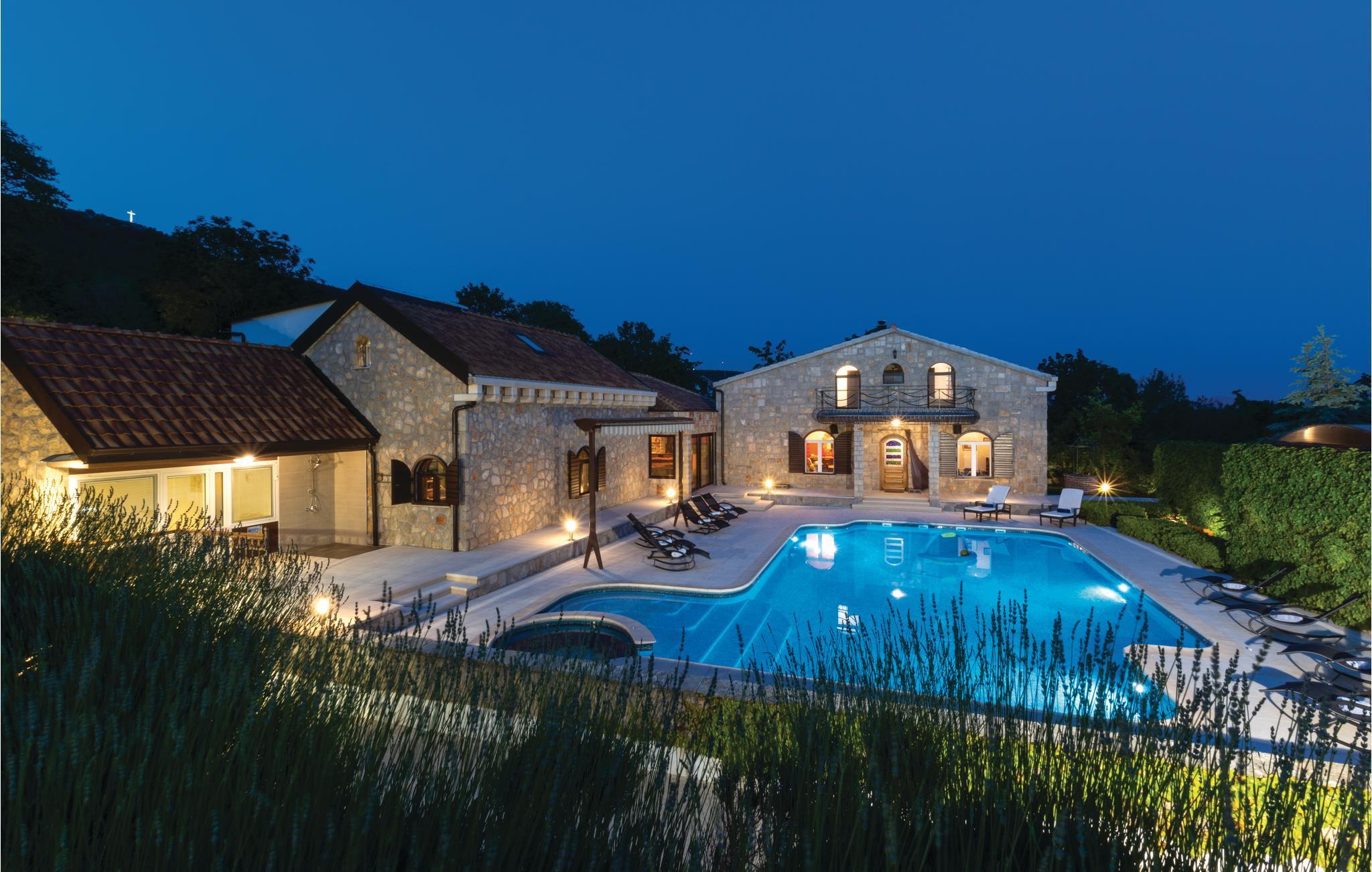 Denne luksuriøse og rummelige villa ligger i Dalmatiens fastland. Villaen er i bygget i en blanding af moderne og traditionel stil. Den moderne møblerede stue, spisestue og køkken fordeler sig på over 100 kvadratmeter. En vindeltrappe fører op til den øverste etage med tre soveværelser. Fra terrassen er der en dejlig udsigt over de rolige omgivelser i haven, petanque-bane og swimming pool med jacuzzi. Poolen er stor, her kan I tage et en god svømmetur og få løsnet det ømme muskler. Mod betaling kan du smage de fine vine i vinkælderen, ejer giver gerne en forklaring om hvad det er flaskerne indeholder. Efter aftale og mod betaling kan udlejeren arrangere en traditionel middag. På en halv times kørsel i bil kan I nå de smukke strande i Omis eller Makarska. Fra den gamle borg i Omis, er der en fantastisk udsigt over den gamle by og havet. Bestemt et besøg værd! Soveværelse nr 5 har separat indgang. Der er flere underholdende spil I kan benytte her.