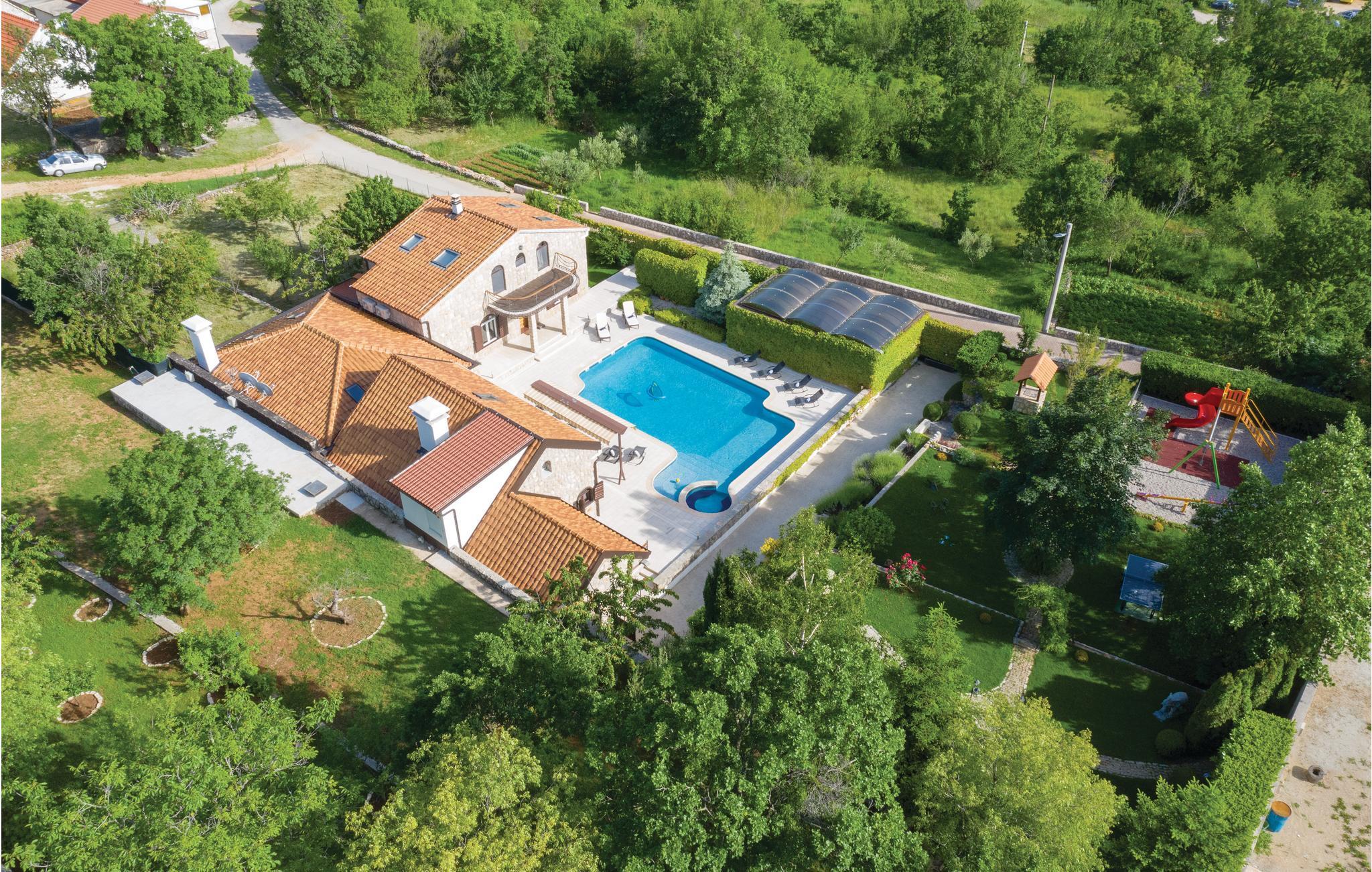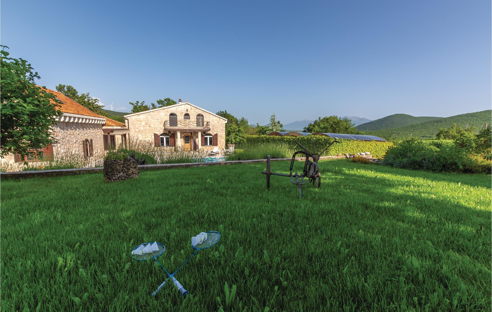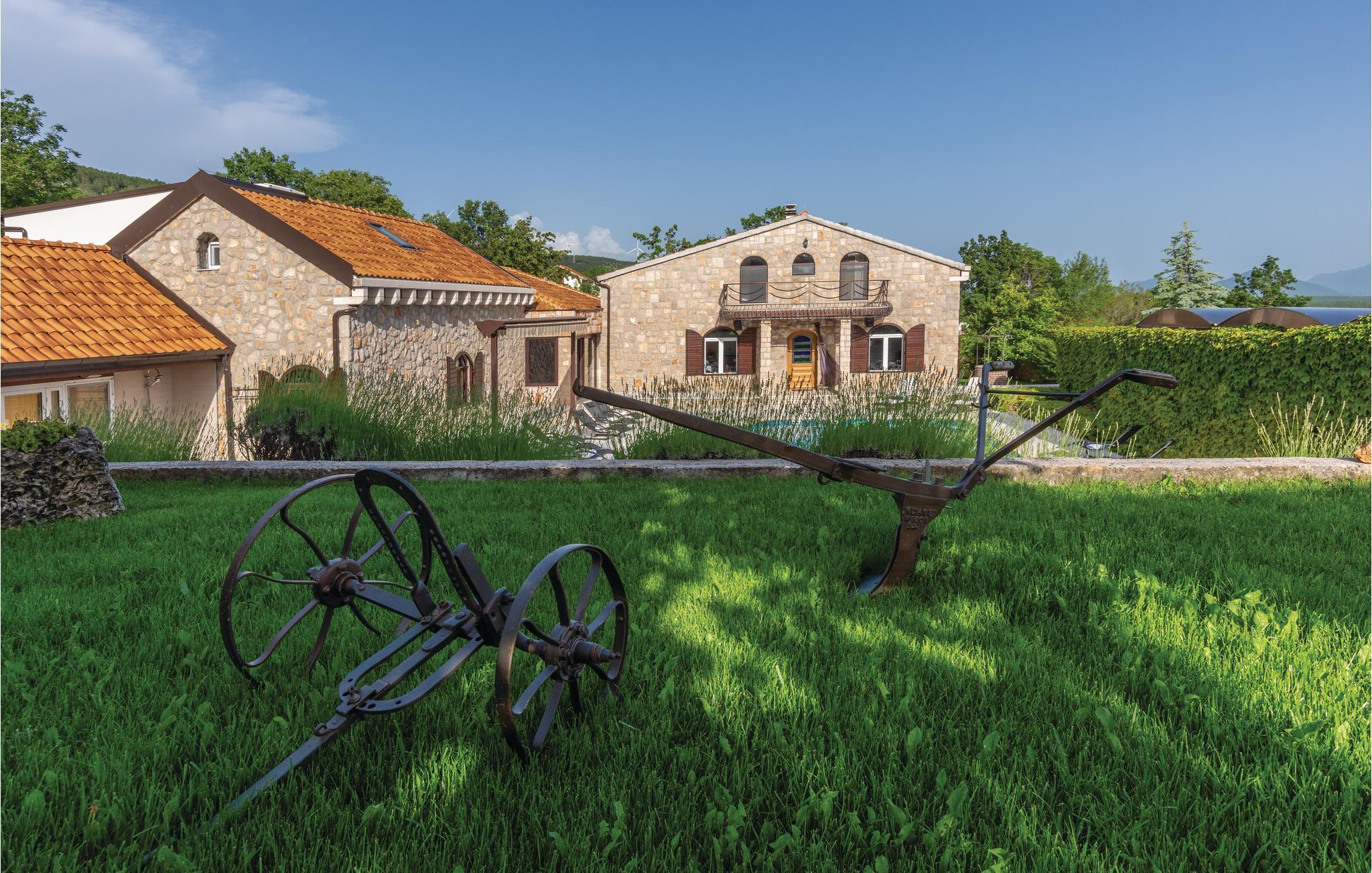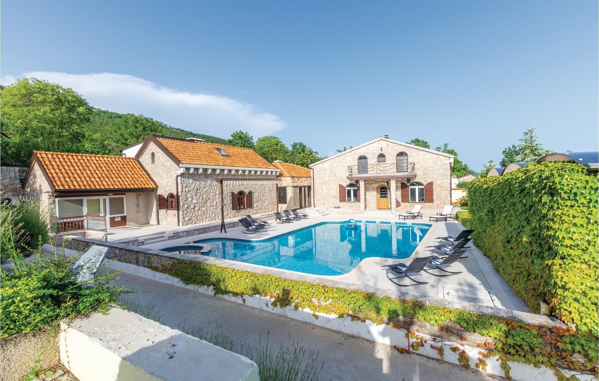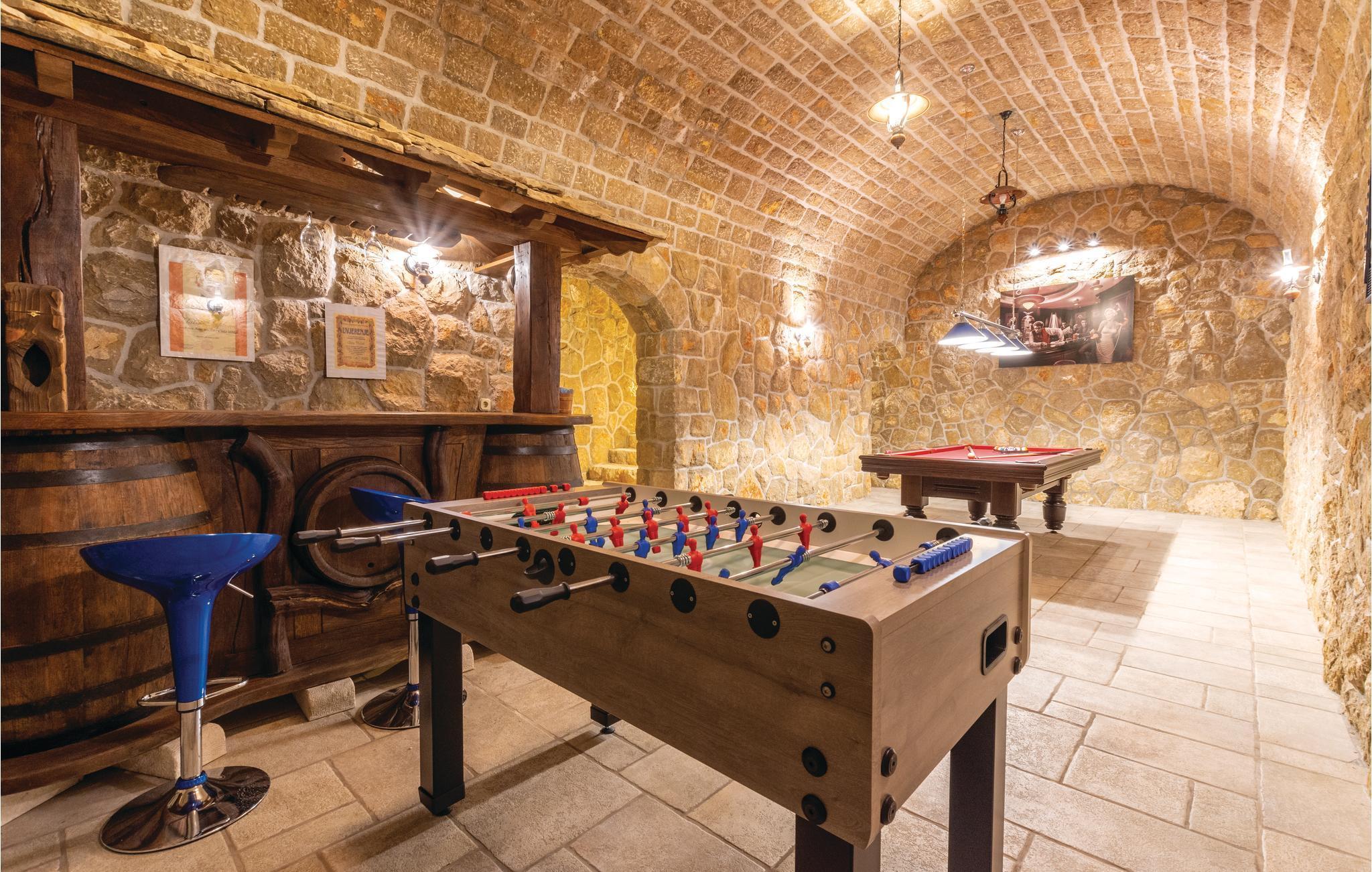 Denne luksuriøse og rummelige villa ligger i Dalmatiens fastland. Villaen er i bygget i en blanding af moderne og traditionel stil. Den moderne møblerede stue, spisestue og køkken fordeler sig på over 100 kvadratmeter. En vindeltrappe fører op til den øverste etage med tre soveværelser. Fra terrassen er der en dejlig udsigt over de rolige omgivelser i haven, petanque-bane og swimming pool med jacuzzi. Poolen er stor, her kan I tage et en god svømmetur og få løsnet det ømme muskler. Mod betaling kan du smage de fine vine i vinkælderen, ejer giver gerne en forklaring om hvad det er flaskerne indeholder. Efter aftale og mod betaling kan udlejeren arrangere en traditionel middag. På en halv times kørsel i bil kan I nå de smukke strande i Omis eller Makarska. Fra den gamle borg i Omis, er der en fantastisk udsigt over den gamle by og havet. Bestemt et besøg værd! Soveværelse nr 5 har separat indgang. Der er flere underholdende spil I kan benytte her.