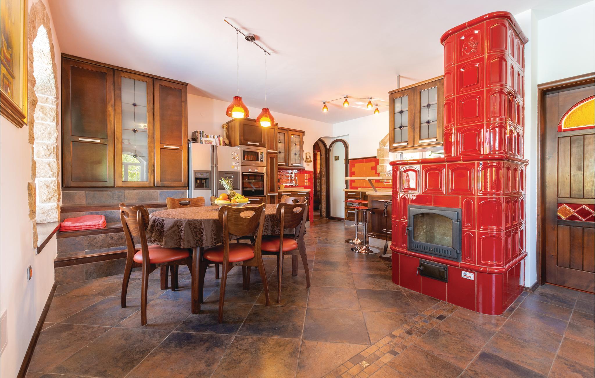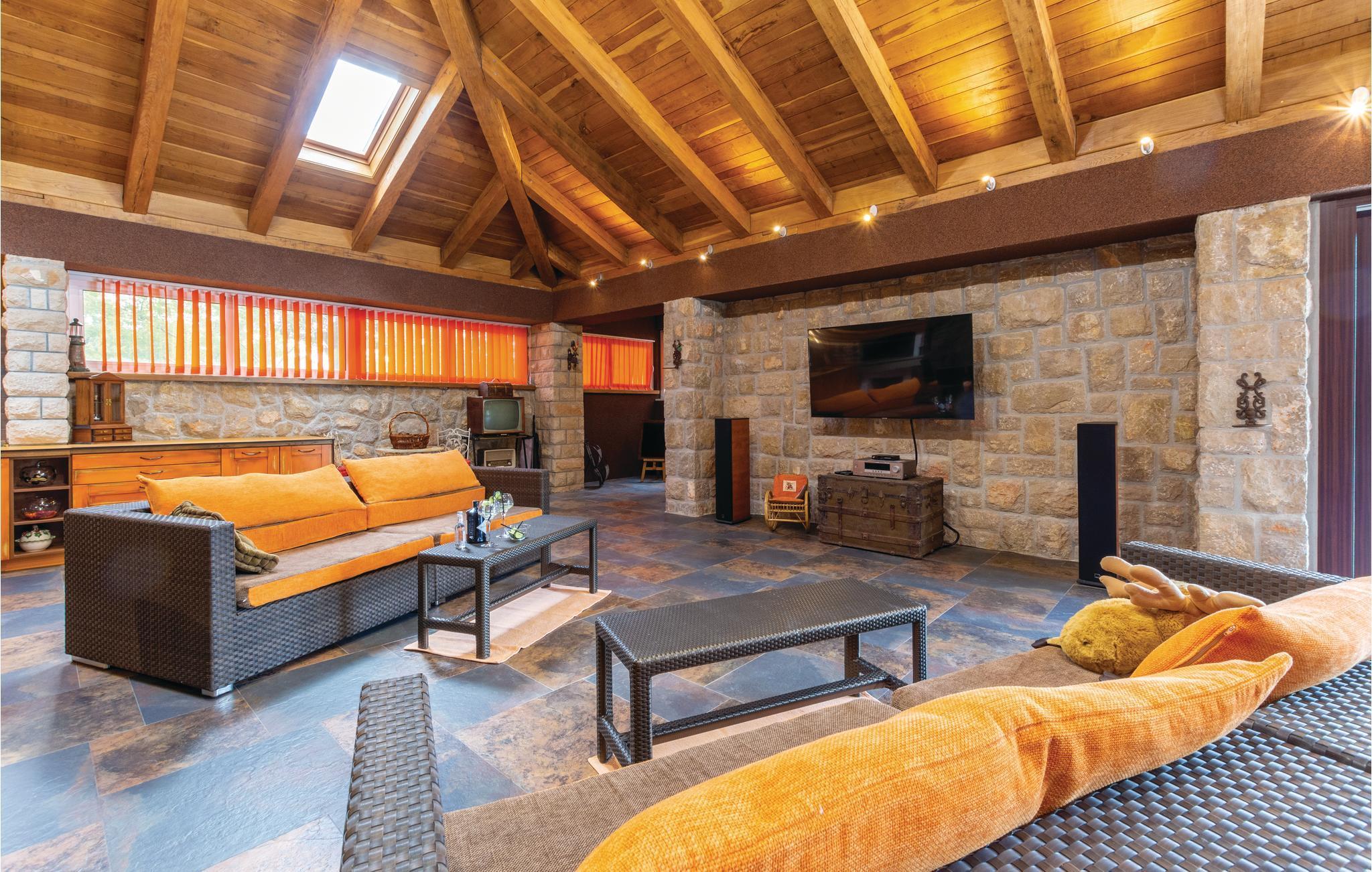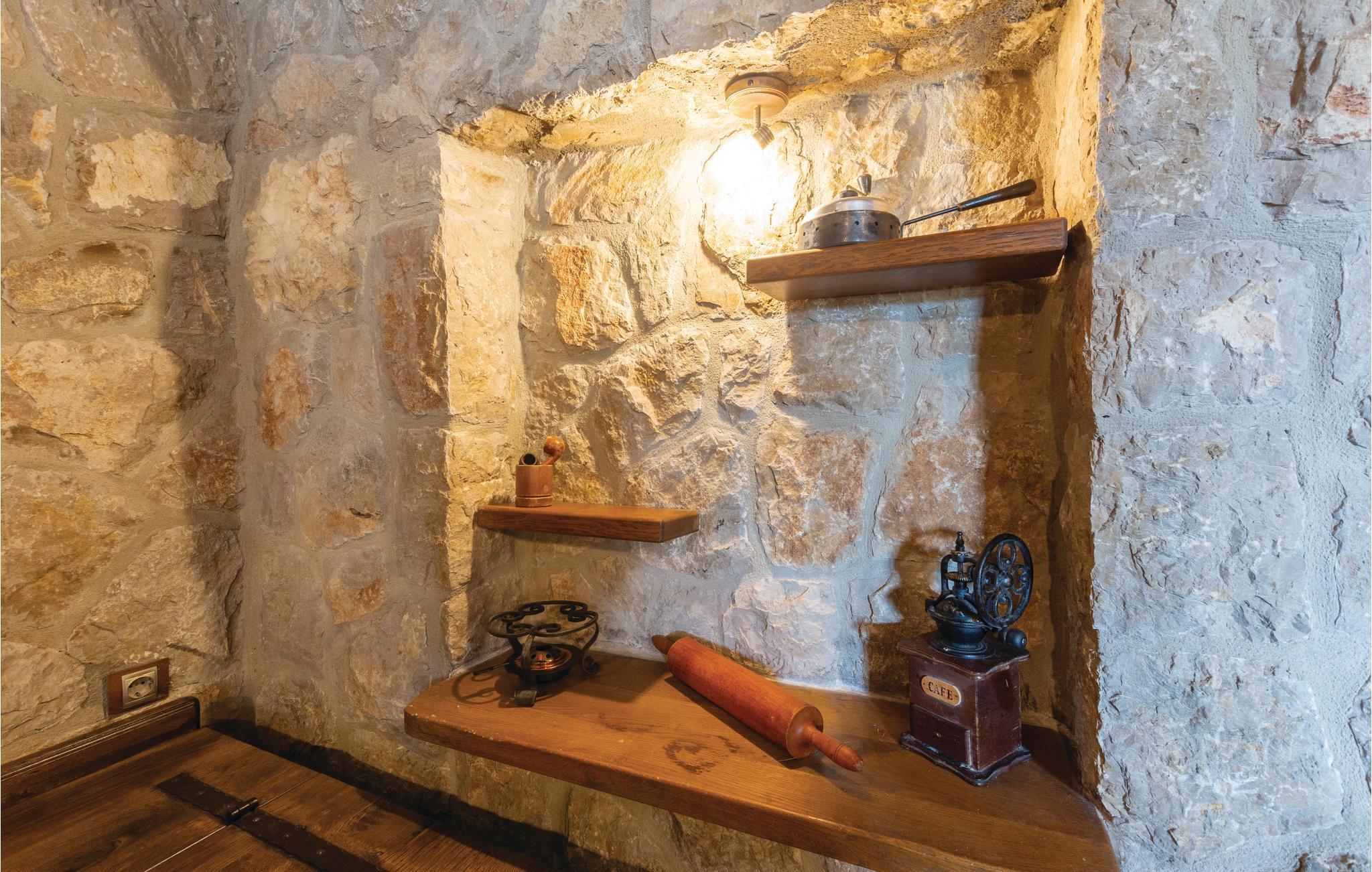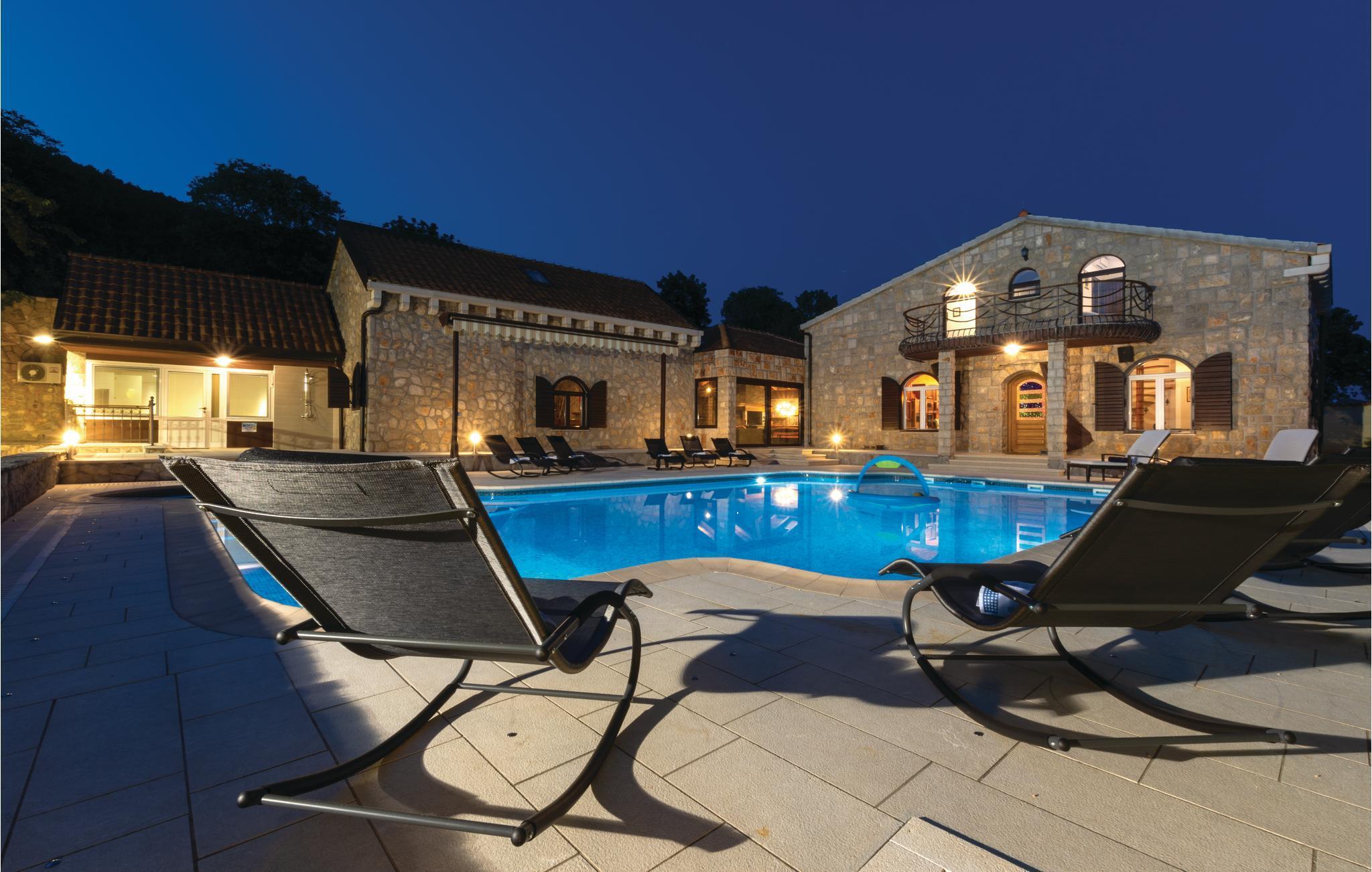 Denne luksuriøse og rummelige villa ligger i Dalmatiens fastland. Villaen er i bygget i en blanding af moderne og traditionel stil. Den moderne møblerede stue, spisestue og køkken fordeler sig på over 100 kvadratmeter. En vindeltrappe fører op til den øverste etage med tre soveværelser. Fra terrassen er der en dejlig udsigt over de rolige omgivelser i haven, petanque-bane og swimming pool med jacuzzi. Poolen er stor, her kan I tage et en god svømmetur og få løsnet det ømme muskler. Mod betaling kan du smage de fine vine i vinkælderen, ejer giver gerne en forklaring om hvad det er flaskerne indeholder. Efter aftale og mod betaling kan udlejeren arrangere en traditionel middag. På en halv times kørsel i bil kan I nå de smukke strande i Omis eller Makarska. Fra den gamle borg i Omis, er der en fantastisk udsigt over den gamle by og havet. Bestemt et besøg værd! Soveværelse nr 5 har separat indgang. Der er flere underholdende spil I kan benytte her.