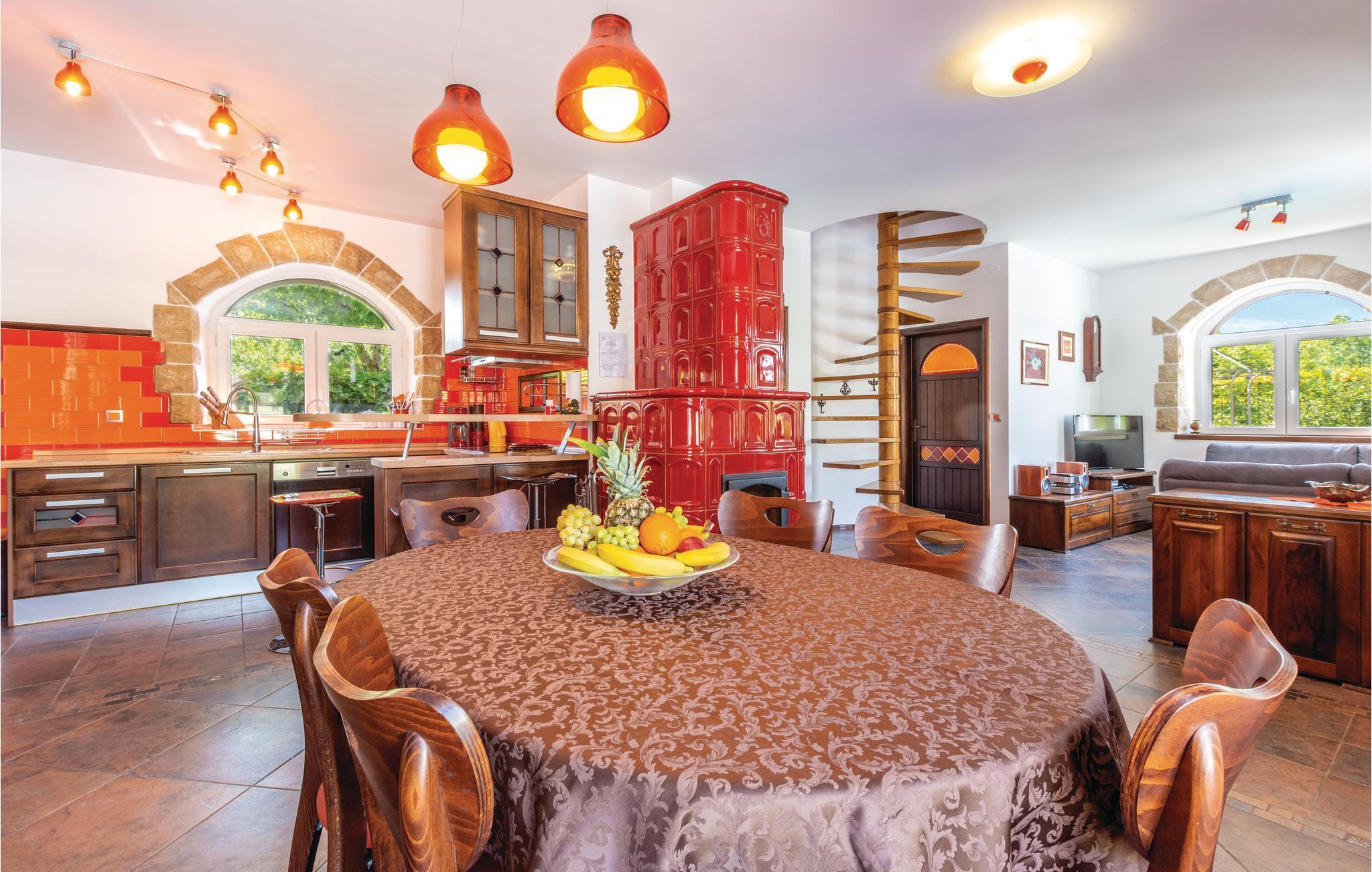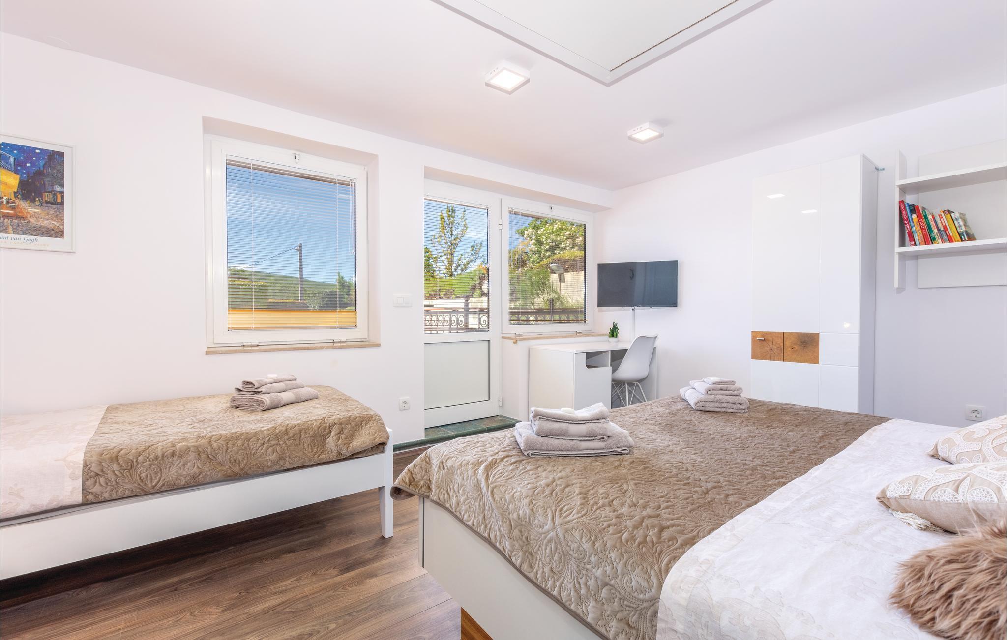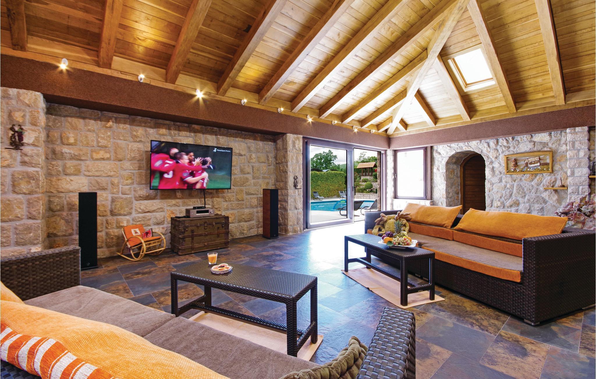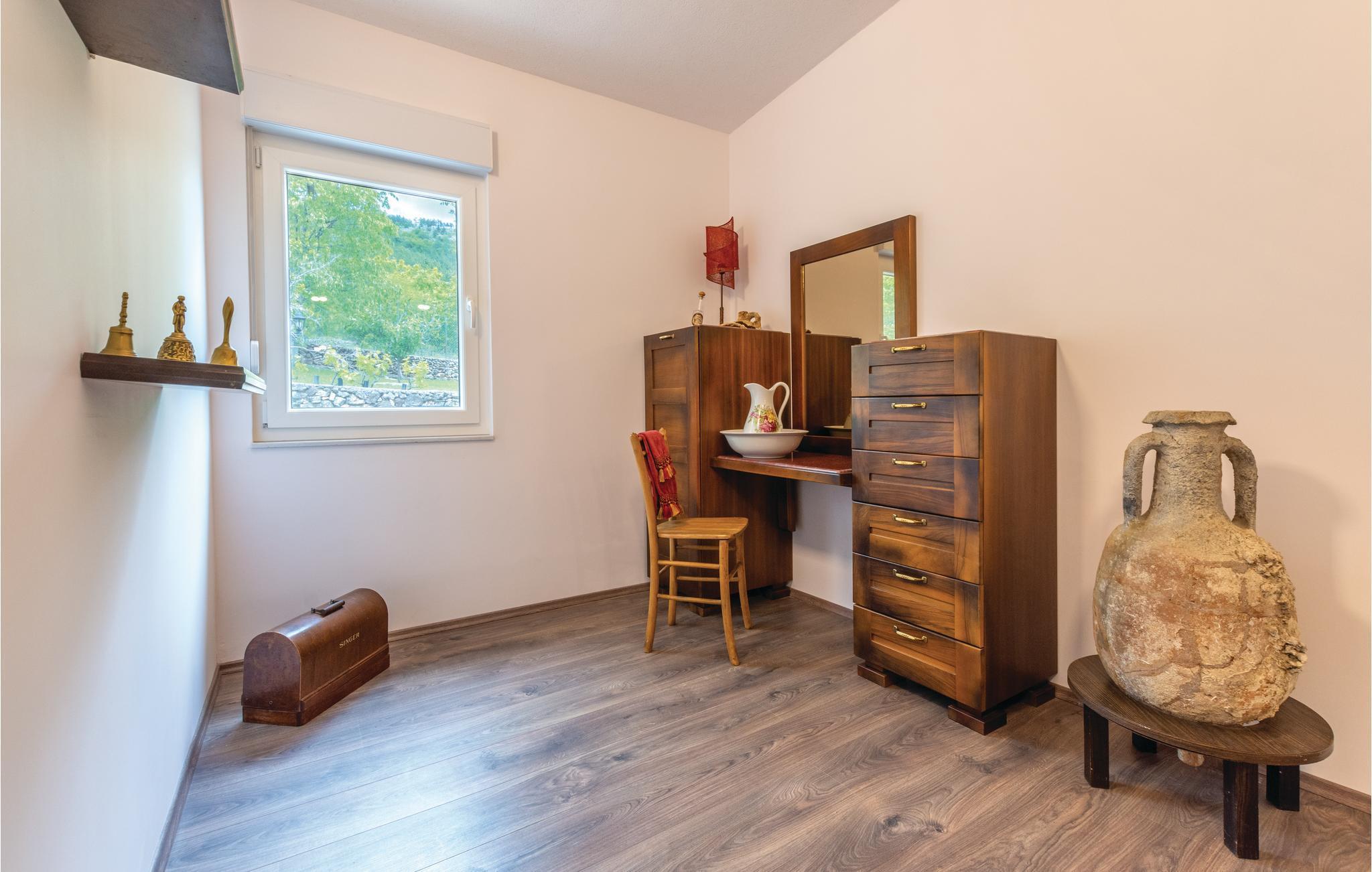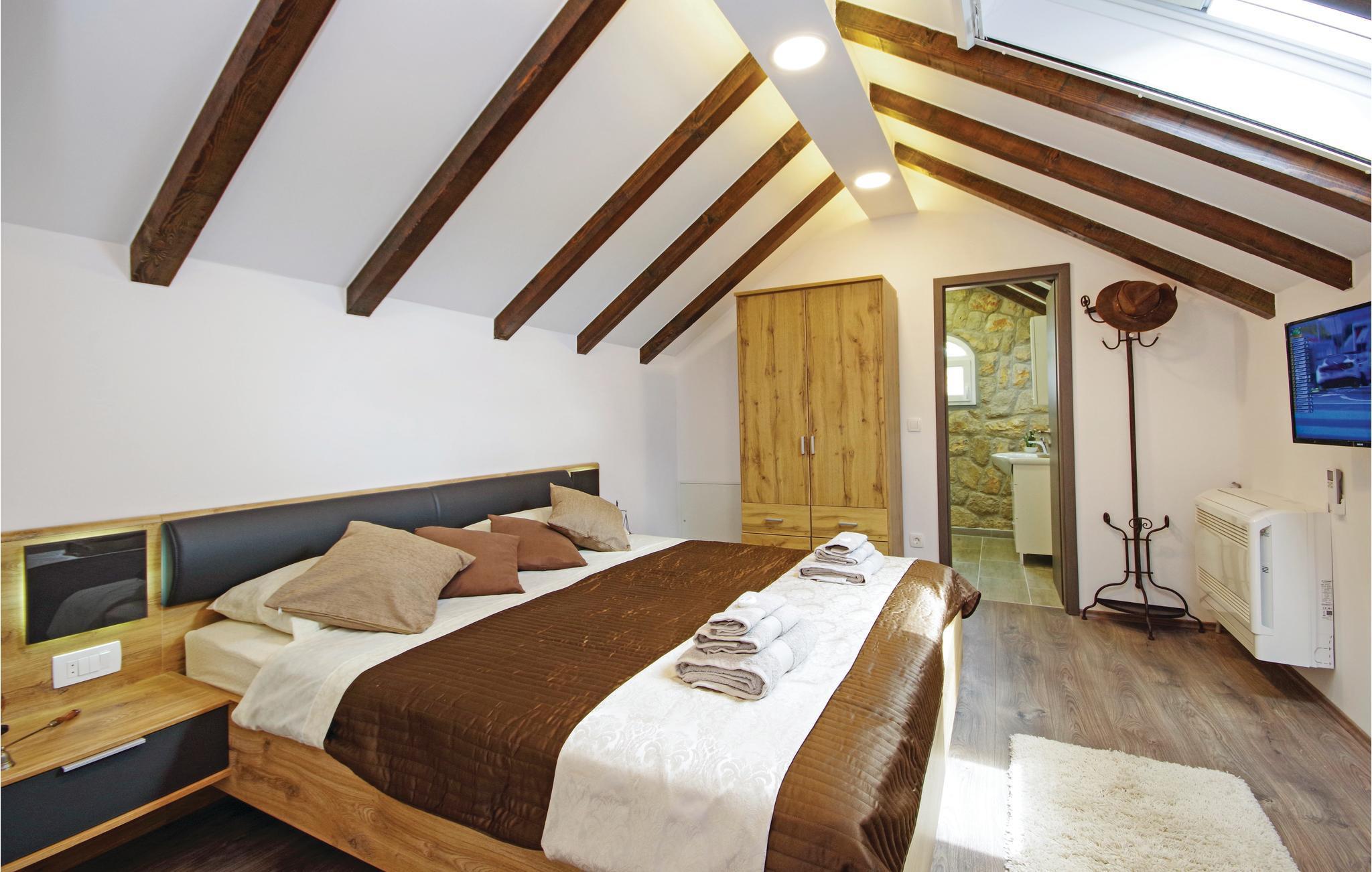 Denne luksuriøse og rummelige villa ligger i Dalmatiens fastland. Villaen er i bygget i en blanding af moderne og traditionel stil. Den moderne møblerede stue, spisestue og køkken fordeler sig på over 100 kvadratmeter. En vindeltrappe fører op til den øverste etage med tre soveværelser. Fra terrassen er der en dejlig udsigt over de rolige omgivelser i haven, petanque-bane og swimming pool med jacuzzi. Poolen er stor, her kan I tage et en god svømmetur og få løsnet det ømme muskler. Mod betaling kan du smage de fine vine i vinkælderen, ejer giver gerne en forklaring om hvad det er flaskerne indeholder. Efter aftale og mod betaling kan udlejeren arrangere en traditionel middag. På en halv times kørsel i bil kan I nå de smukke strande i Omis eller Makarska. Fra den gamle borg i Omis, er der en fantastisk udsigt over den gamle by og havet. Bestemt et besøg værd! Soveværelse nr 5 har separat indgang. Der er flere underholdende spil I kan benytte her.