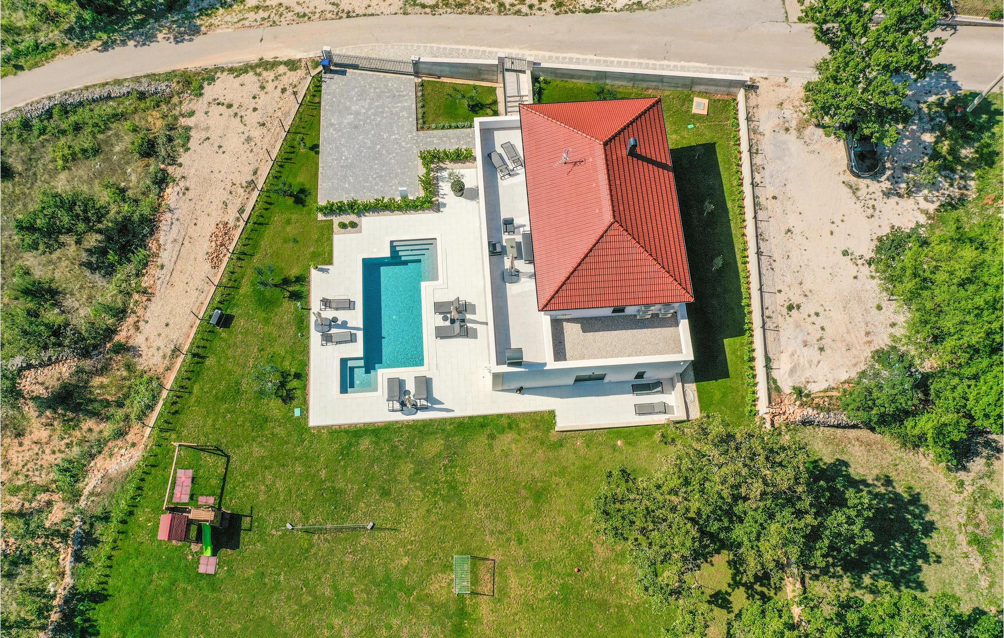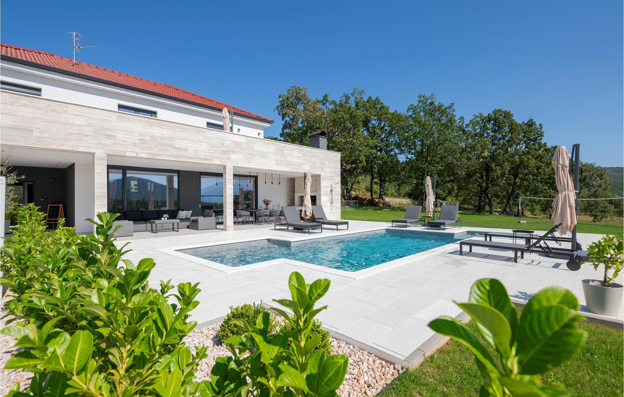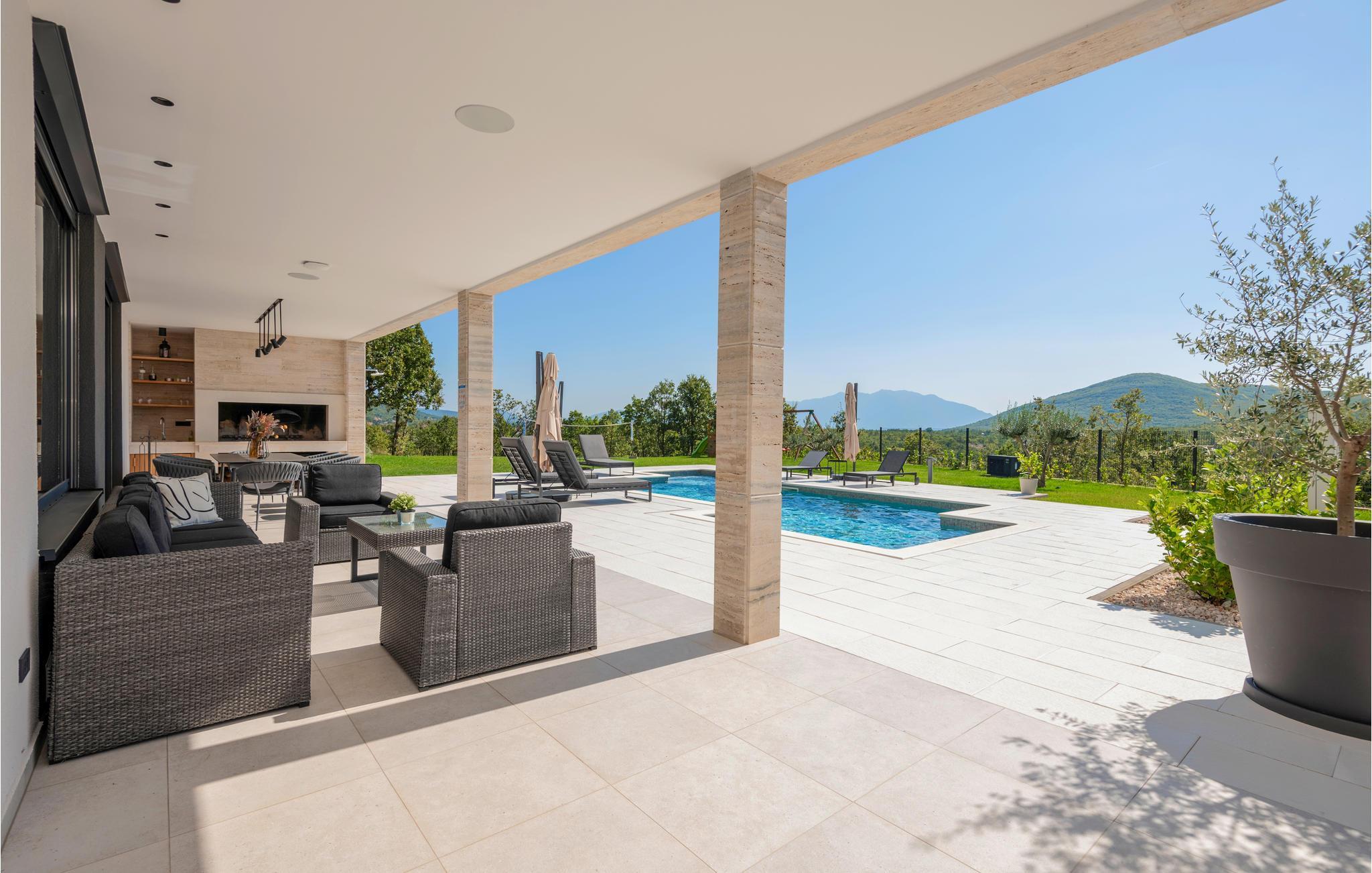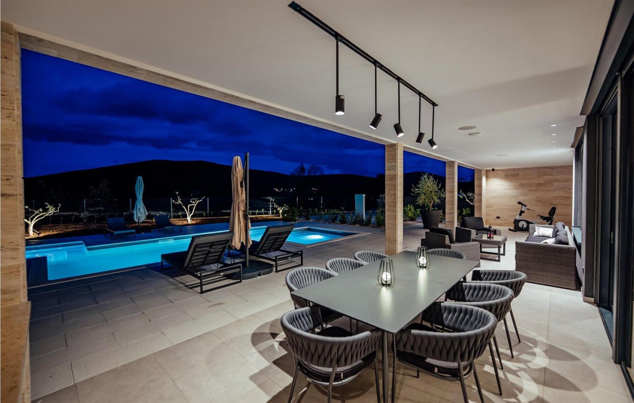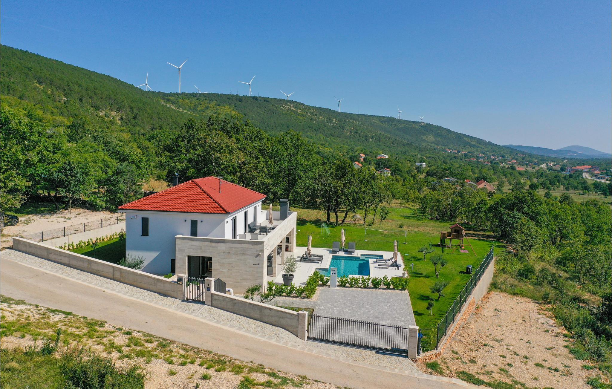 Det børnevenlige og komfortable hus byder jer velkommen med en fantastisk beliggenhed bag den dalmatiske kyst, og her kommer I ikke til at mangle noget. Noget af det første, I vil lægge mærke til, er udsigten over det maleriske landskab gennem de store panoramavinduer. Den stilfulde atmosfære indgyder ren afslapning, og efter en behagelig massage i boblebadet og en tur i saunaen kan I sætte jer godt til rette ved pejsen og sludre til sent ud på aftenen. Her har I valget mellem flere terrasser, hvor I kan nyde solen og den smukke udsigt. Se jeres børn lege på den store grund og saml hele familien om aftenen til et lækkert måltid fra grillen.
