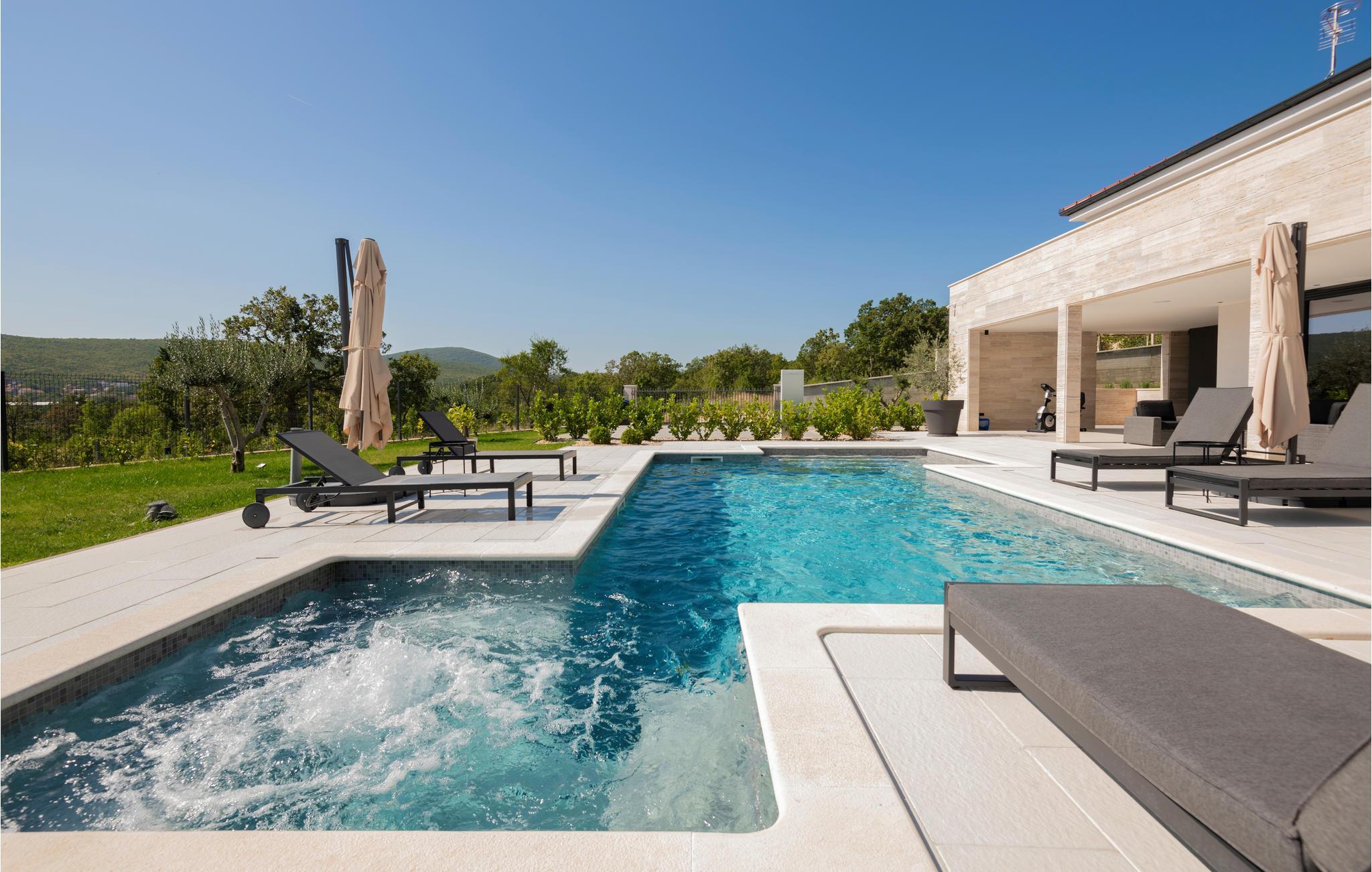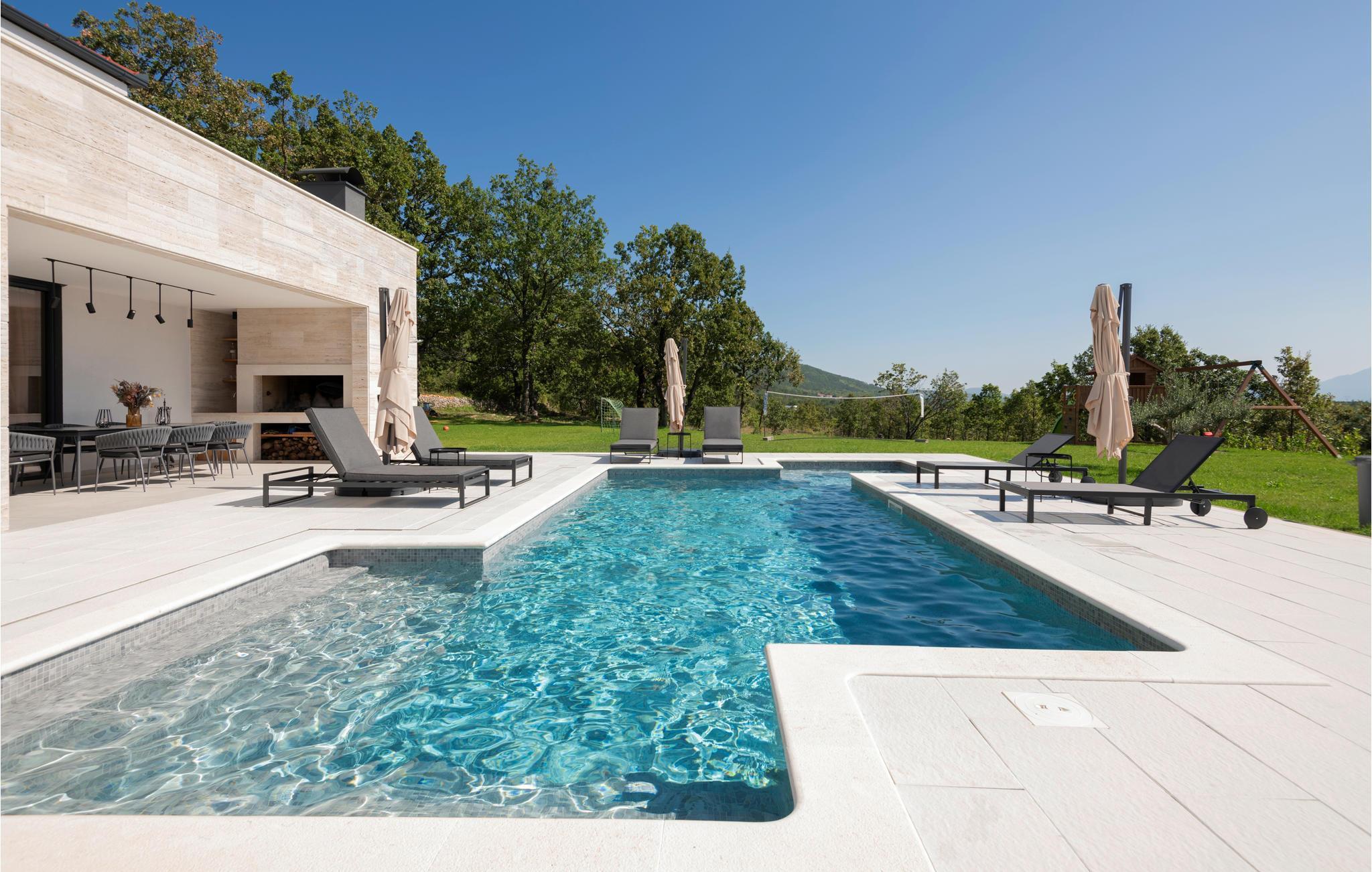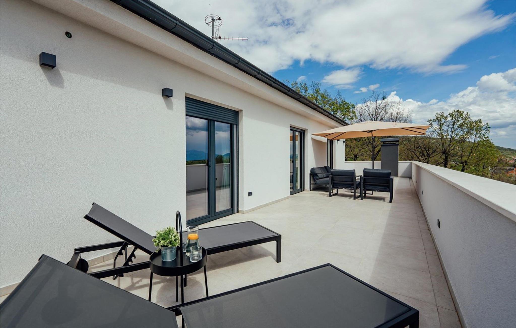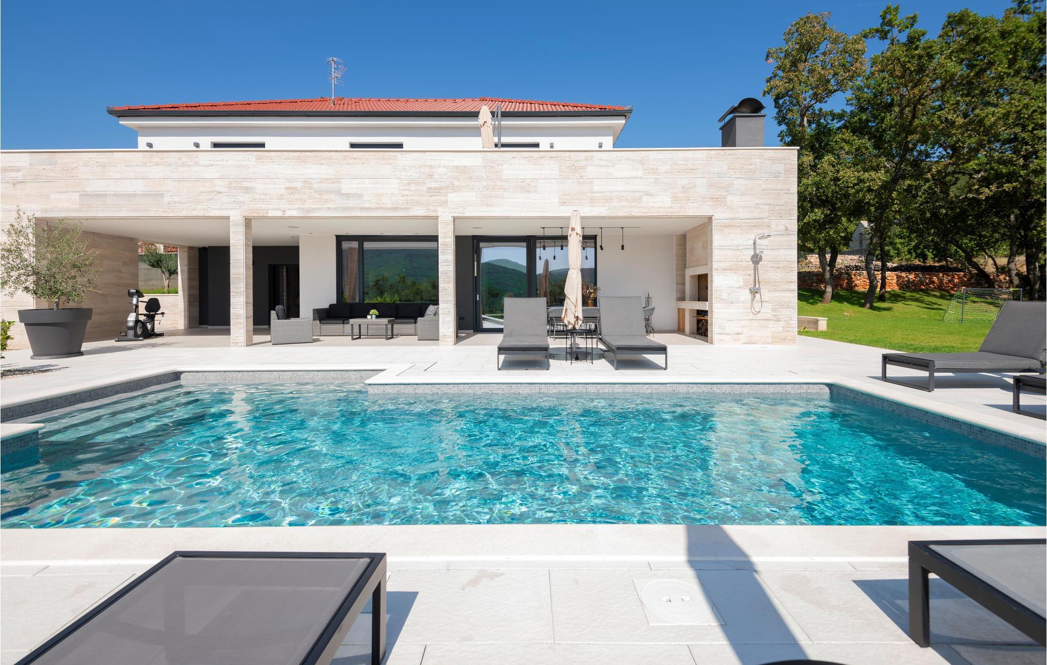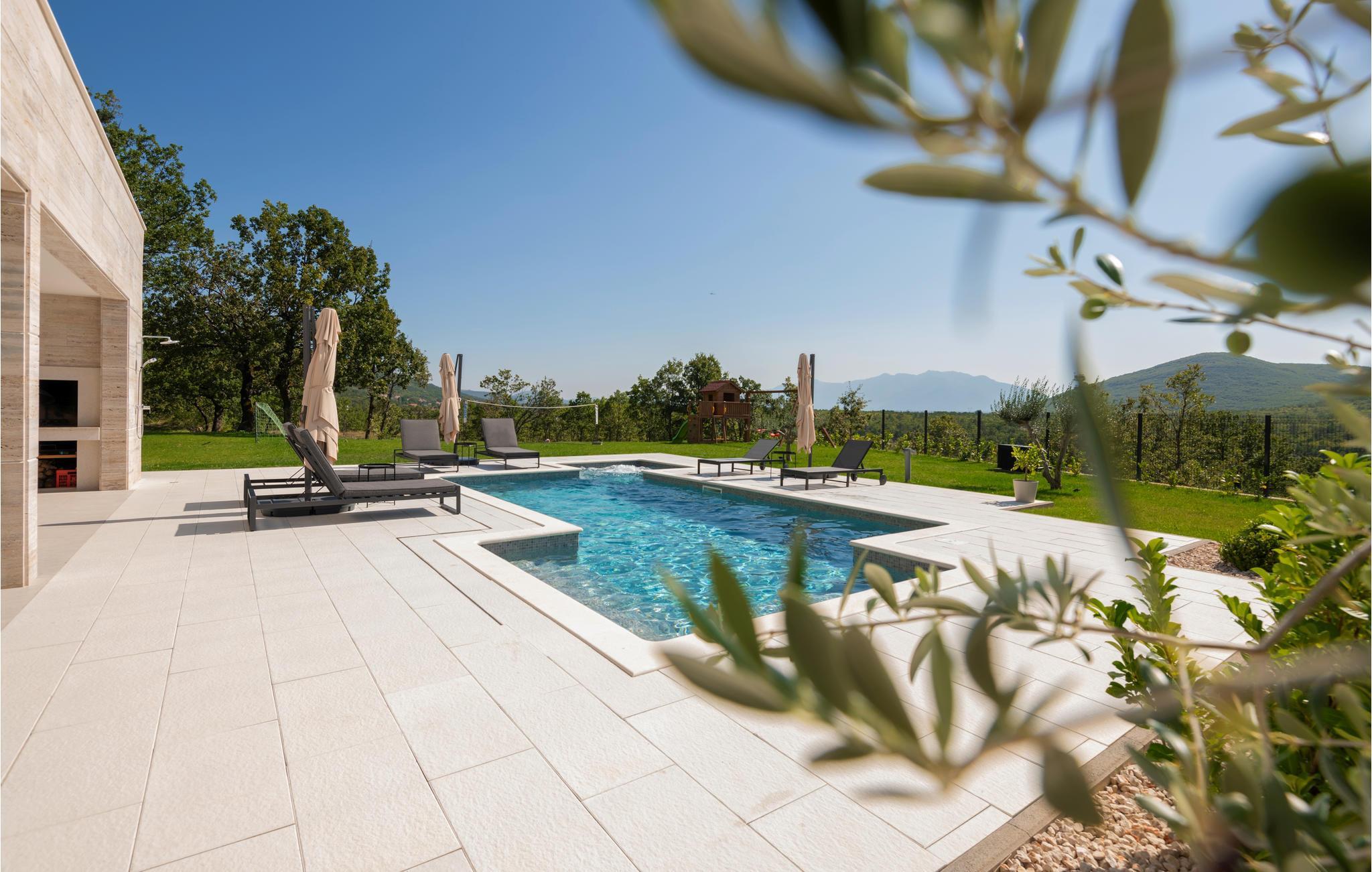 Det børnevenlige og komfortable hus byder jer velkommen med en fantastisk beliggenhed bag den dalmatiske kyst, og her kommer I ikke til at mangle noget. Noget af det første, I vil lægge mærke til, er udsigten over det maleriske landskab gennem de store panoramavinduer. Den stilfulde atmosfære indgyder ren afslapning, og efter en behagelig massage i boblebadet og en tur i saunaen kan I sætte jer godt til rette ved pejsen og sludre til sent ud på aftenen. Her har I valget mellem flere terrasser, hvor I kan nyde solen og den smukke udsigt. Se jeres børn lege på den store grund og saml hele familien om aftenen til et lækkert måltid fra grillen.