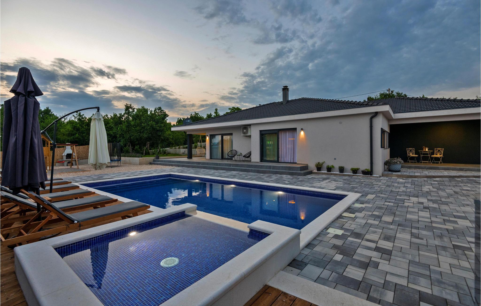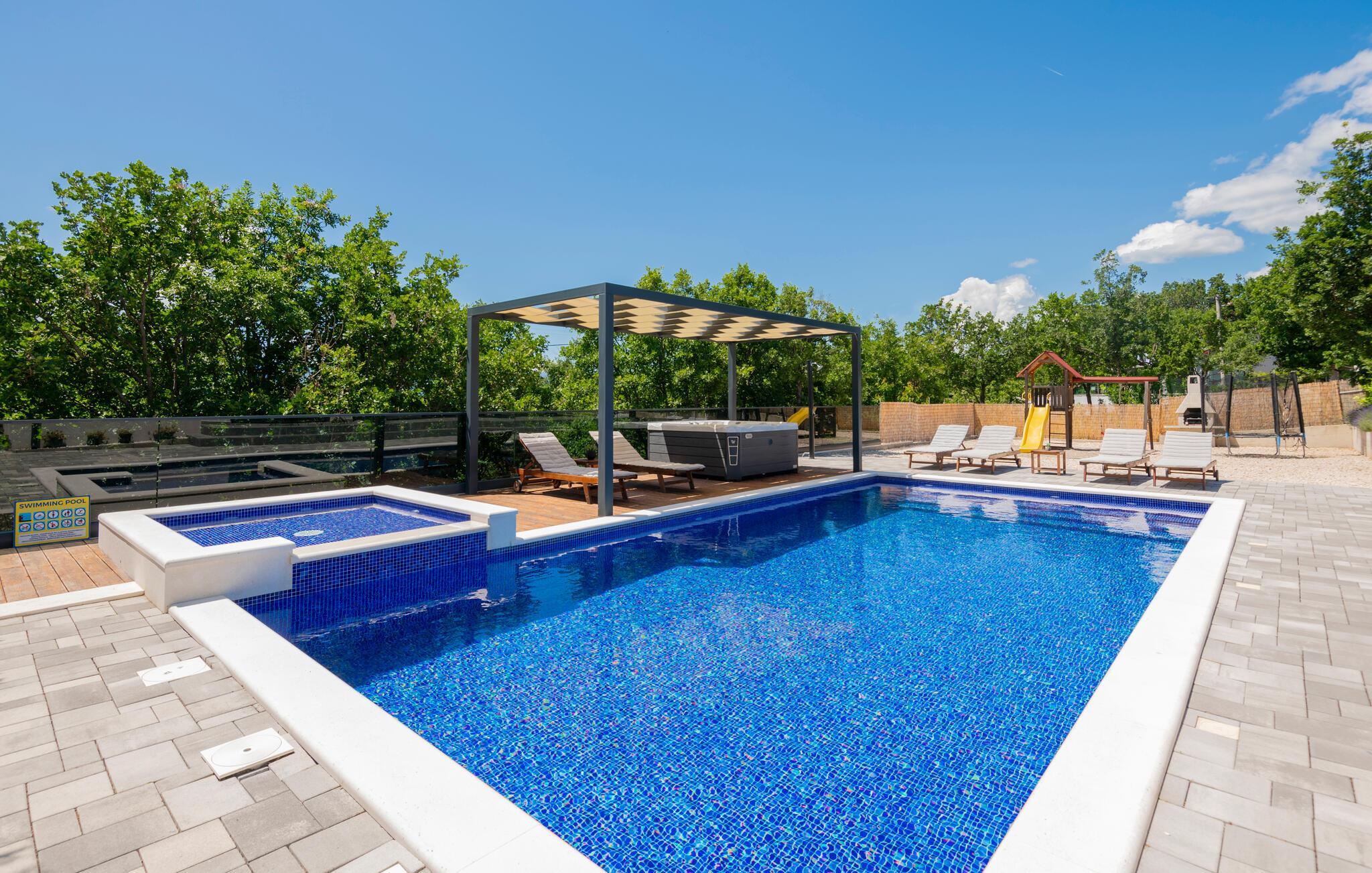 Dette hus har en beliggenhed i stueetagen og tilbyder alt, hvad der skal til for at gøre jeres ferie afslappende og hyggelig for hele familien. Der er en swimmingpool med en børnepool foran huset, som giver den nødvendige forfriskning på varme sommerdage. Der er en overdækket terrasse med en grill lige ved siden af.