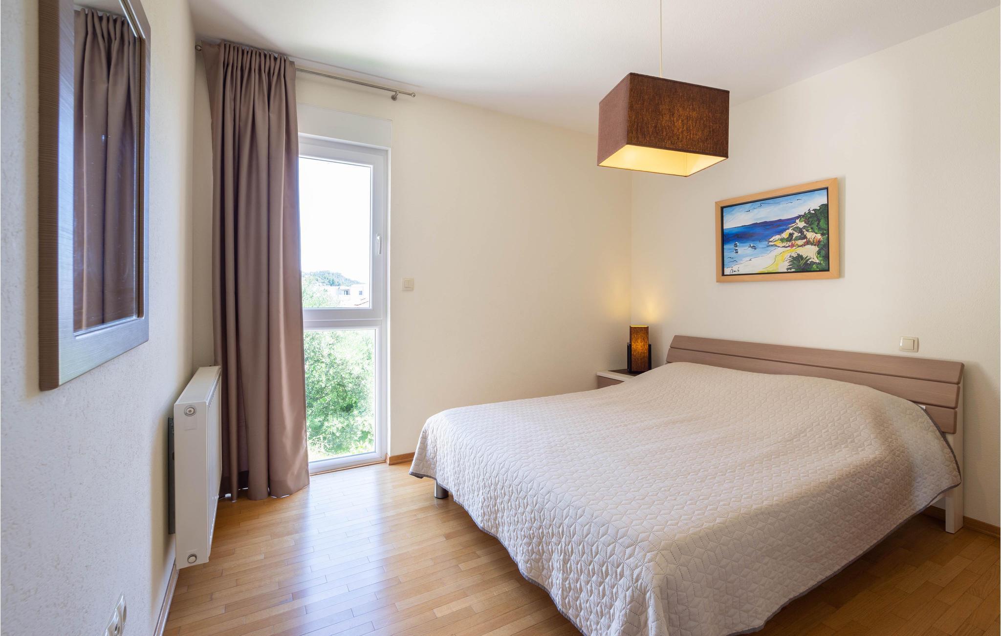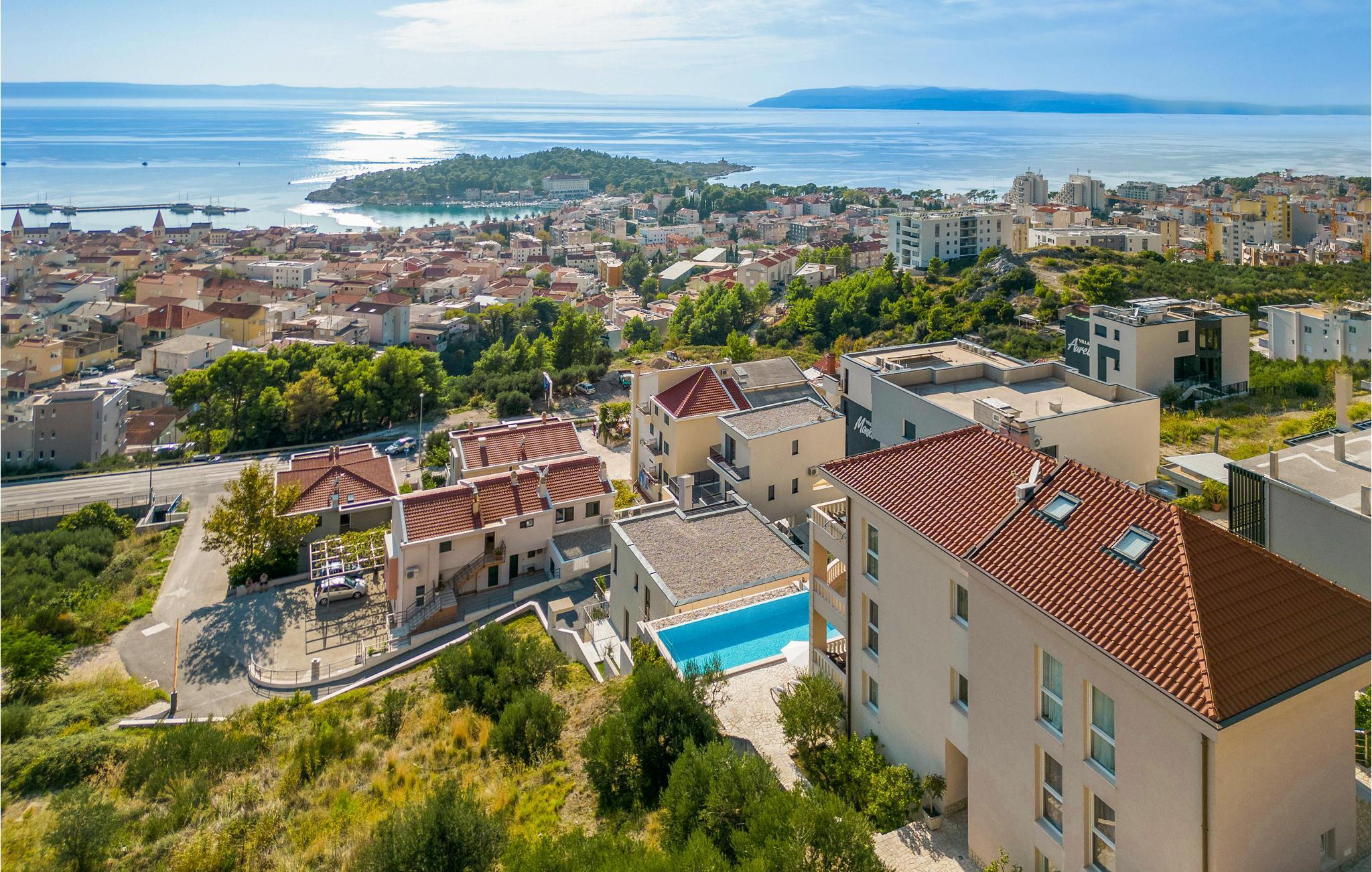 I denne fantastiske ferieby venter der jer en vidunderlig udsigt fra dette dobbelthus til Biokovo-Bjergmassivet samt over havet. Huset er så stort og rummeligt, at her sagtens er plads til to familier. Fra den store poolterrasse og swimmingpoolen, som I har helt for jer selv, kan I nemt komme til stueetagens konoba med en velassorteret vinreol. Her er der plads nok til jer alle, og her kan I lave herlige lækkerier på grillen og nyde dem, måske med et glas lokal vin til. I stueetagen findes et soveværelse. Hvis I gerne vil holde formen ved lige, mens I er på ferie, kan I benytte det skønne fitnessrum på 1. sal. De resterende soveværelser finder I ligeledes på 1. sal, som I kommer til ad en udendørs trappe. Fra terrassen har I en vidunderlig udsigt, som I med garanti vil nyde. Tagetagen er ikke tilgængelig! Feriehuset ligger i et roligt område på en bakke og byder på en vidunderlig panoramaudsigt til Makarska og havet. Besøg byens centrum, der byder på mange arrangementer og masser af underholdning for alle aldre. Gå en tur på strandpromenaden, der bugner af hyggelige caféer, restauranter og souvenierbutikker. Prøv de lokale specialiteter som grillet fisk og kød samt de skønne vine fra denne region. Det kan også anbefales at tage på en dagstur med båd til øerne Brac og Hvar, der begge har masser af kulturelle tilbud samt helt utroligt smukke strande. For aktive feriegæster er der mange muligheder - prøv kræfter med cykling, vandreture, tennis, basketball, fodbold, surfing m.m. Opdag også de små steder med skønne, lange kiselstrande - Tucepi, Brela og Baska Voda. Den venlige husejer bor i nabohuset.
