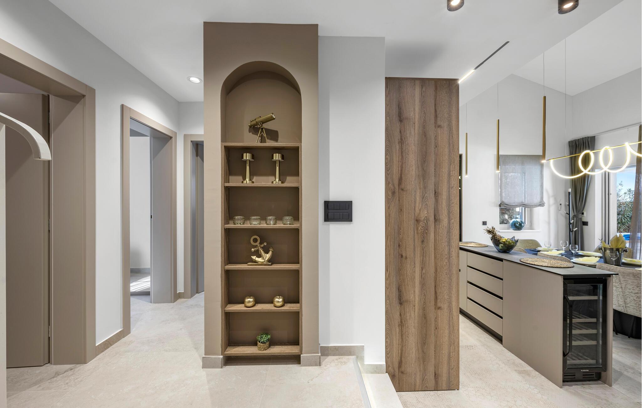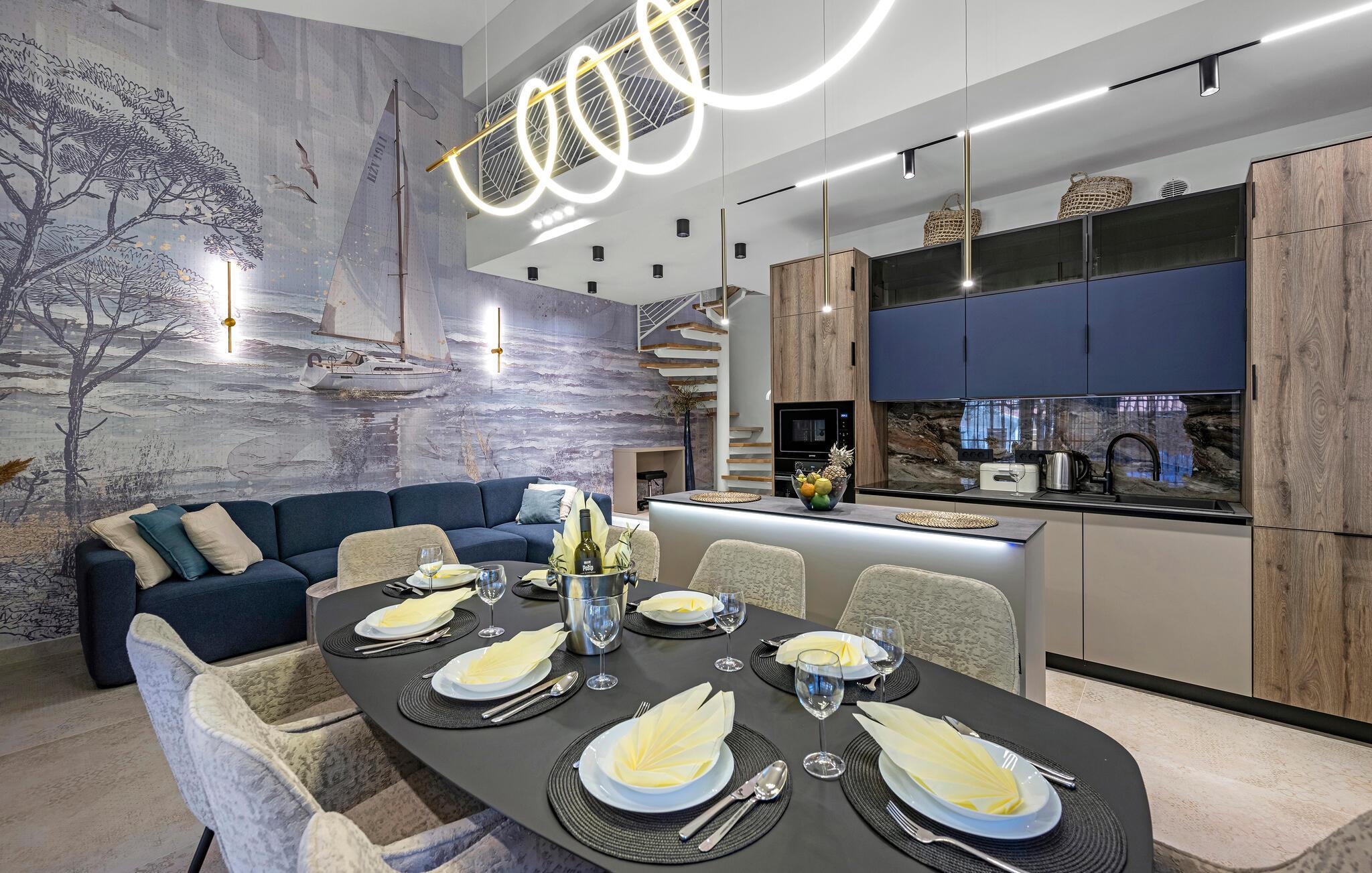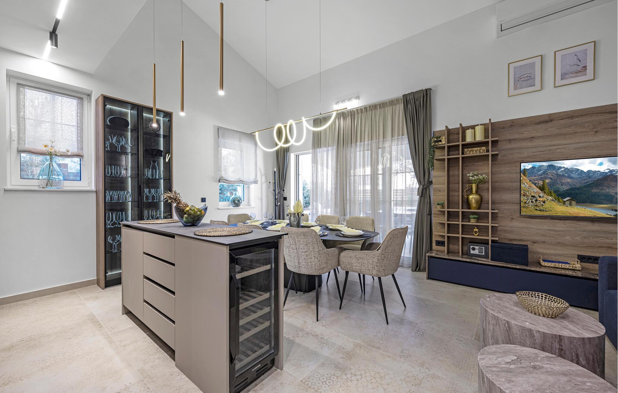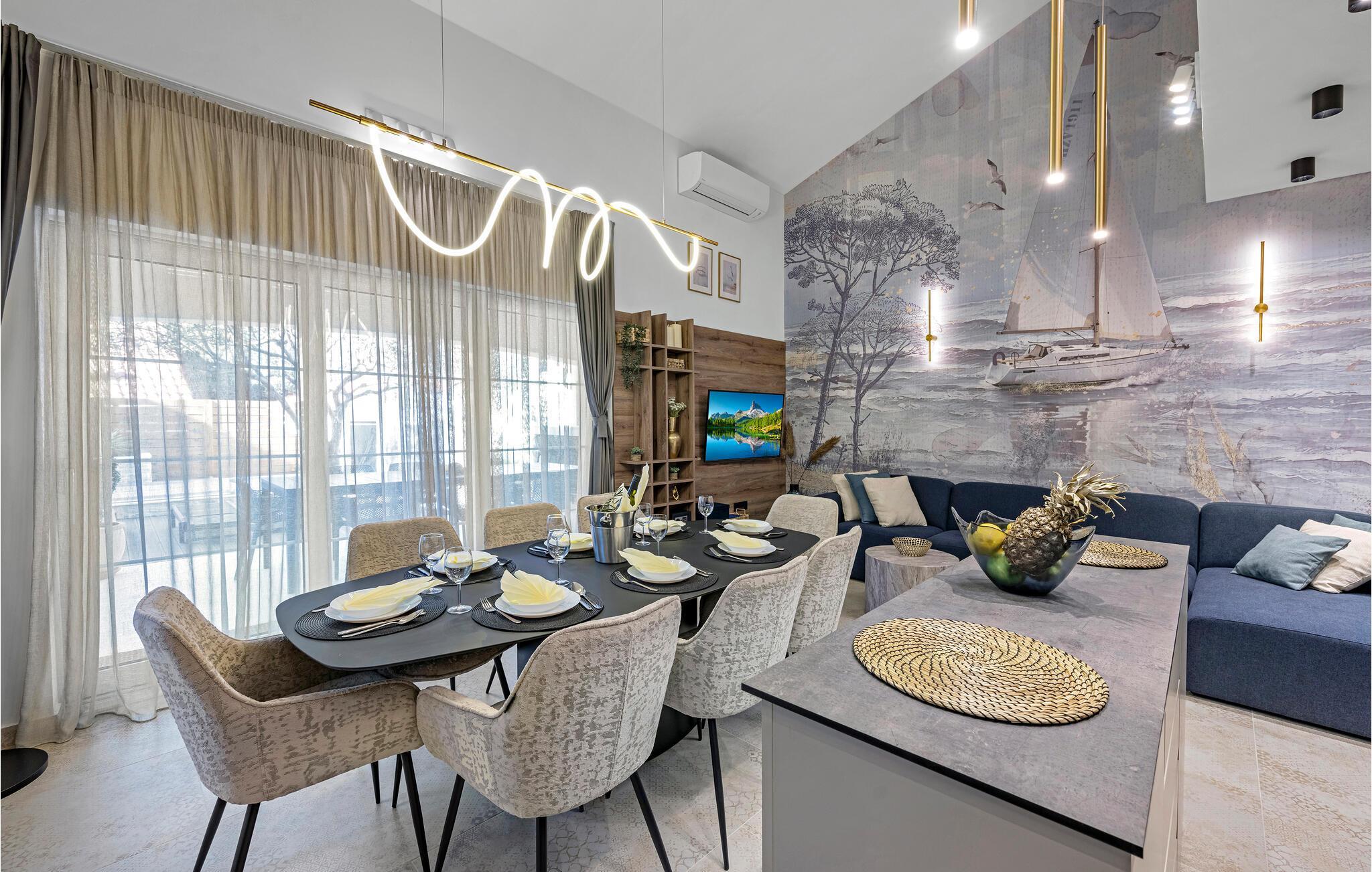 Dette rummelige feriehus nær smukke sandstrande forkæler jer med stilfulde møbler og moderne bekvemmeligheder. Glæd jer til hyggelige madlavningsaftener i det åbne køkken og fælles måltider ved spisebordet. Hold jer i form på løbebåndet og slap derefter af i den komfortable stue med en god film.