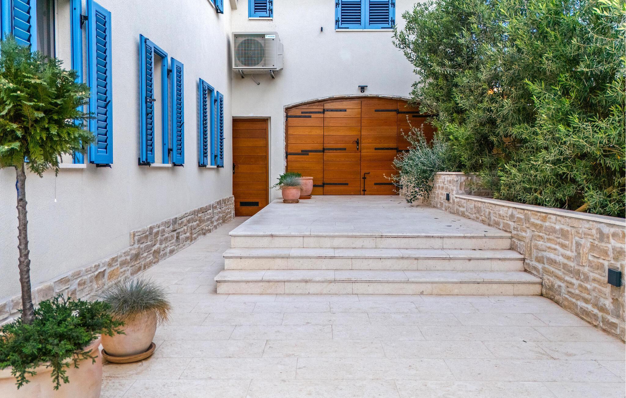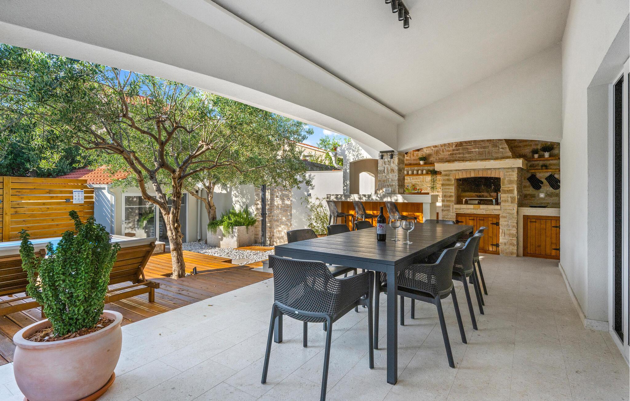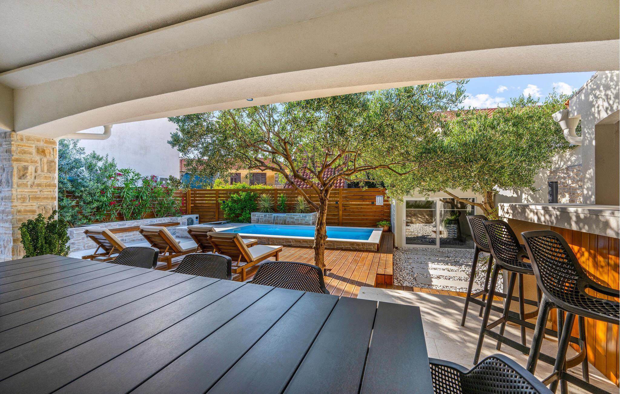 I det attraktivt designede udendørsområde kan I nyde middelhavsklimaet fuldt ud. Begynd dagene med en afslappet morgenmad på terrassen, snup en frisk dukkert i poolen, solbad på de behagelige liggestole, og nyd de lune sommeraftener med lækre retter fra grillen.