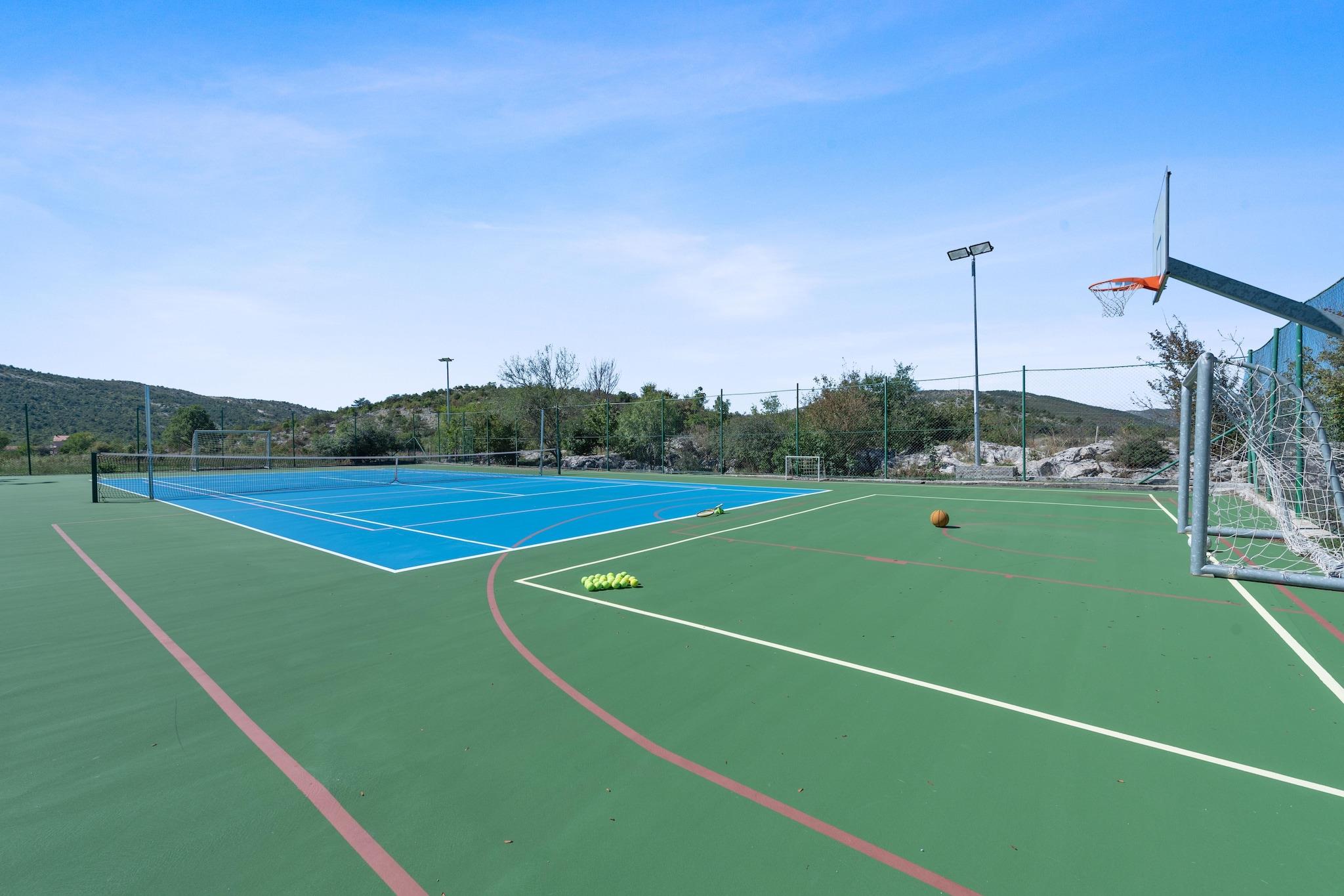 Dette feriehus til 12 gæster ligger i den fredelige landsby Neoric og tilbyder en perfekt blanding af afslapning og eventyr. Med gratis WiFi, en privat indhegnet have og en opvarmet swimmingpool kan gæsterne nyde både komfort og bekvemmelighed. Huset ligger 600 meter fra byens centrum, med almindelige forsyninger og offentlig transport i nærheden, mens der kun er restauranter 5 km væk, hvilket sikrer nem adgang til de vigtigste fornødenheder. Indenfor har ejendommen to rummelige opholds- og spisestuer med fladskærms-tv og pejse, to fuldt udstyrede køkkener og fem hyggelige soveværelser, begge med aircondition og balkoner. Gæsterne kan slappe af i boblebadet, nyde udendørs spisning med grill eller benytte sig af faciliteter som en sauna, fitnessudstyr og en tennisbane. Den private terrasse og haven tilbyder en rolig ramme for afslapning, mens trampolinen og petanquebanen tilføjer sjov for alle aldre. I nærheden kan du udforske fæstningen Klis, en historisk fæstning med betagende udsigt, eller besøge Sinj, hjemsted for det berømte Muzej Sinjske alke, der hylder Kroatiens rige ridearv. Til spisning tilbyder Pizzeria Kvartiri lækker pizza, mens Restaurant Perlica serverer autentiske middelhavsretter. Uanset om du søger eventyr eller ro, er dette feriehus det perfekte tilflugtssted.
