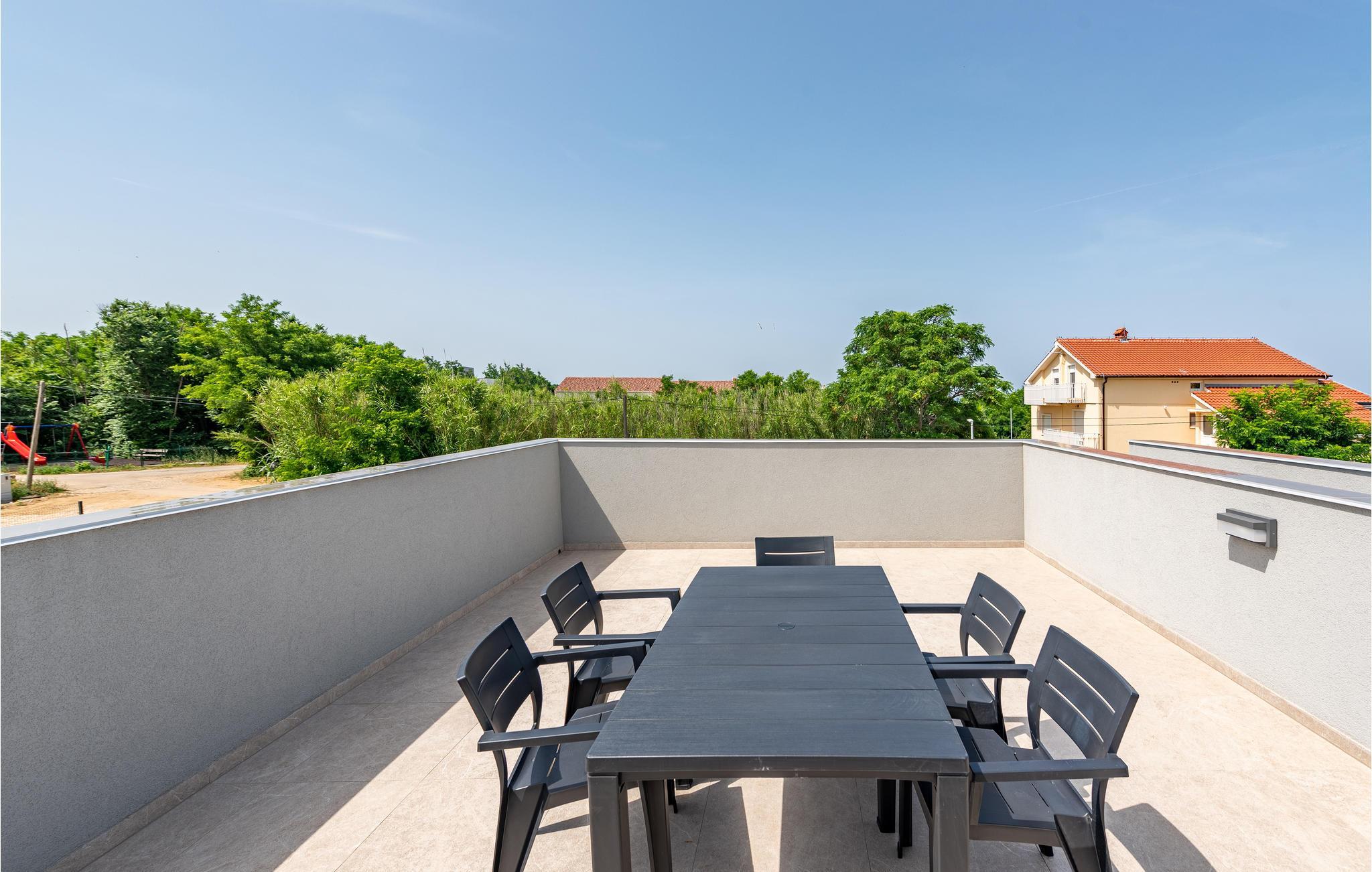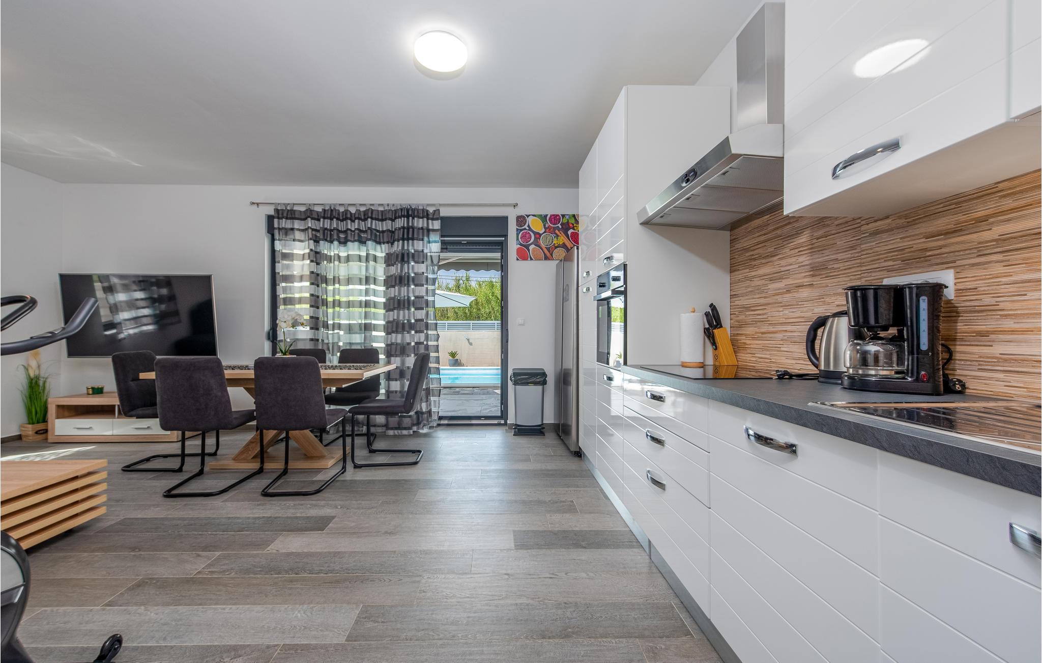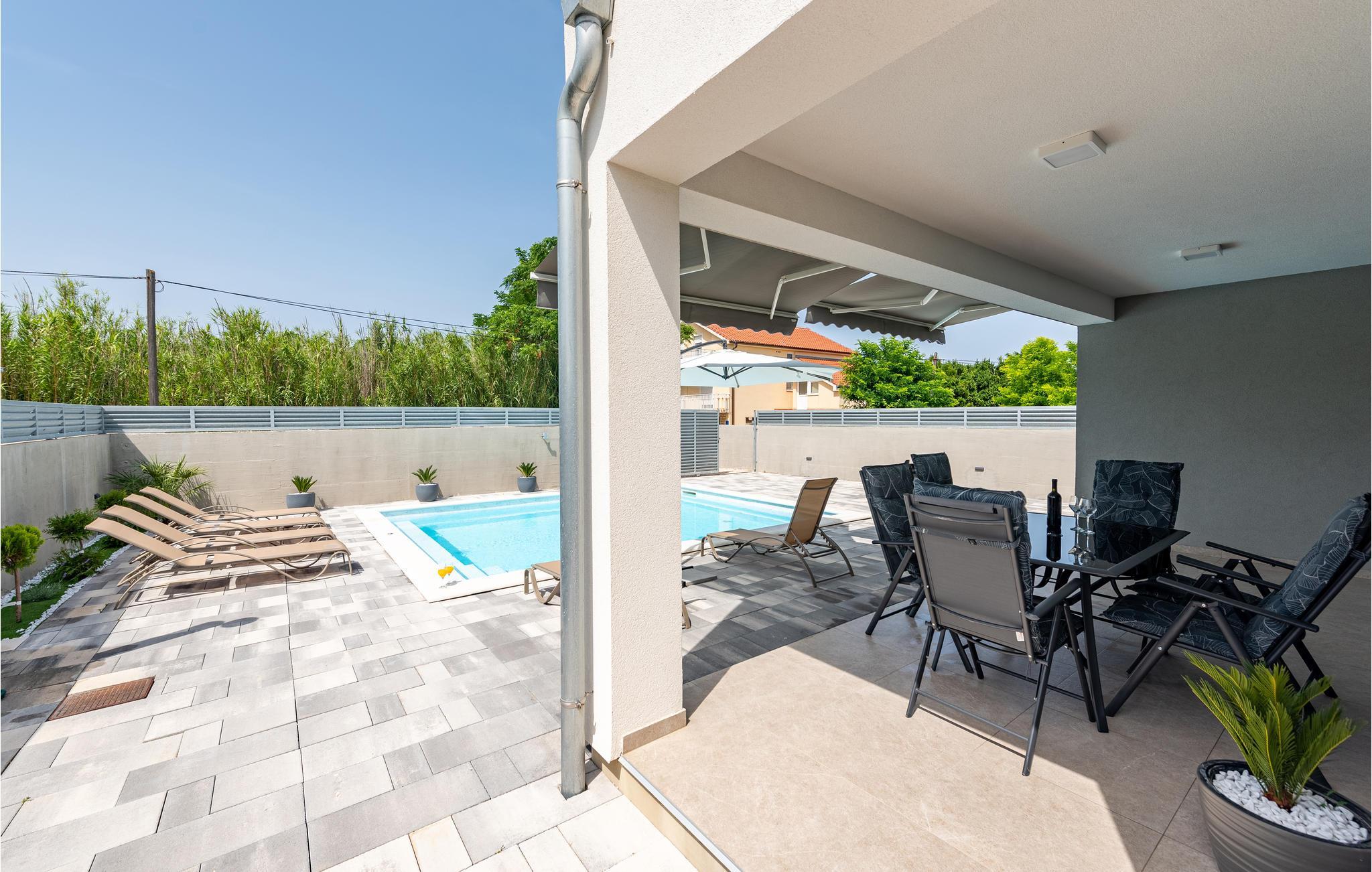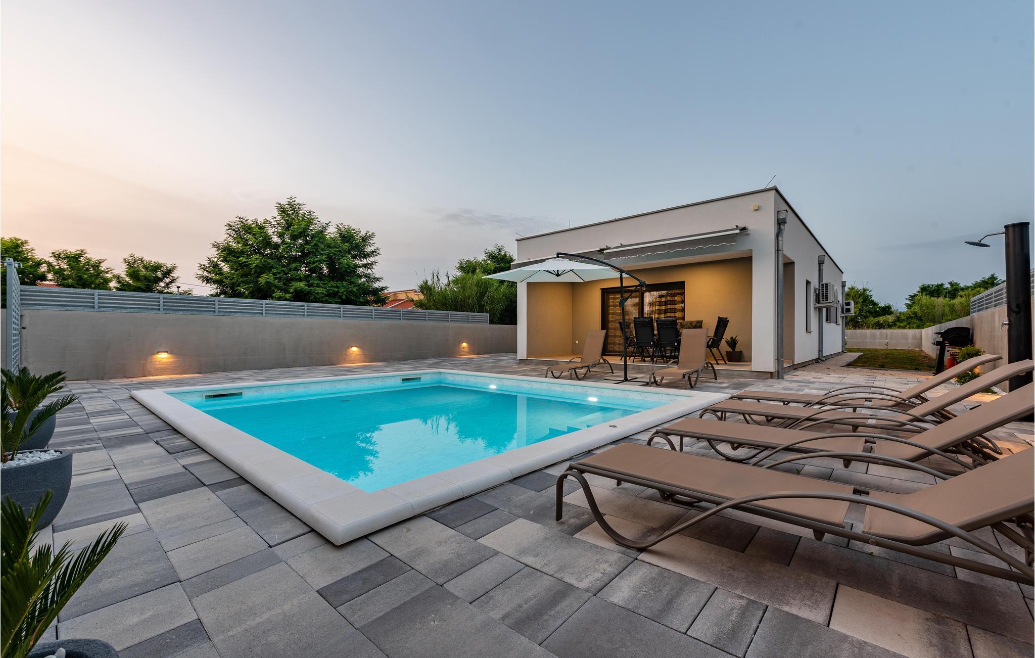 Dette moderne og familievenlige feriehus med pool byder jer velkommen nær stranden. Leder I efter den ideelle feriebolig til en afslappet ferie med en kort gåtur til havet og en kulturel og spændende by i nærheden? Så har I fundet det perfekte og moderne feriehus her. Det komfortable hus tilbyder jer alle bekvemmeligheder på ét plan, så I kan føle jer godt tilpas og hjemme her. Den skønne stue kombinerer madlavning, leg og afslapning, så I kan se børnene male, mens I fremtryller lækre retter i det lyse køkken. Nyd jeres måltider al fresco på den skyggefulde terrasse og hop derefter i poolen for at køle af. Mens børnene fortsætter med at lege i vandet, kan I føle jer godt tilpas på en liggestol. I kan også solbade i fred på tagterrassen, hvorfra I også kan få et glimt af havet. Grib jeres strandtaske og gå en tur til den nærliggende stenstrand. Dyk ned i havet og hop i bølgerne med jeres børn. Spil bold på stranden og slap af. Udforsk området på de andre dage af jeres ferie. Besøg byen Nin eller kør over broen til øen Vir. I vil også nyde en dag i Zadar og efterlade mange oplevelser og indtryk i jeres hukommelse.