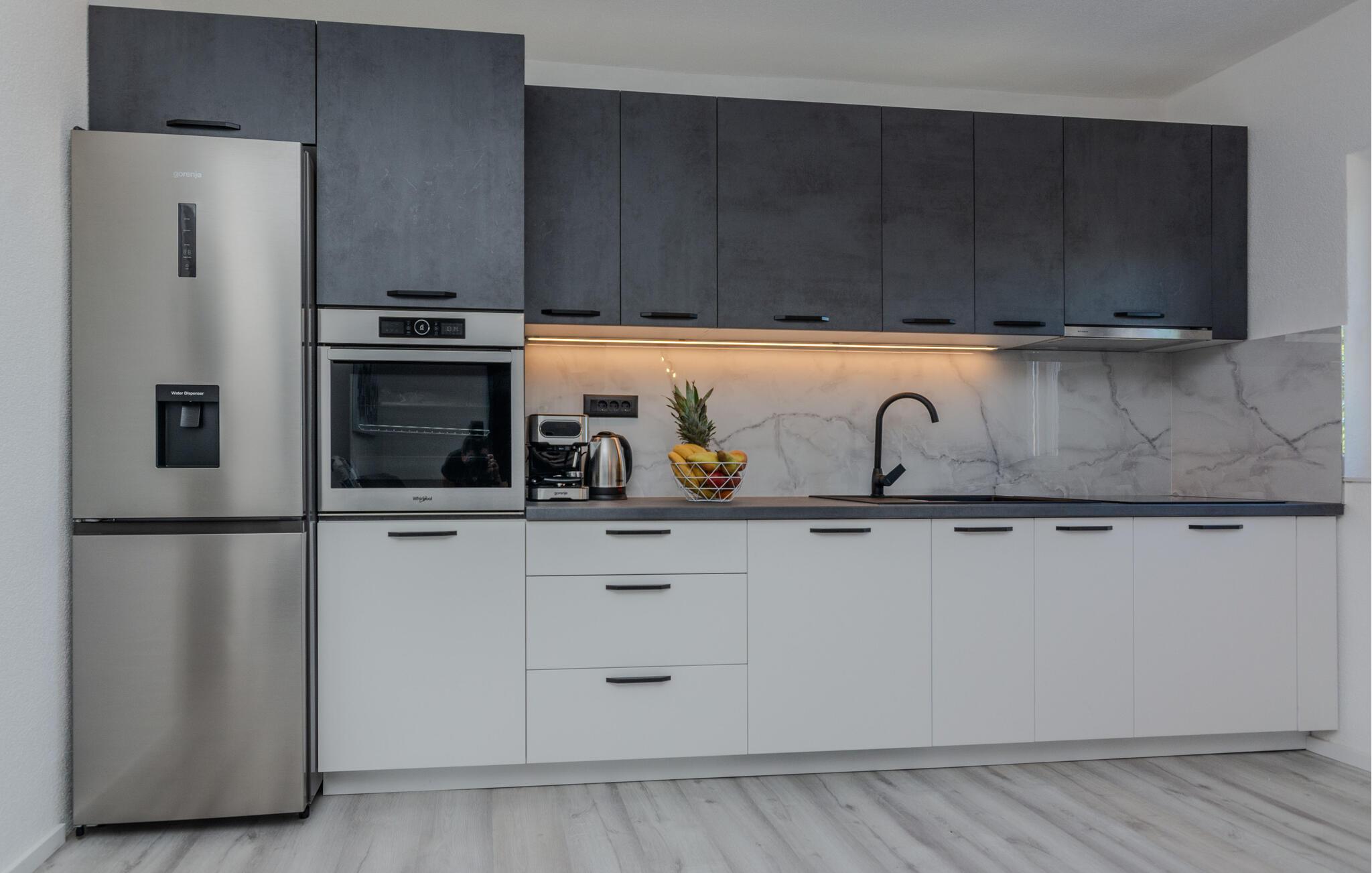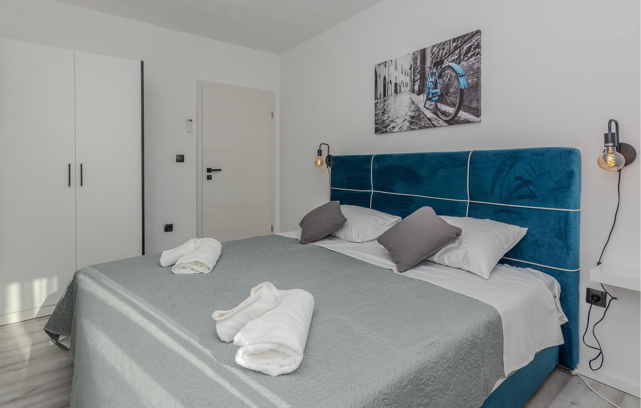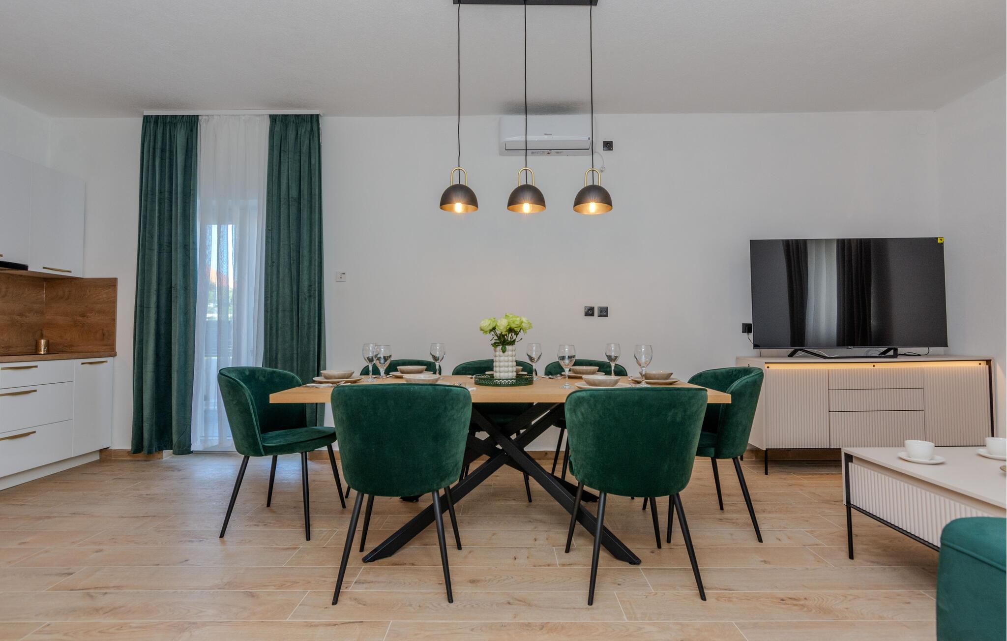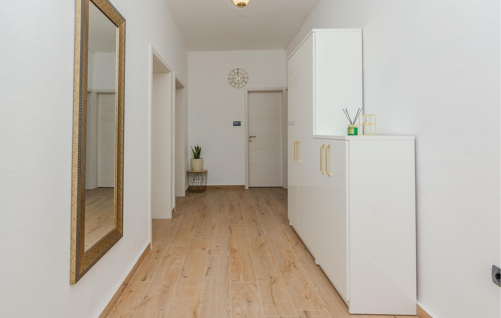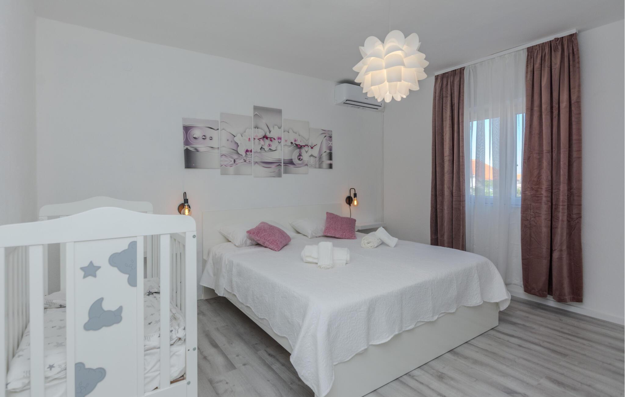 Hvis I er på udkig efter en rummelig bolig til årets ferie med den udvidede familie, og går I ikke af vejen for høj komfort, sjov og privatliv, er denne store villa i Nin det helt rigtige valg for jer. Huset er flot og smagfuldt indrettet med flere opholdsområder og køkkener, og soveværelserne har eget badeværelse, så I kan trække jer lidt tilbage, når behovet måtte opstå. Stueetagen og overetagen er forbundet via en udvendig trappe.
