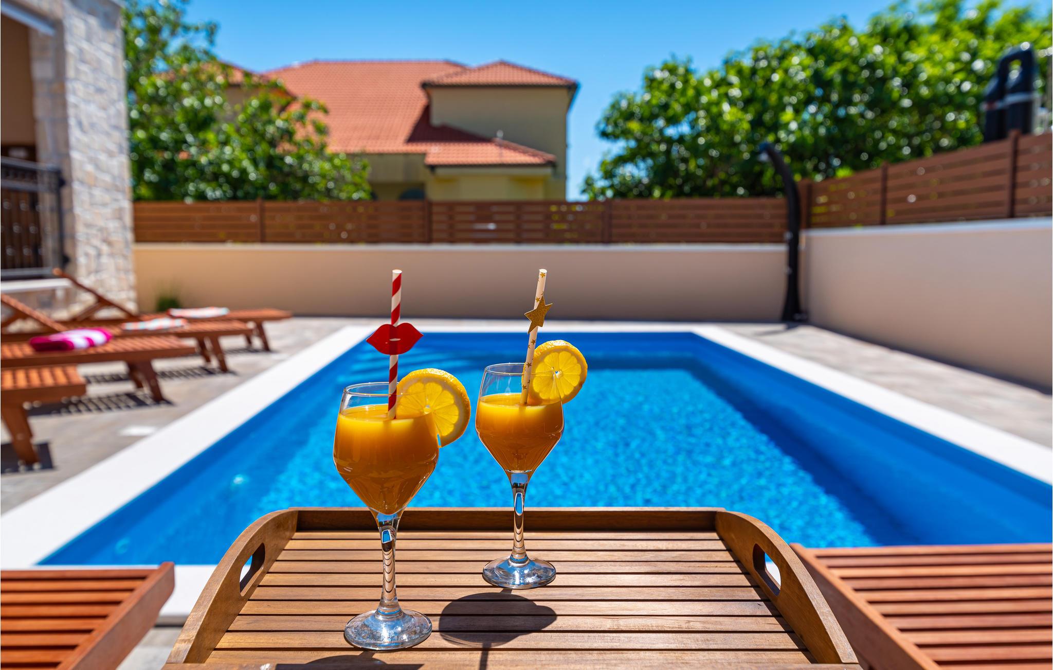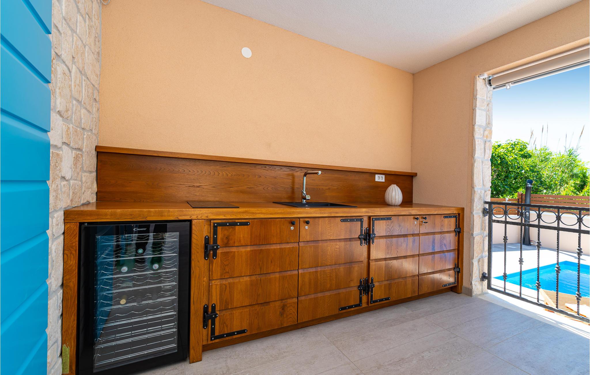 Tilbring vidunderlige dage ved poolen i sommerhusets udendørs område. Det sommerlige køkken af ??høj kvalitet med to kogeplader, en vask og et køleskab til drinks gør det muligt for dig at tilberede måltider udendørs.