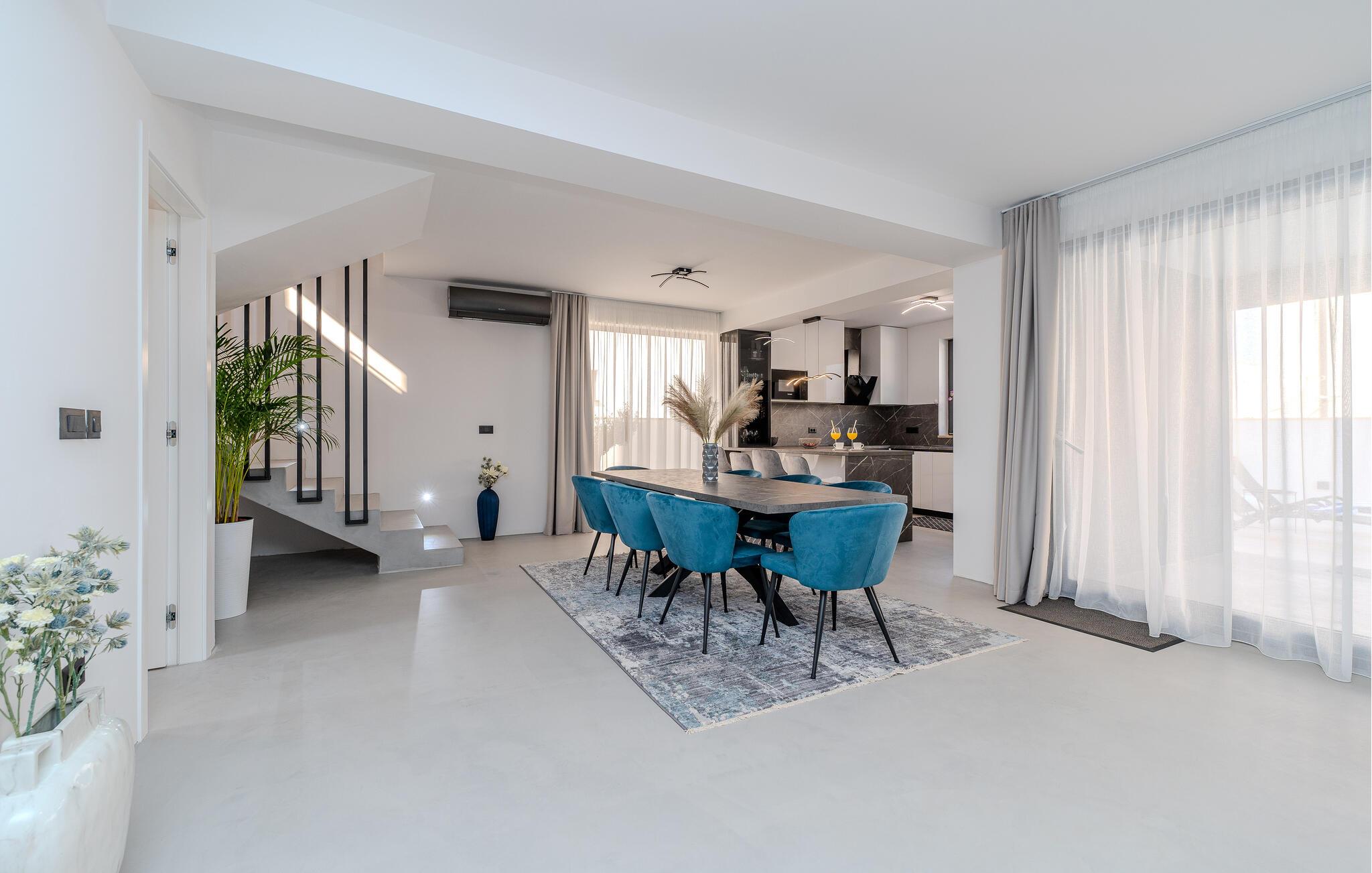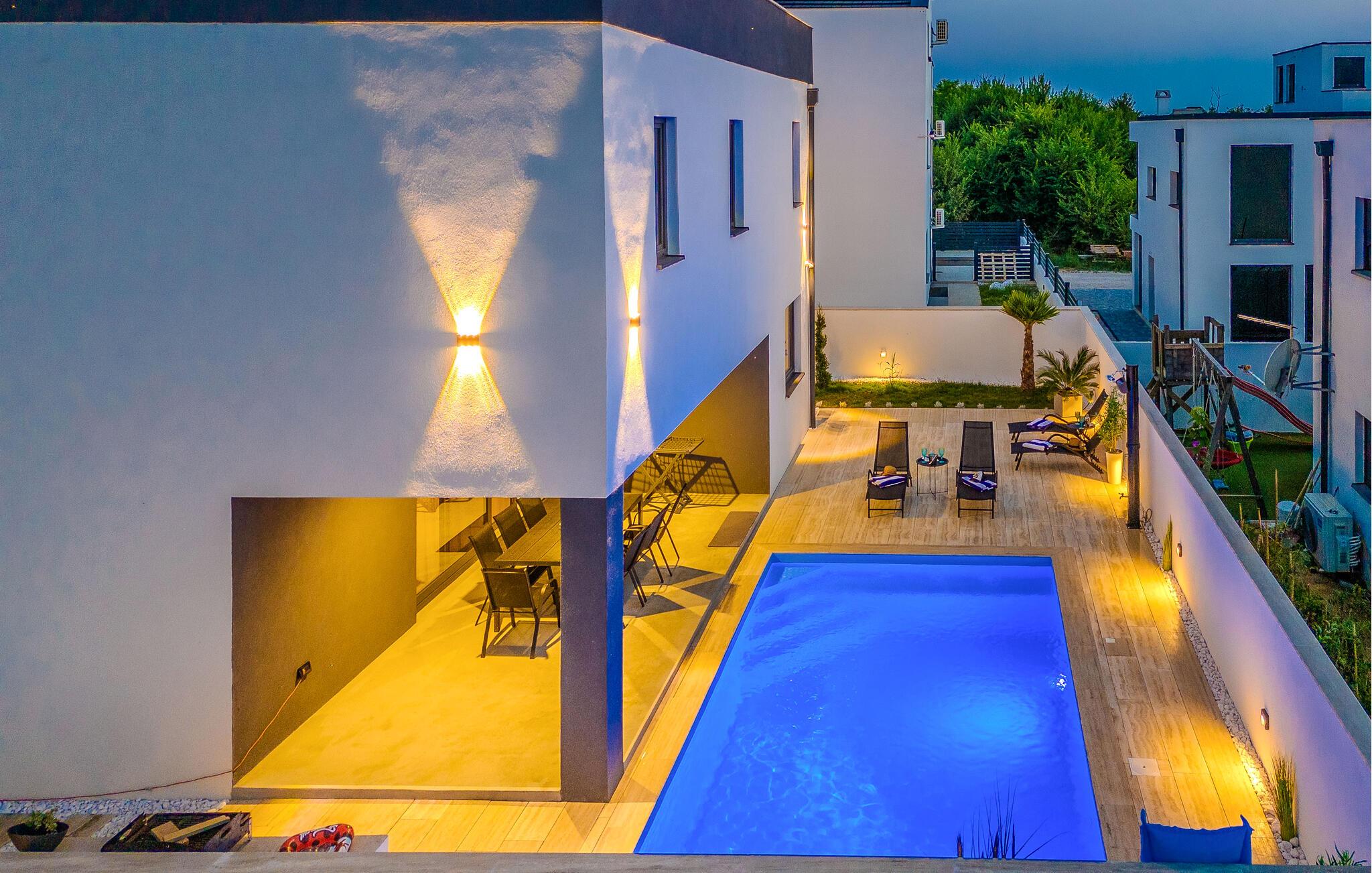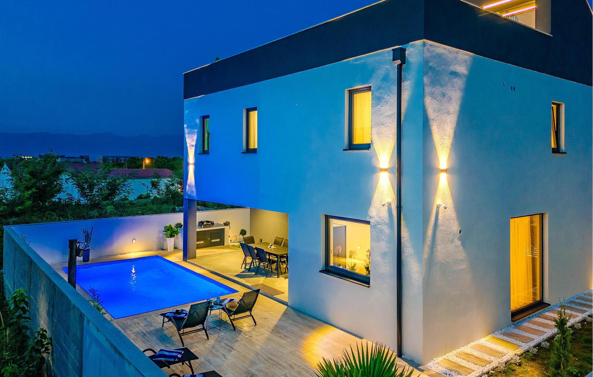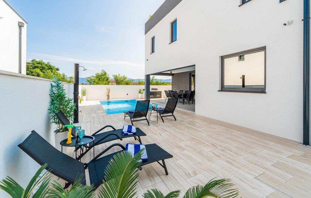 Forkæl jer selv med luksus og afslapning i dette skønne feriehus med havudsigt og pool. Velkommen til jeres rummelige feriehus i Privlaka, hvor moderne design møder indbydende komfort. Interiøret vil glæde jer med nøje udvalgte møbler og individuelle farveaccenter, der giver hvert af de mange soveværelser et særligt præg. Det åbne rumskoncept skaber en harmonisk atmosfære, der lægger op til at blive hængende og slappe af. Nyd forfriskende dage ved poolen eller tilbring hyggelige timer på den overdækkede terrasse i haven. Familier vil sætte pris på legepladsen i haven, mens voksne vil nyde tagterrassen med en vidunderlig udsigt over havet og de omkringliggende øer og solens stråler. Privlaka-området tilbyder jer et væld af muligheder for eventyr og afslapning. De nærliggende strande er optimale til en dag fuld af sol og vandaktiviteter. Udforsk den charmerende kystlinje med dens skjulte bugter og klare vand perfekt til svømning og snorkling. For en kulturel udflugt kan I besøge den historiske by Zadar, hvor I kan udforske gamle kirker, det berømte Havorgel og den livlige gamle bydel. Her er noget for enhver smag.
