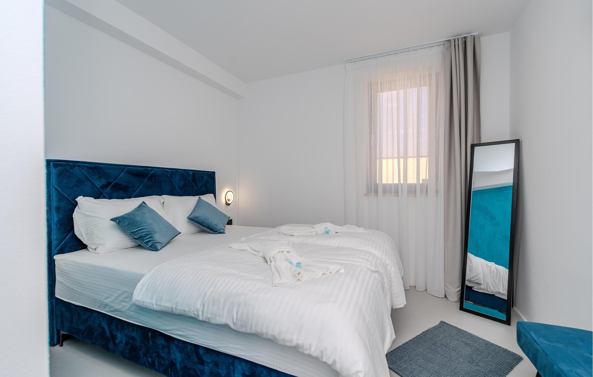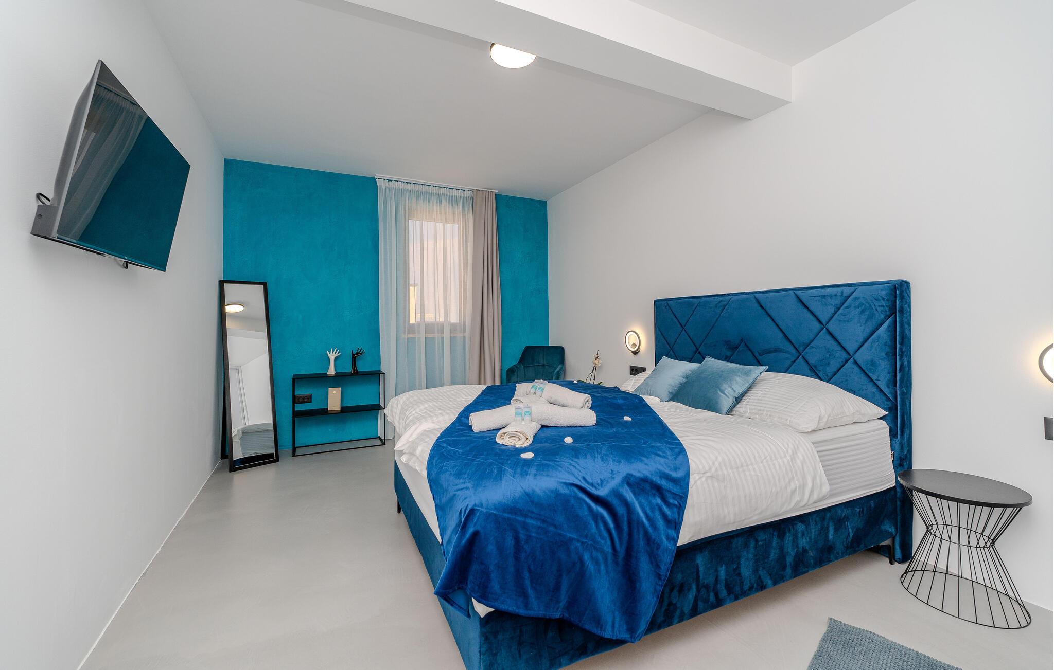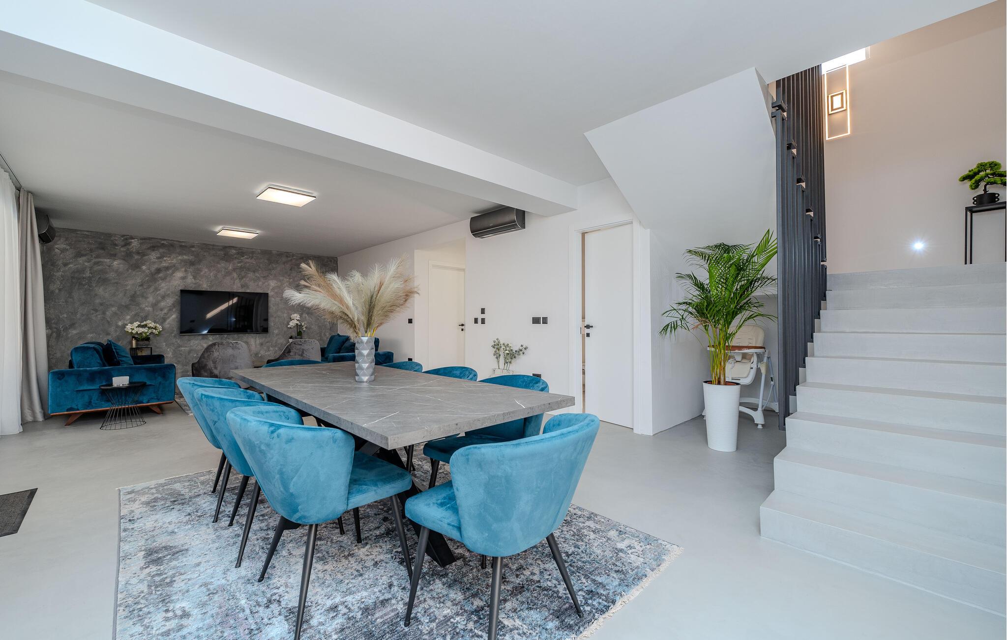 Forkæl jer selv med luksus og afslapning i dette skønne feriehus med havudsigt og pool. Velkommen til jeres rummelige feriehus i Privlaka, hvor moderne design møder indbydende komfort. Interiøret vil glæde jer med nøje udvalgte møbler og individuelle farveaccenter, der giver hvert af de mange soveværelser et særligt præg. Det åbne rumskoncept skaber en harmonisk atmosfære, der lægger op til at blive hængende og slappe af. Nyd forfriskende dage ved poolen eller tilbring hyggelige timer på den overdækkede terrasse i haven. Familier vil sætte pris på legepladsen i haven, mens voksne vil nyde tagterrassen med en vidunderlig udsigt over havet og de omkringliggende øer og solens stråler. Privlaka-området tilbyder jer et væld af muligheder for eventyr og afslapning. De nærliggende strande er optimale til en dag fuld af sol og vandaktiviteter. Udforsk den charmerende kystlinje med dens skjulte bugter og klare vand perfekt til svømning og snorkling. For en kulturel udflugt kan I besøge den historiske by Zadar, hvor I kan udforske gamle kirker, det berømte Havorgel og den livlige gamle bydel. Her er noget for enhver smag.