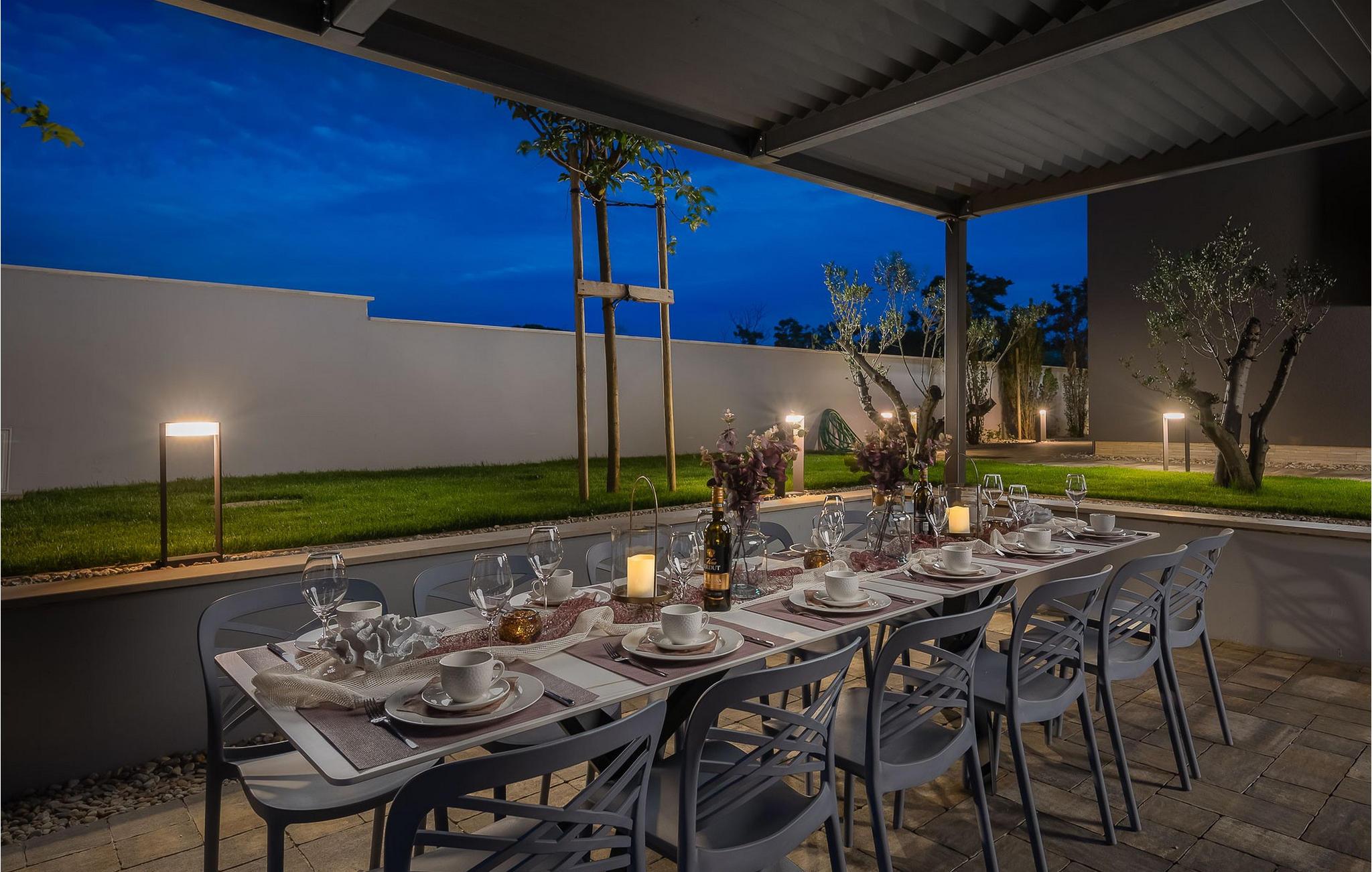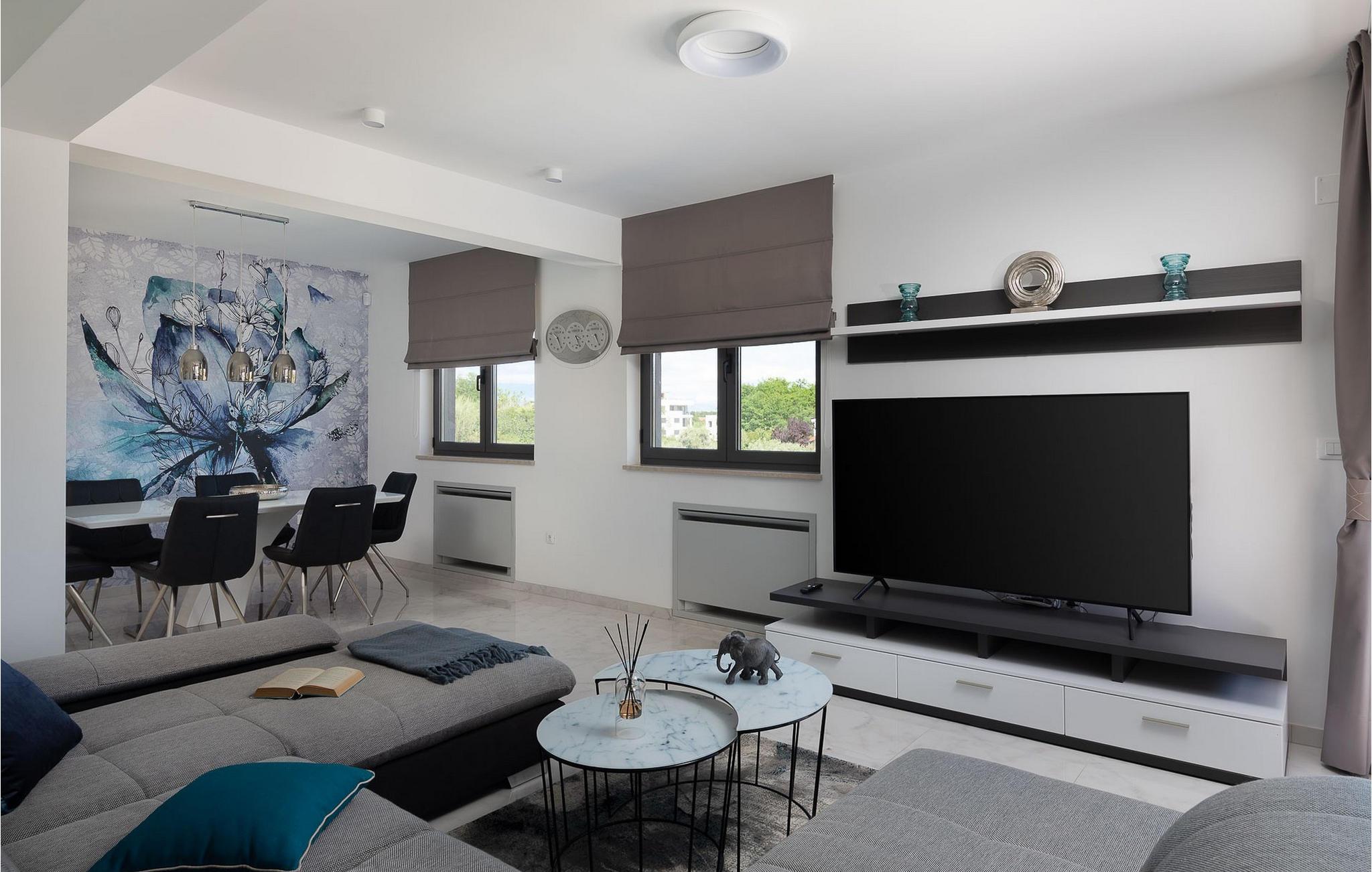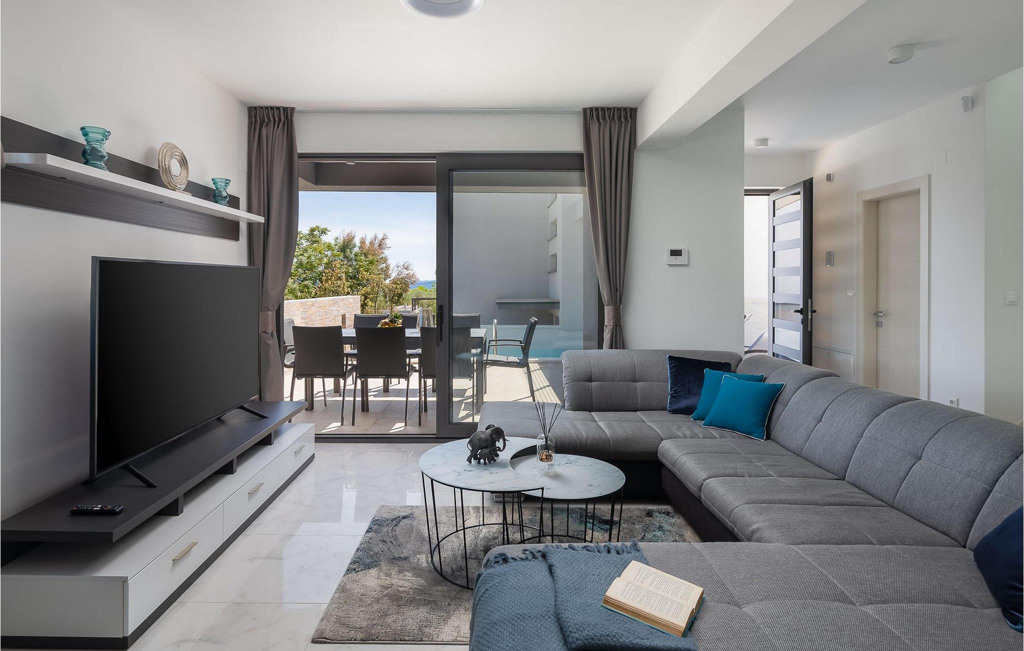 Bare få meter fra stranden byder den luksuriøse og rummelige Villa Tina jer velkommen, ideel til en ferie med flere familier eller en gruppe venner. lyse rum og moderne møbler skaber de perfekte rammer for at tilbringe tid sammen. Nyd måltider sammen ved det lange spisebord med en smuk udsigt over naturen, slap af i saunaen, og glæd jer til hyggelige aftener i indbydende sofaer.