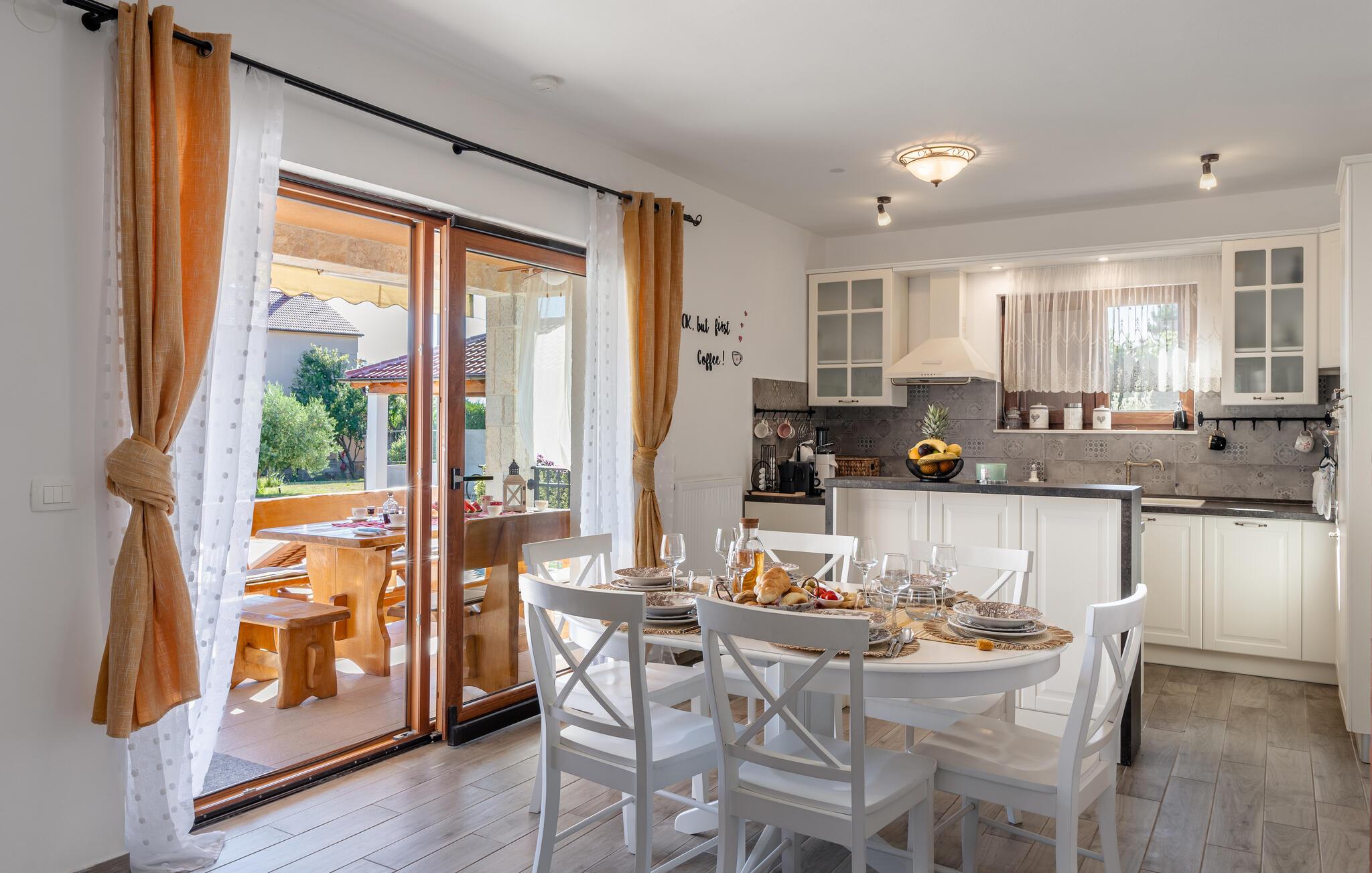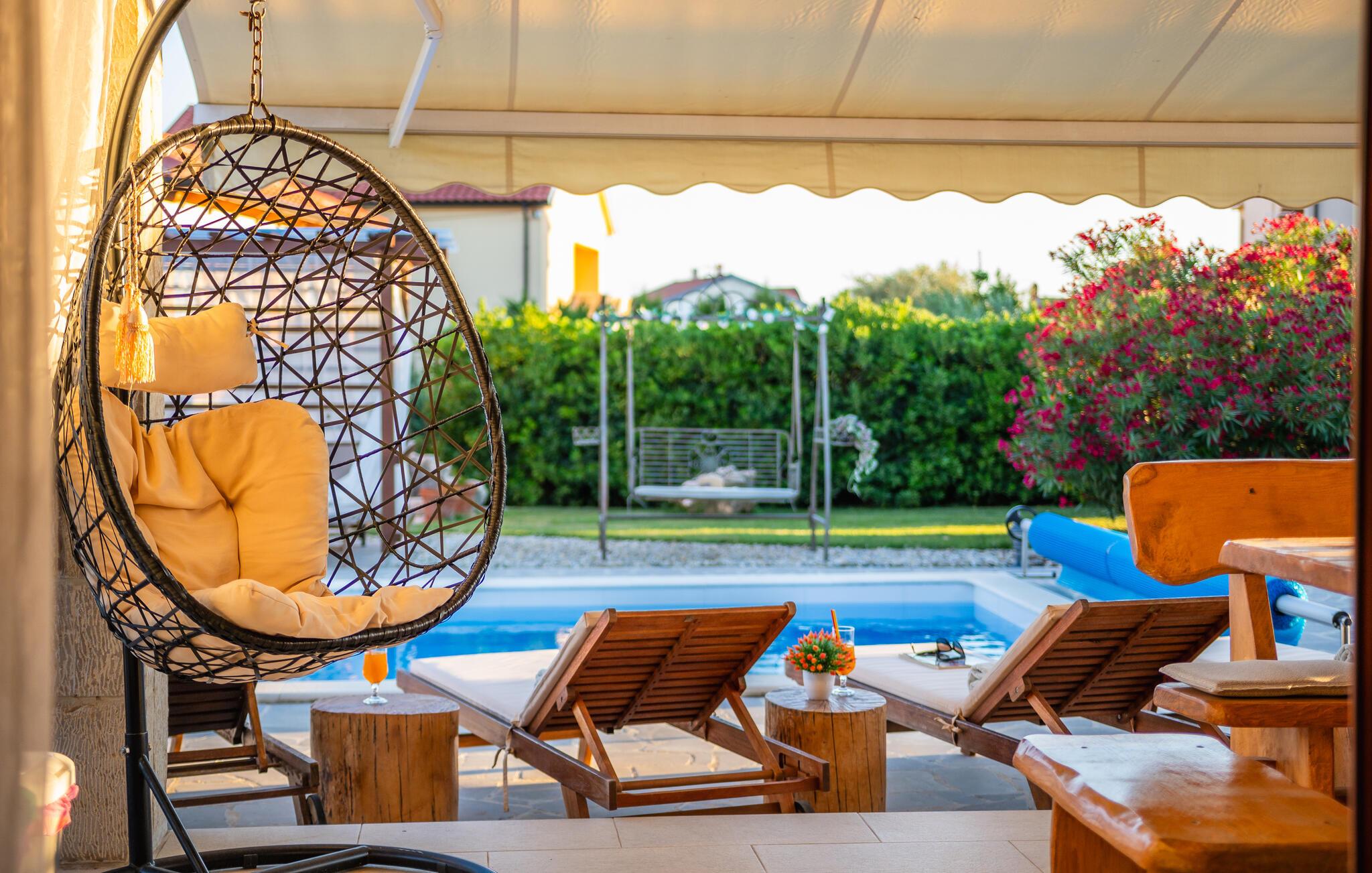 Nord for Zadar, ved den kysten med forrevne klipper, skønne bugte og skønne strande, ligger Vrsi, en lille by hvor dette feriehus med egen privat pool ligger. Huset er bygget i smuk mediterran stil og indrettet med alle former for bekvemmeligheder til et behageligt ophold. Det smagfulde interiør får jer til at slappe af fra feriens første sekund. Hop I den private pool lige når I har lyst, lav mad på grillen der står i haven og børnene kan lege og tumle sig i haven. Ud over at nyde badedage på de skønne strande og i Adriaterhavet, er her mange muligheder for en aktiv ferie. I kan cykle ad velanlagte stier, dykke ned under havets overflade, wind- eller kitesurfe og dyrke mange andre former for vandsport. Besøg også Nin, en historisk by med mange seværdigheder og en af de mange Natur- eller nationalparker i området.