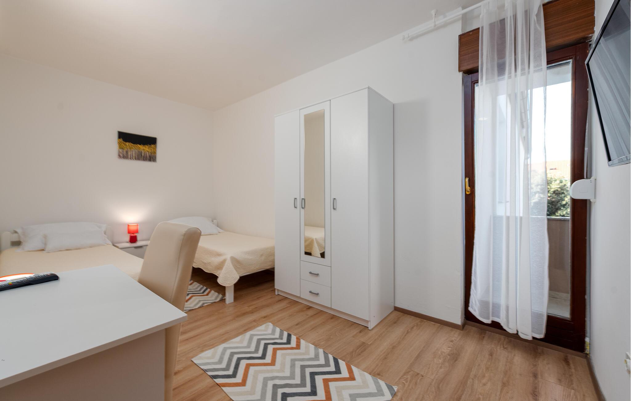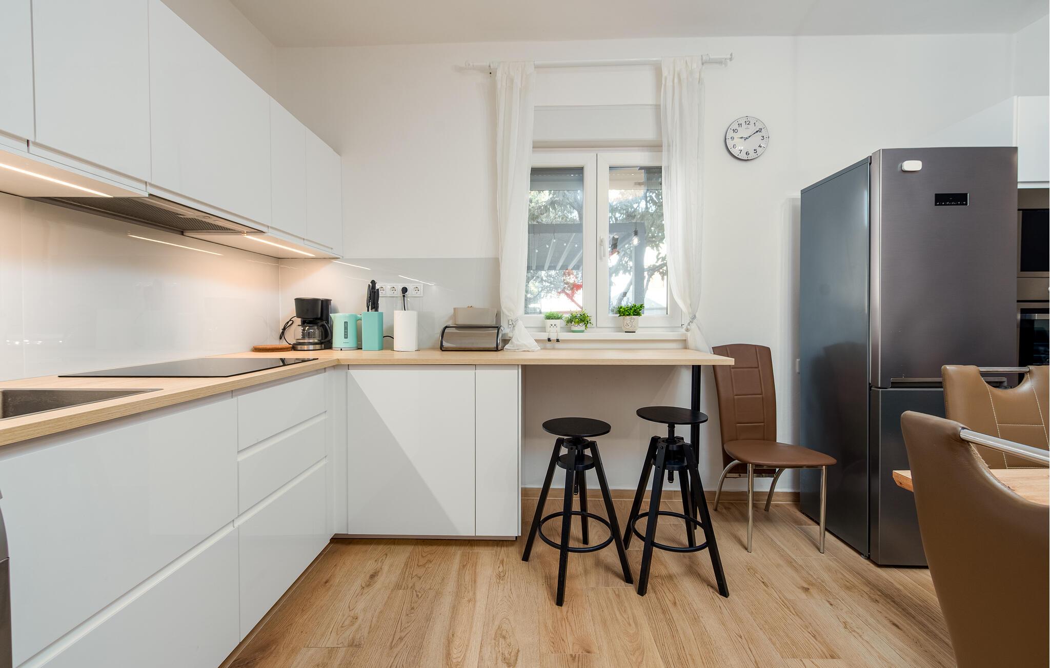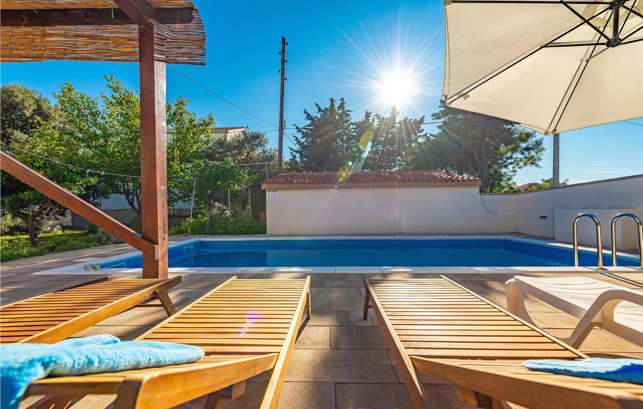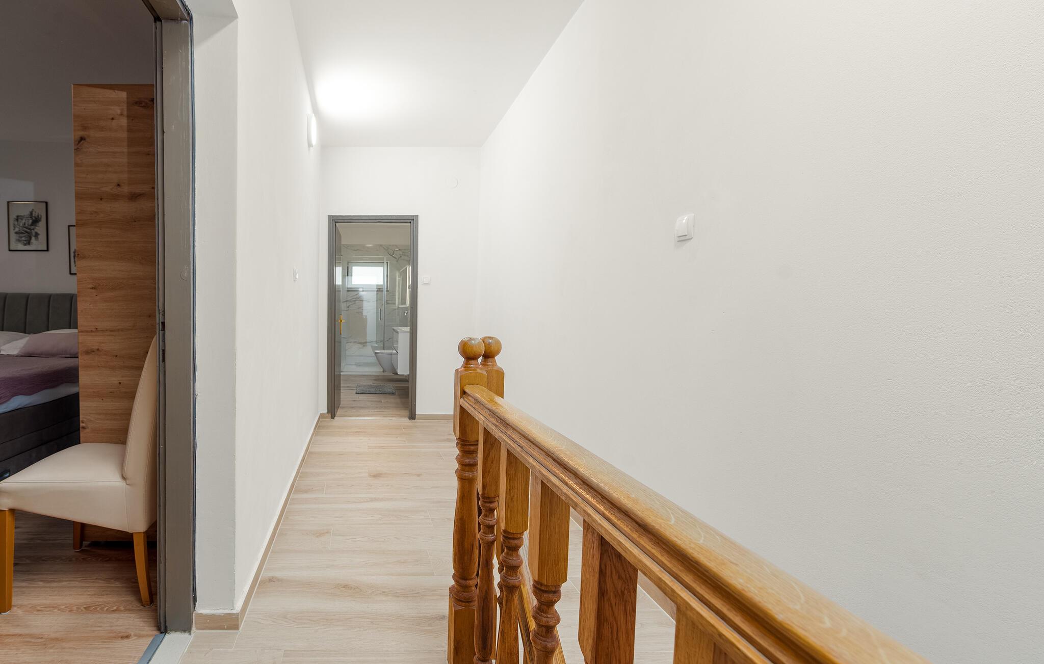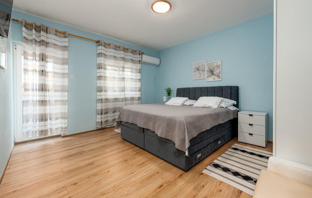 Dette praktiske feriehus ligger i byen Vrsi, i nærheden af et væld af strande. Stuen ligger i åben forbindelse med køkkenet, sammen med et badeværelse i stueplan, mens der på første sal er både to soveværelser og et badeværelse. De andre to soveværelser og det tredje badeværelse nås udefra, de ligger også på første sal. Haven indbyder til hyggeligt samvær, evt. med noget godt på tallerknerne der er lavet på grillen. Det varer kun få minutter at gå til de nærmeste strande, lidt længere væk, i byerne Nin og Privlaka, er der også sandstrande.