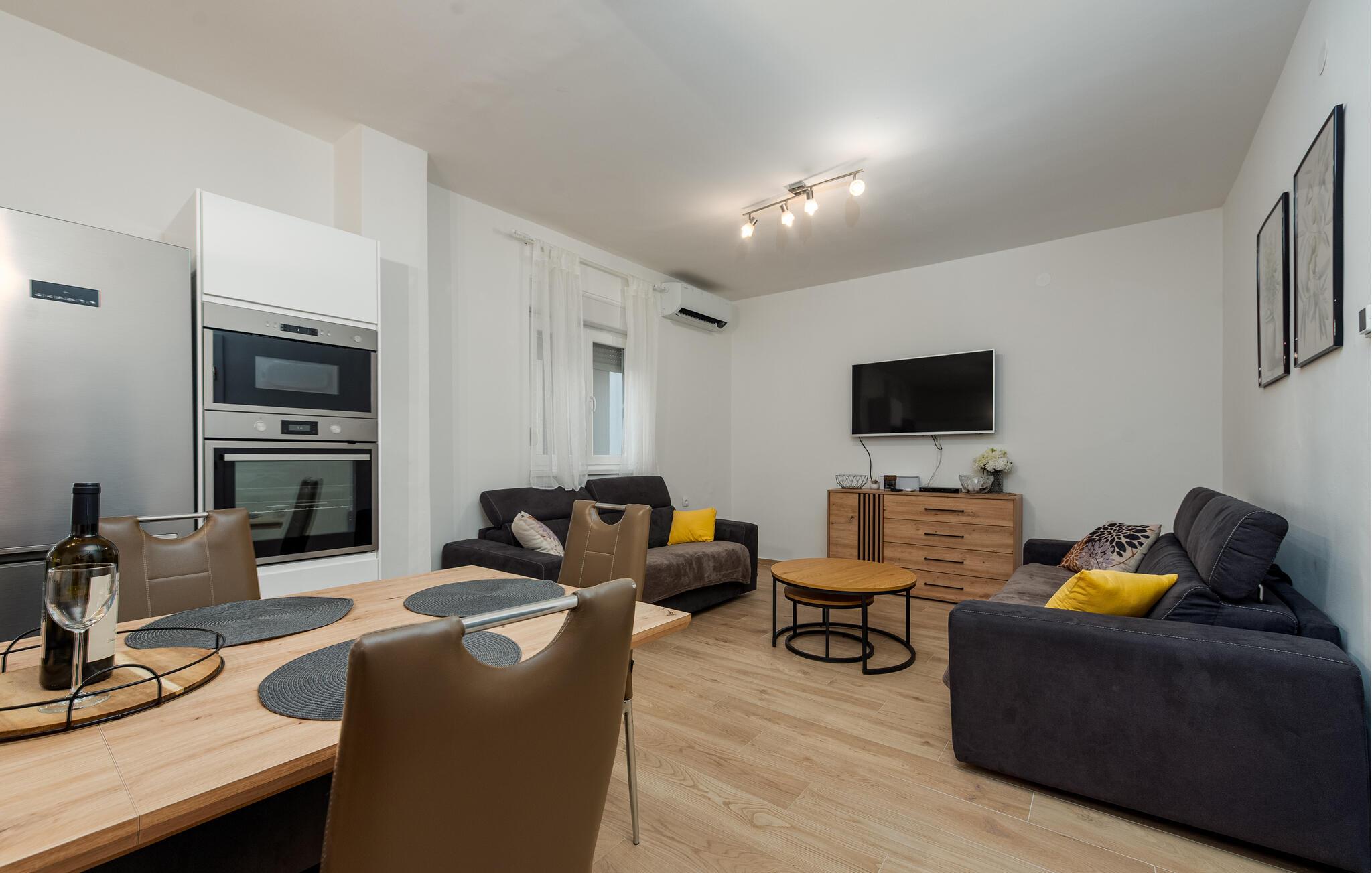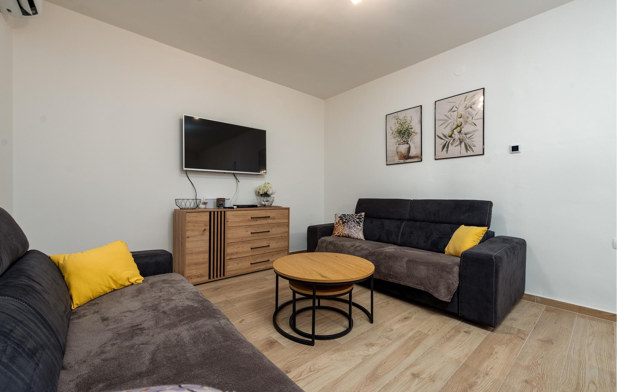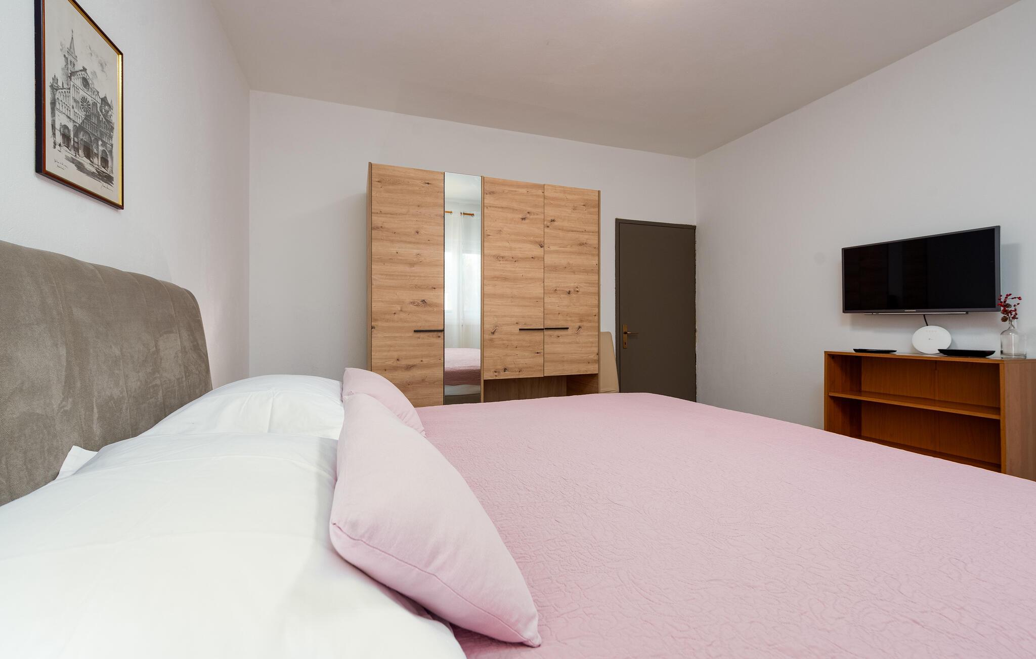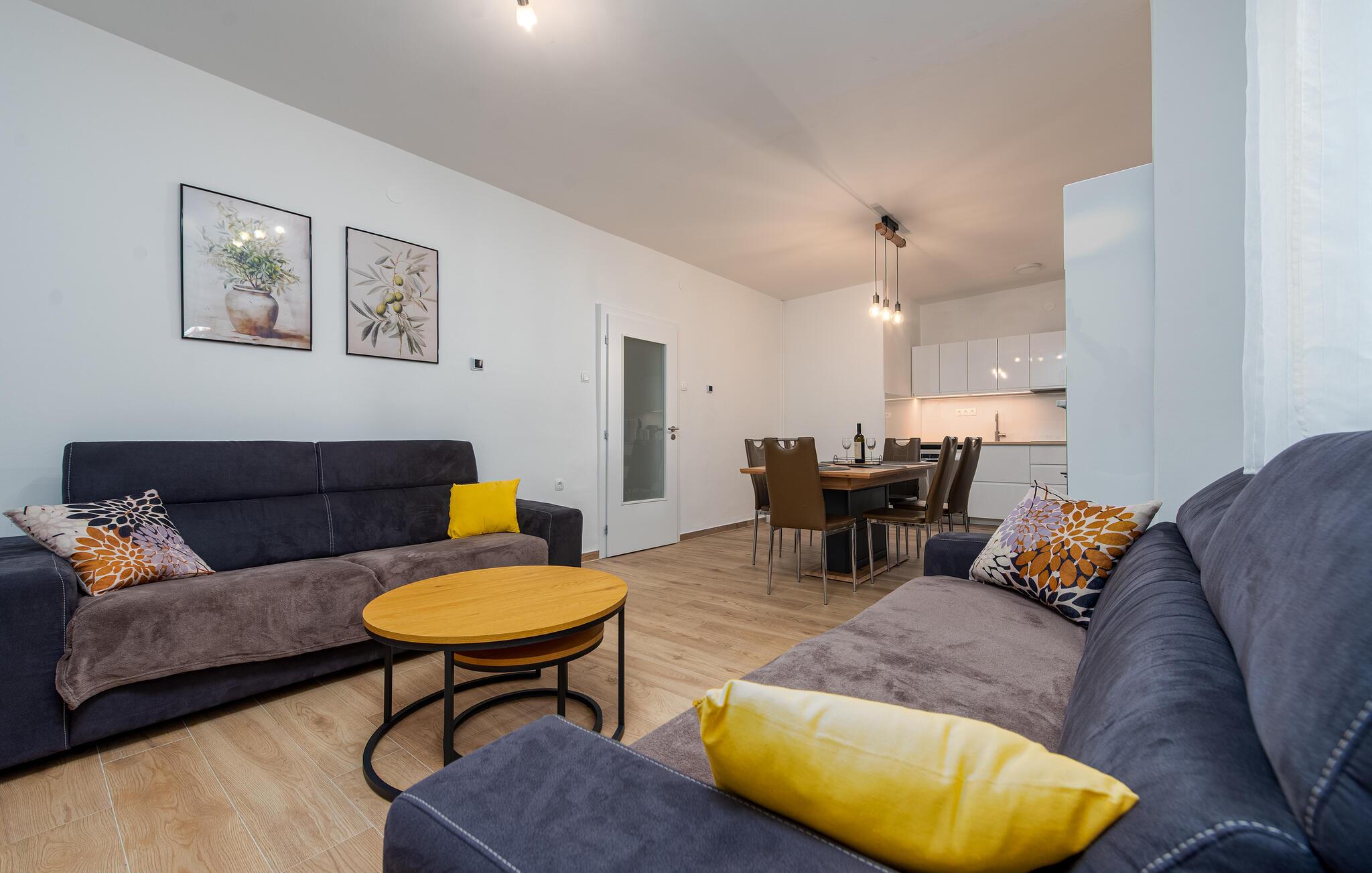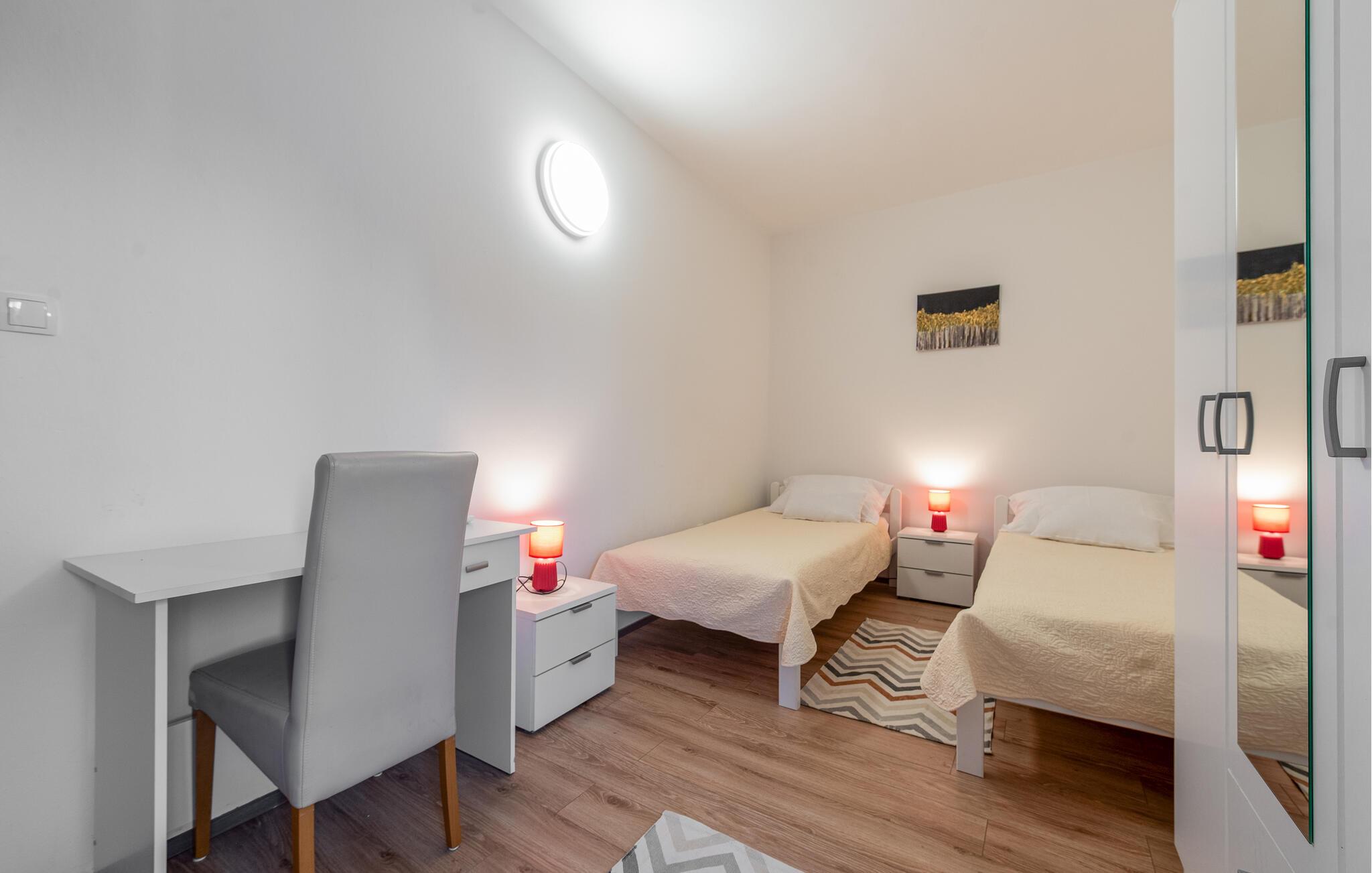 Dette praktiske feriehus ligger i byen Vrsi, i nærheden af et væld af strande. Stuen ligger i åben forbindelse med køkkenet, sammen med et badeværelse i stueplan, mens der på første sal er både to soveværelser og et badeværelse. De andre to soveværelser og det tredje badeværelse nås udefra, de ligger også på første sal. Haven indbyder til hyggeligt samvær, evt. med noget godt på tallerknerne der er lavet på grillen. Det varer kun få minutter at gå til de nærmeste strande, lidt længere væk, i byerne Nin og Privlaka, er der også sandstrande.