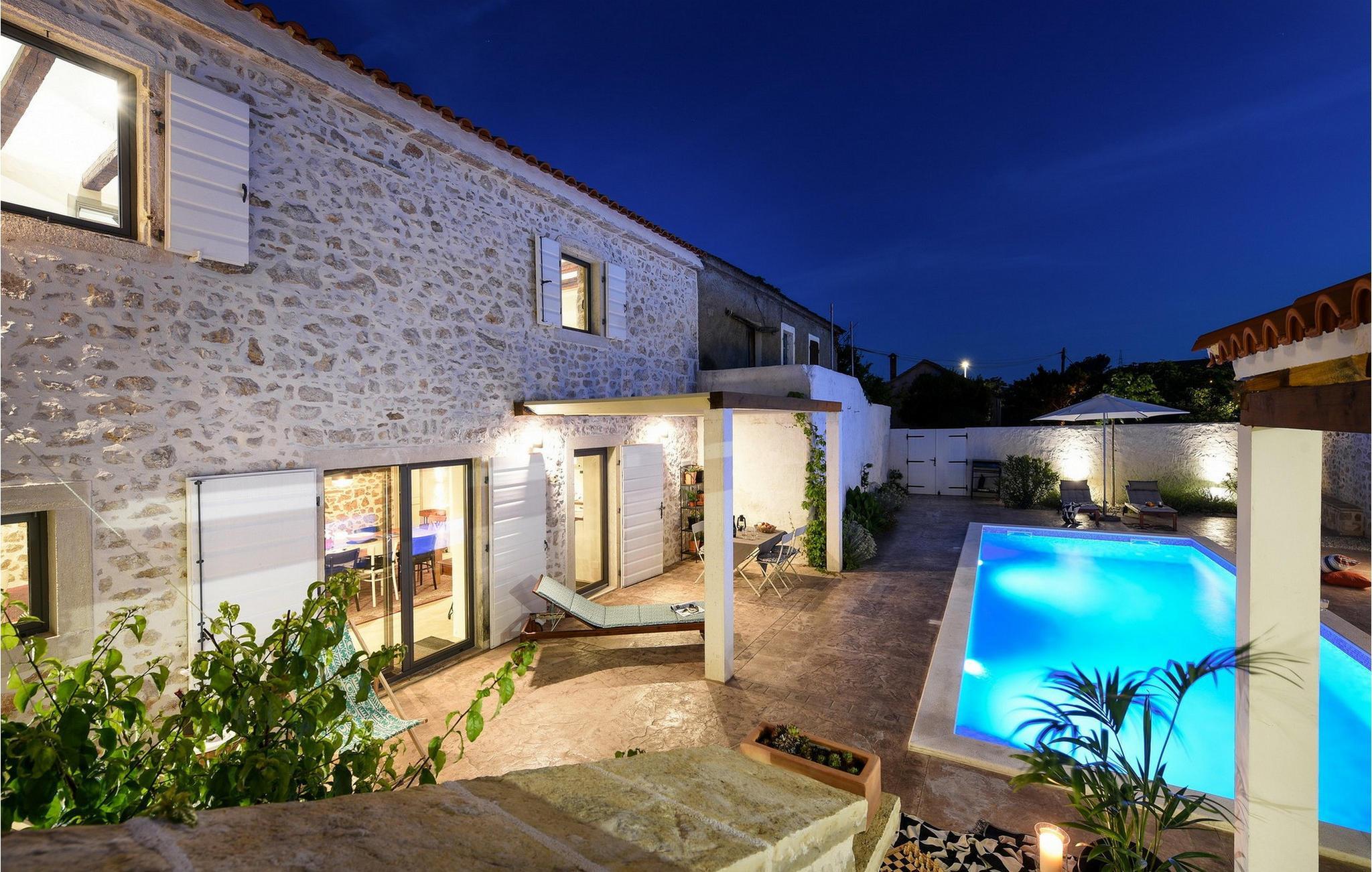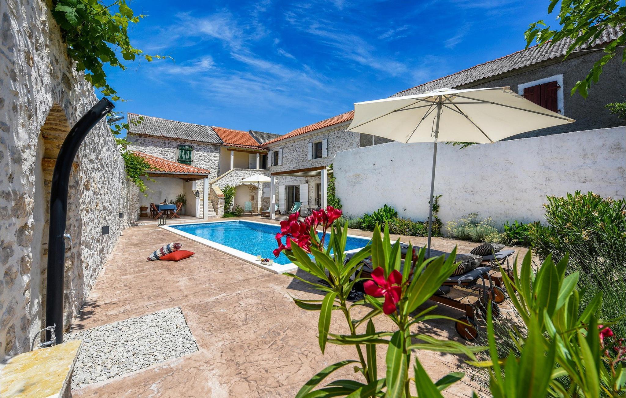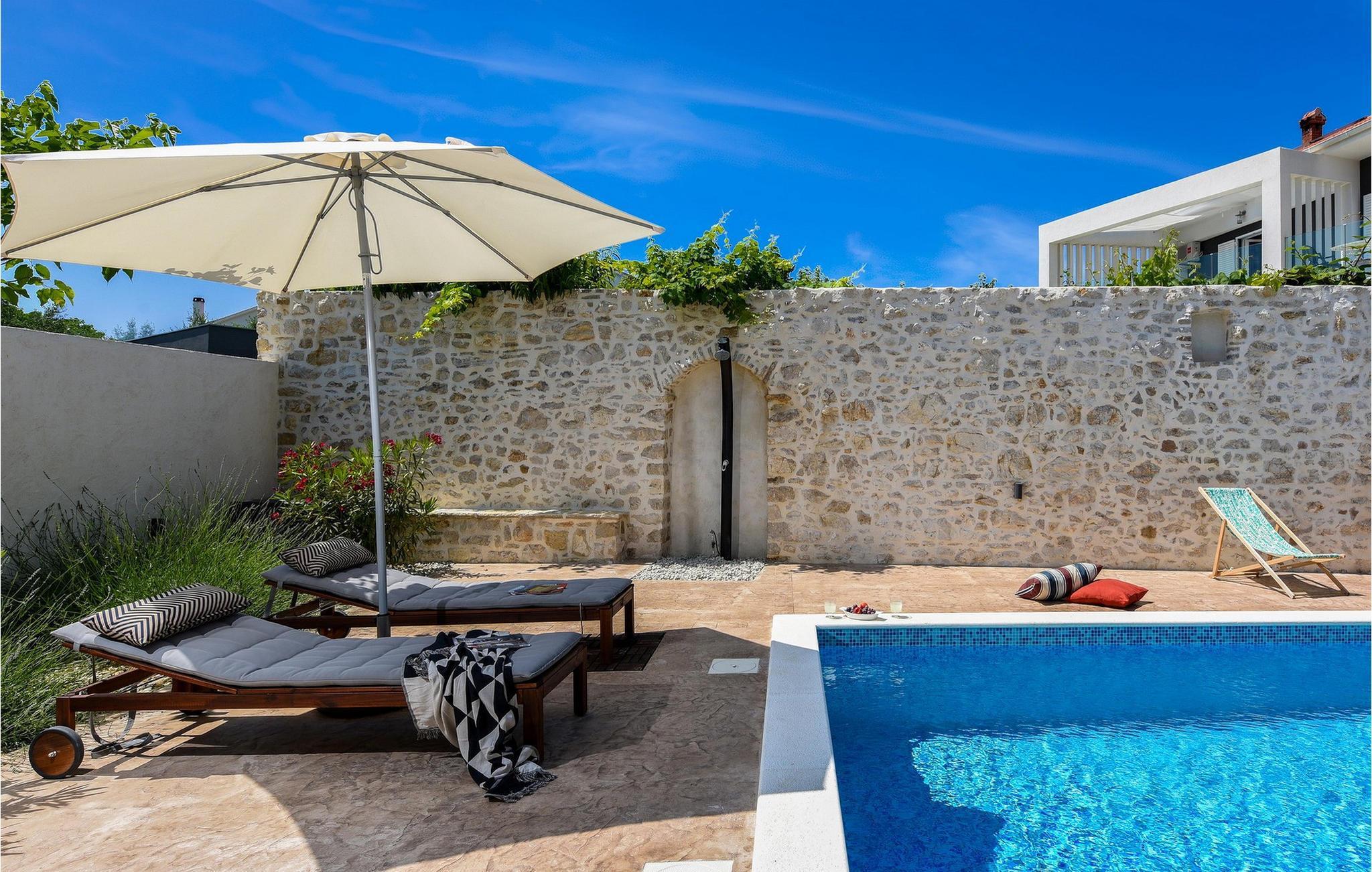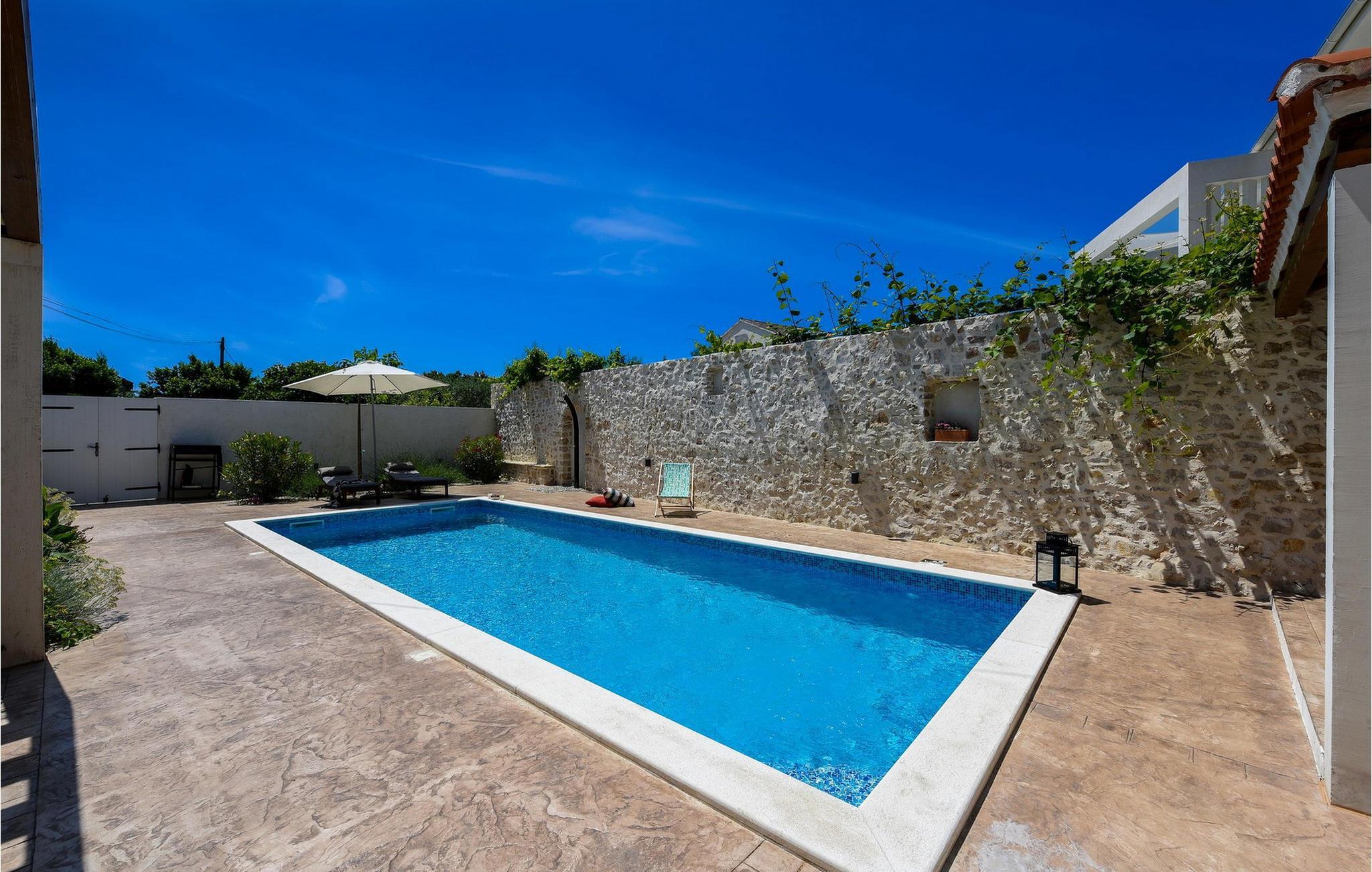 Fordyb jer i historien og afslapningen i denne charmerende villa med privat pool. Villa Dvori, kun en kort gåtur fra Nin centrum, kombinerer historisk charme med moderne komfort. Feriehuset, der oprindeligt blev bygget i 1853, udstråler en hyggelig atmosfære. Indenfor finder I en stilfuld stue, et fuldt udstyret køkken og komfortable soveværelser. Den store terrasse med opvarmet pool lægger op til en forfriskende dukkert. Grillområdet er den ideelle ramme for hyggelige aftener med familie og venner. Oplev Nins kulturelle og naturlige skatte. Den ældste kroatiske kongeby fortryller med sin rige historie og smukke sandstrande, ideelt for familier med børn. Gå en tur til den berømte Dronningestrand eller besøg de traditionelle saltsandsten og Saltmuseet. I den gamle bydel venter charmerende gyder, historiske kirker og hyggelige restauranter, der serverer dalmatiske specialiteter. Nærheden til Zadar giver også mulighed for spændende dagsture til den livlige kystby. Bemærk: Ejendommen accepterer ikke ungdomsgrupper under 30 år eller polterabender. Bookinger fra sådanne grupper vil blive afvist, selv ved ankomst eller under opholdet, uden refusion.
