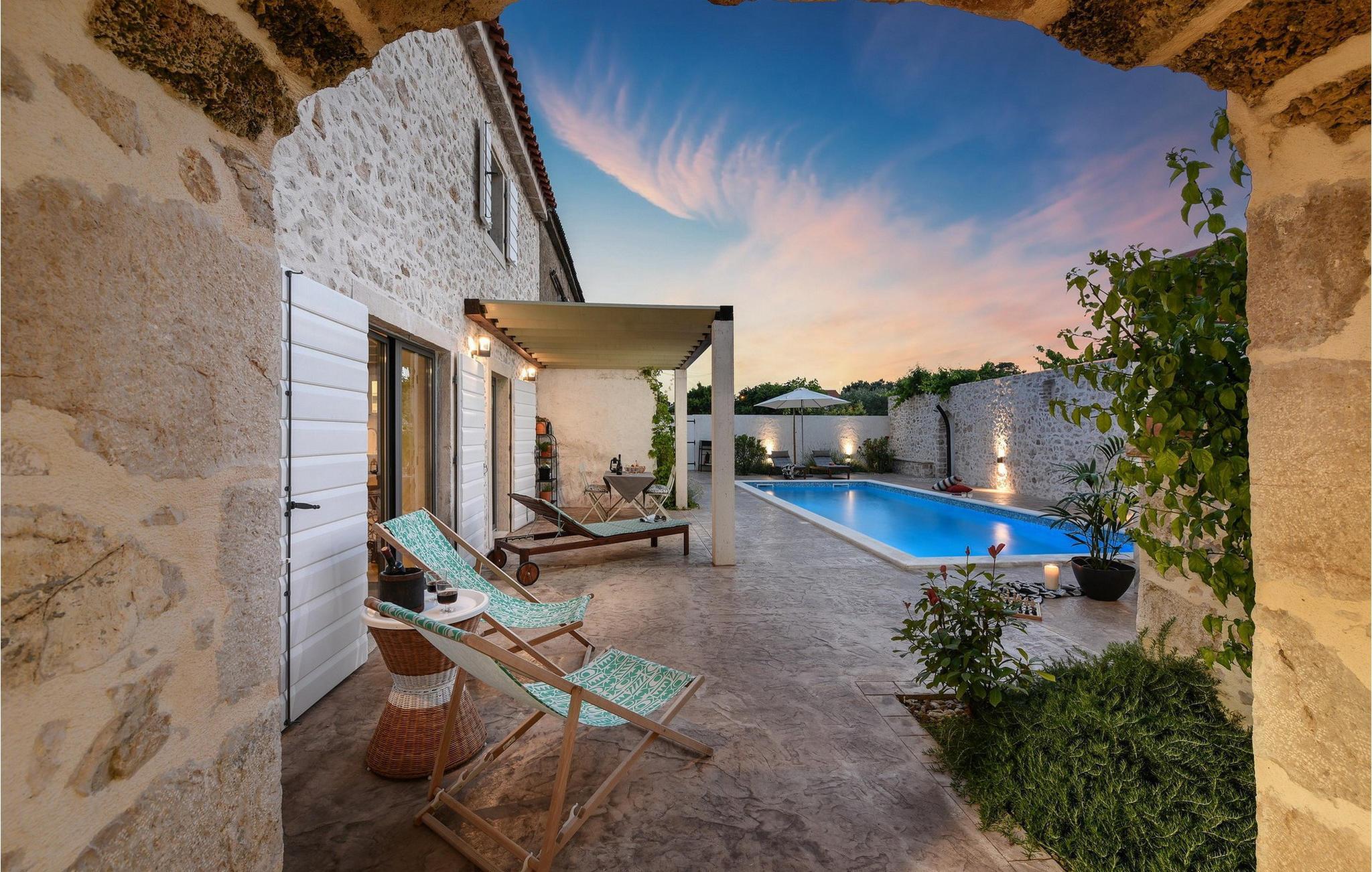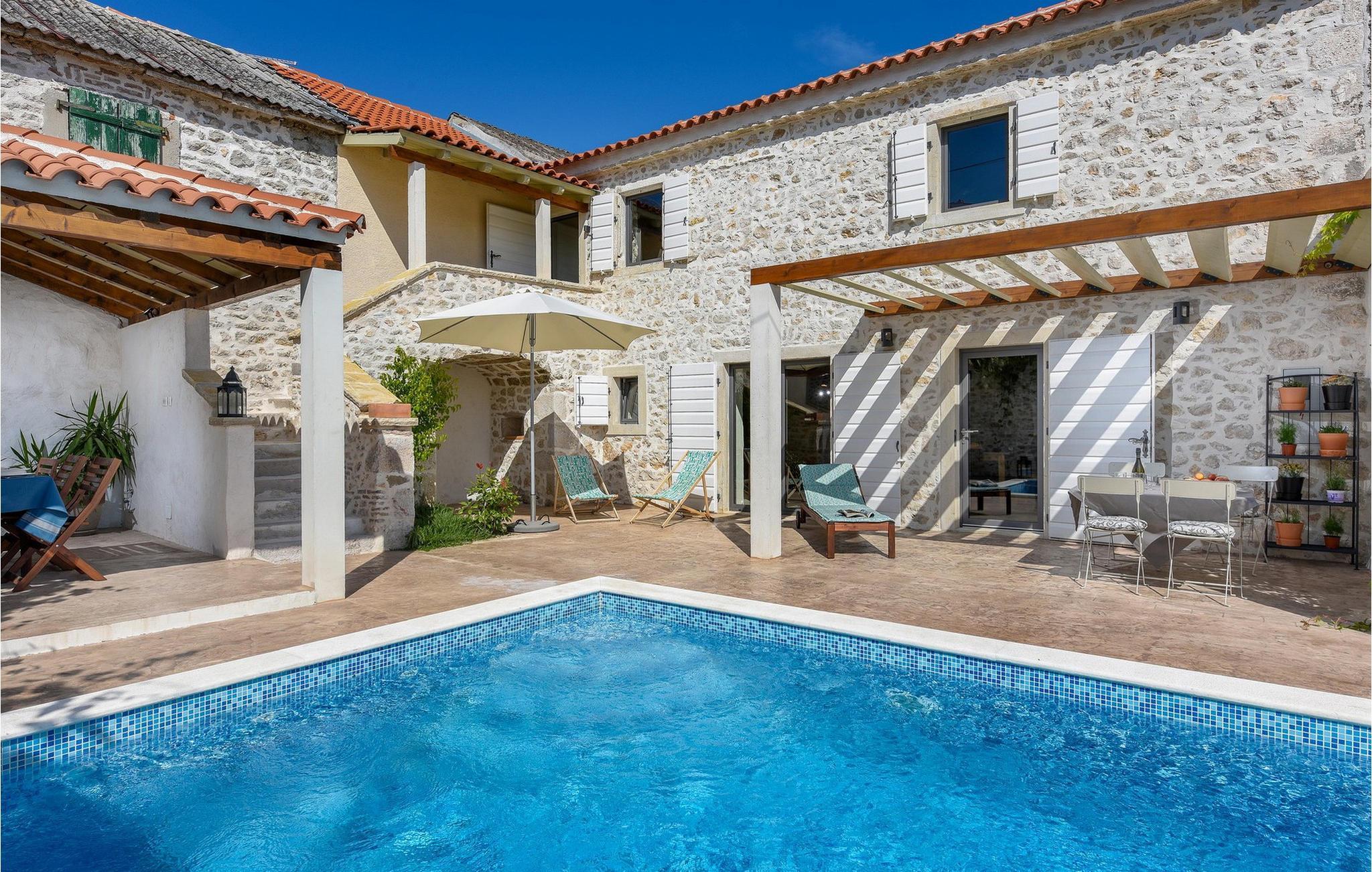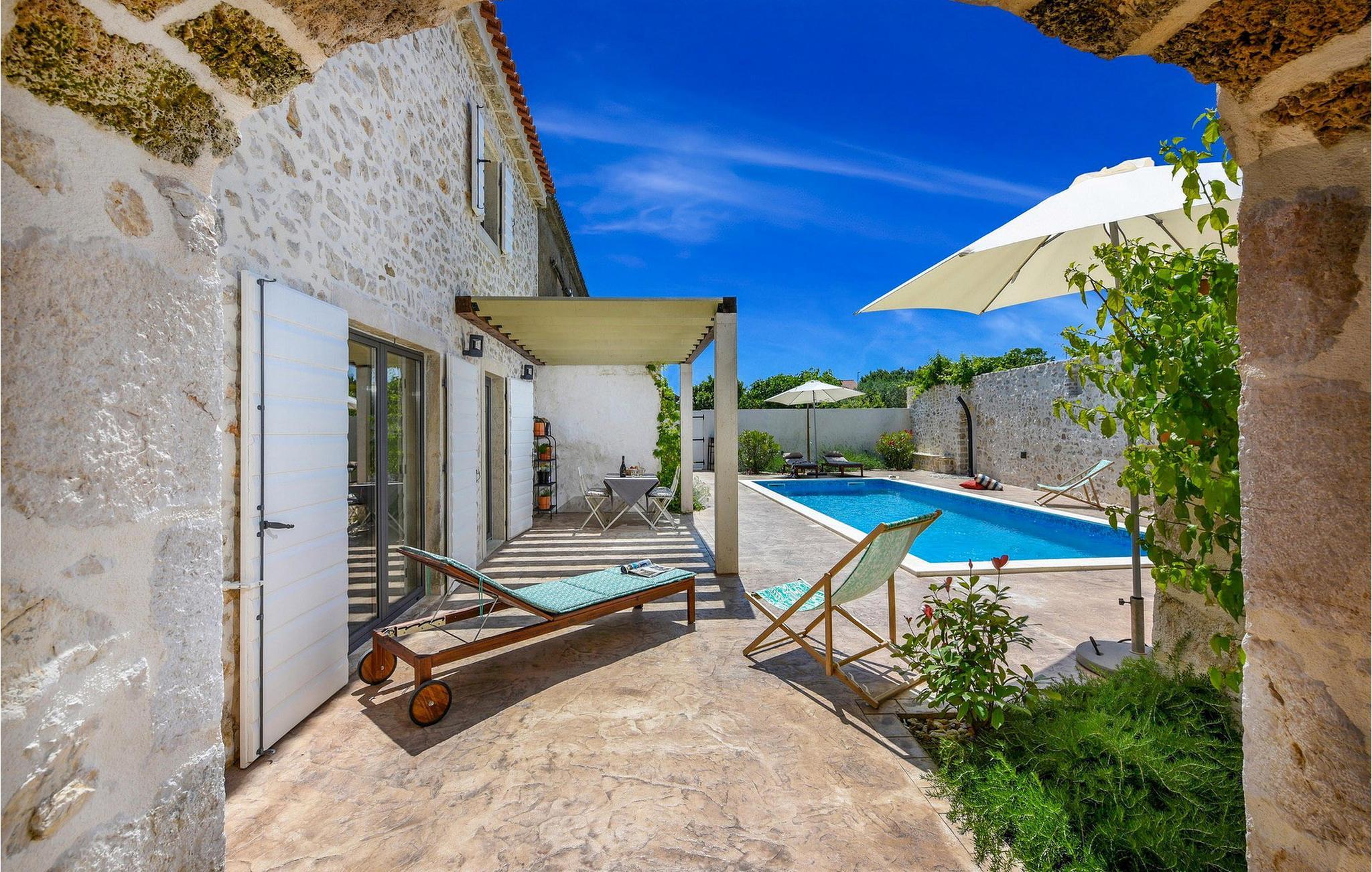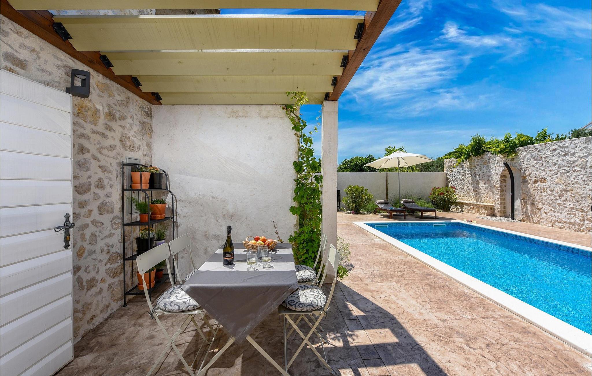 Fordyb jer i historien og afslapningen i denne charmerende villa med privat pool. Villa Dvori, kun en kort gåtur fra Nin centrum, kombinerer historisk charme med moderne komfort. Feriehuset, der oprindeligt blev bygget i 1853, udstråler en hyggelig atmosfære. Indenfor finder I en stilfuld stue, et fuldt udstyret køkken og komfortable soveværelser. Den store terrasse med opvarmet pool lægger op til en forfriskende dukkert. Grillområdet er den ideelle ramme for hyggelige aftener med familie og venner. Oplev Nins kulturelle og naturlige skatte. Den ældste kroatiske kongeby fortryller med sin rige historie og smukke sandstrande, ideelt for familier med børn. Gå en tur til den berømte Dronningestrand eller besøg de traditionelle saltsandsten og Saltmuseet. I den gamle bydel venter charmerende gyder, historiske kirker og hyggelige restauranter, der serverer dalmatiske specialiteter. Nærheden til Zadar giver også mulighed for spændende dagsture til den livlige kystby. Bemærk: Ejendommen accepterer ikke ungdomsgrupper under 30 år eller polterabender. Bookinger fra sådanne grupper vil blive afvist, selv ved ankomst eller under opholdet, uden refusion.