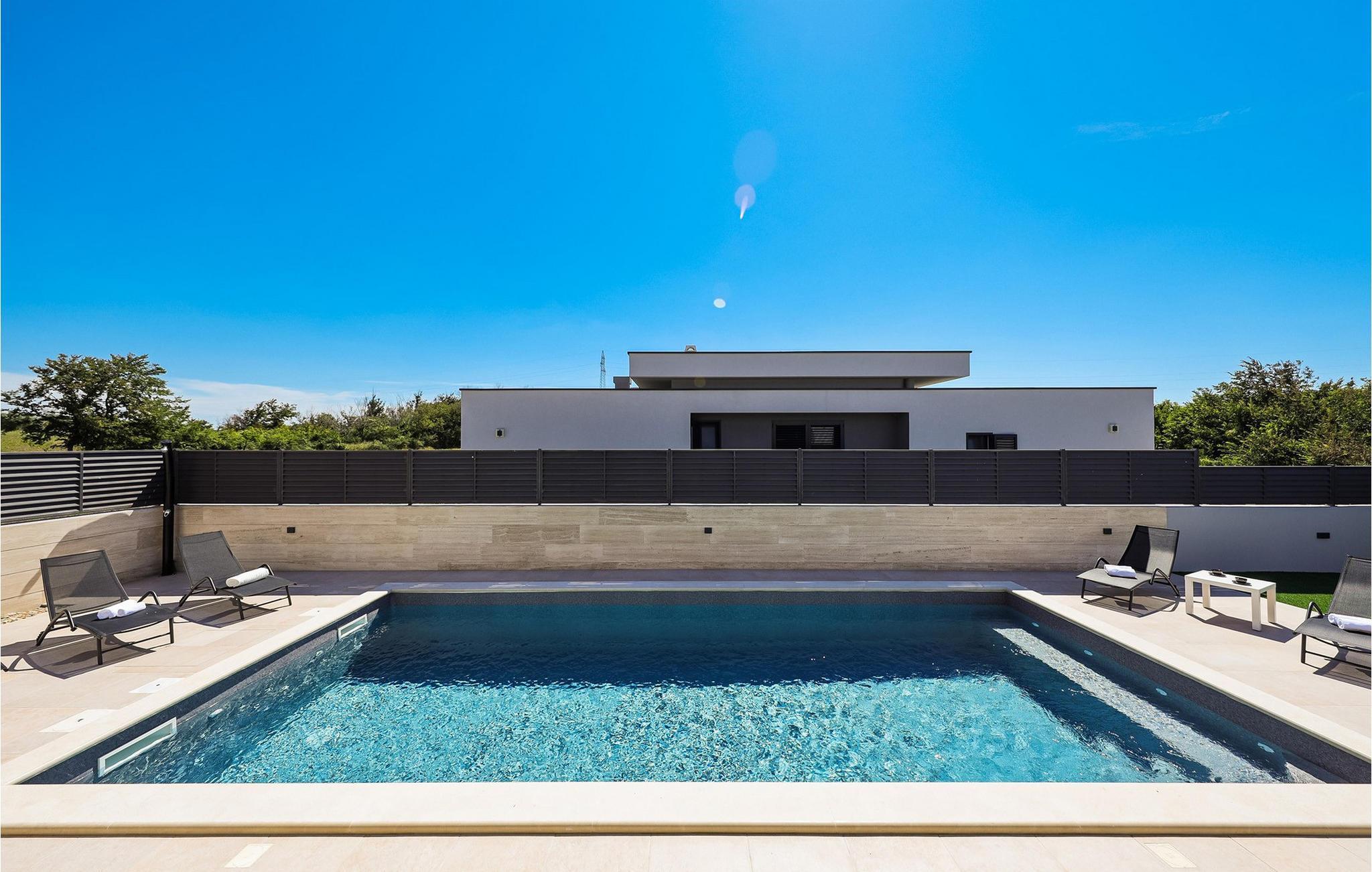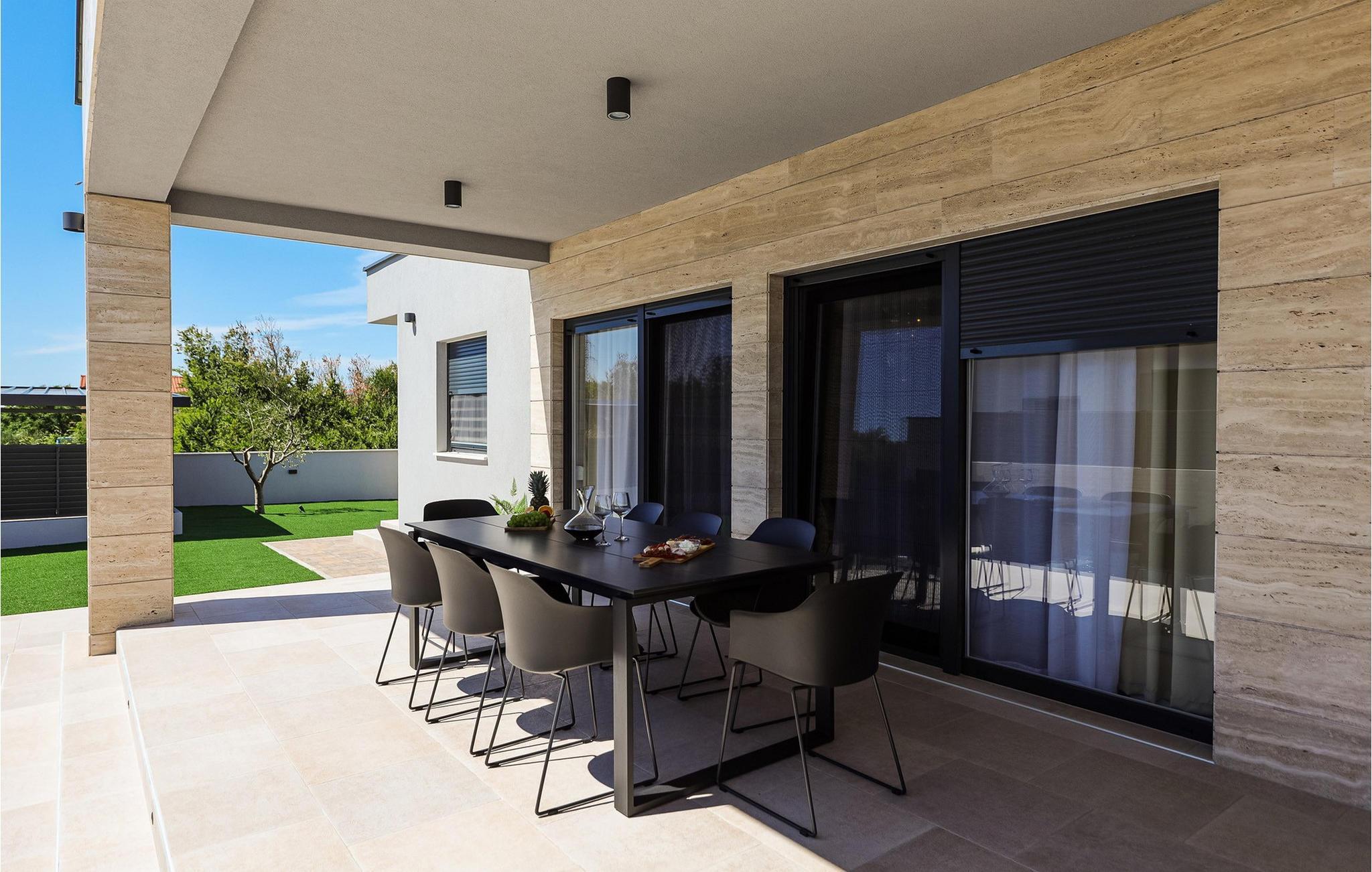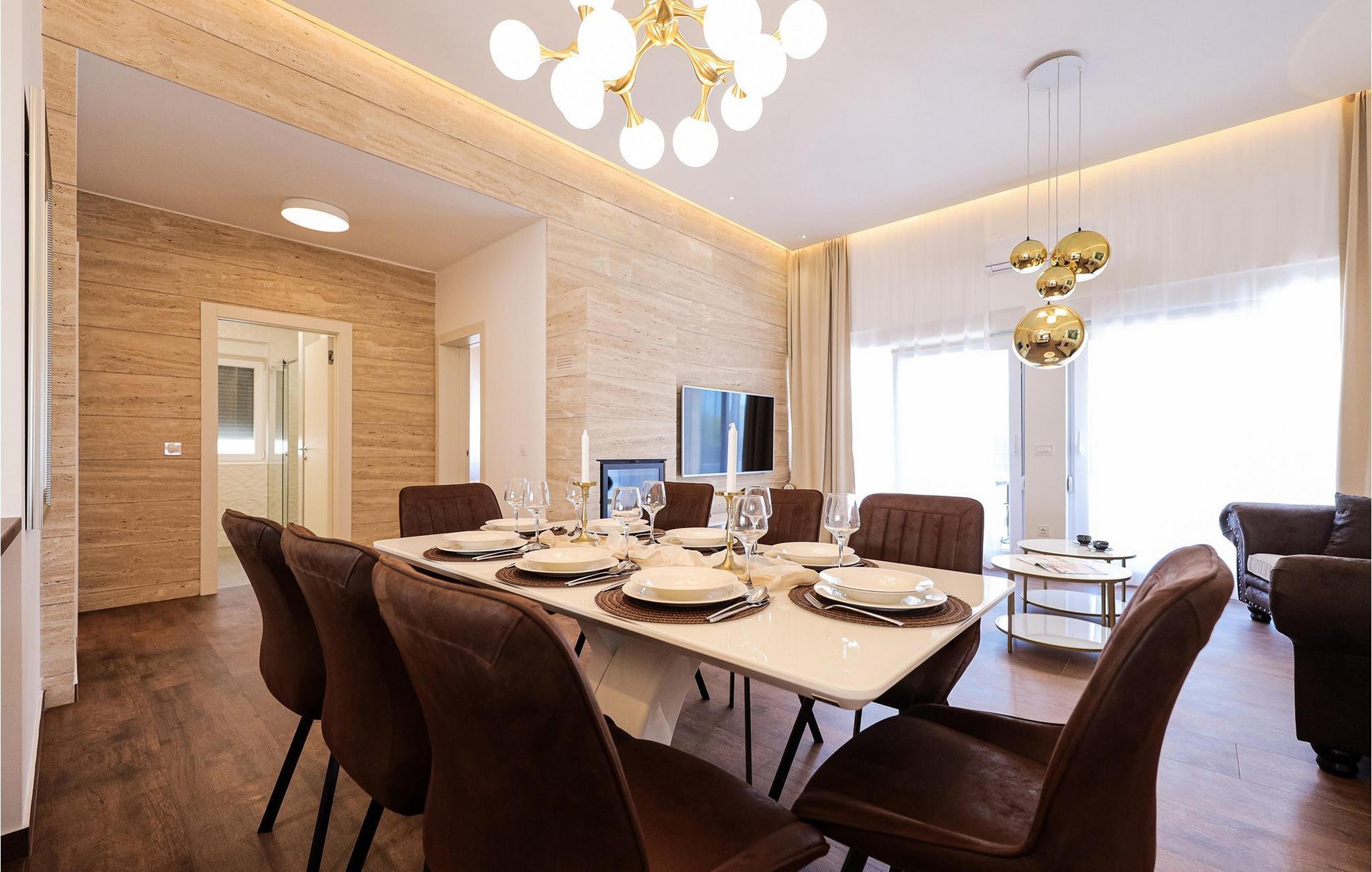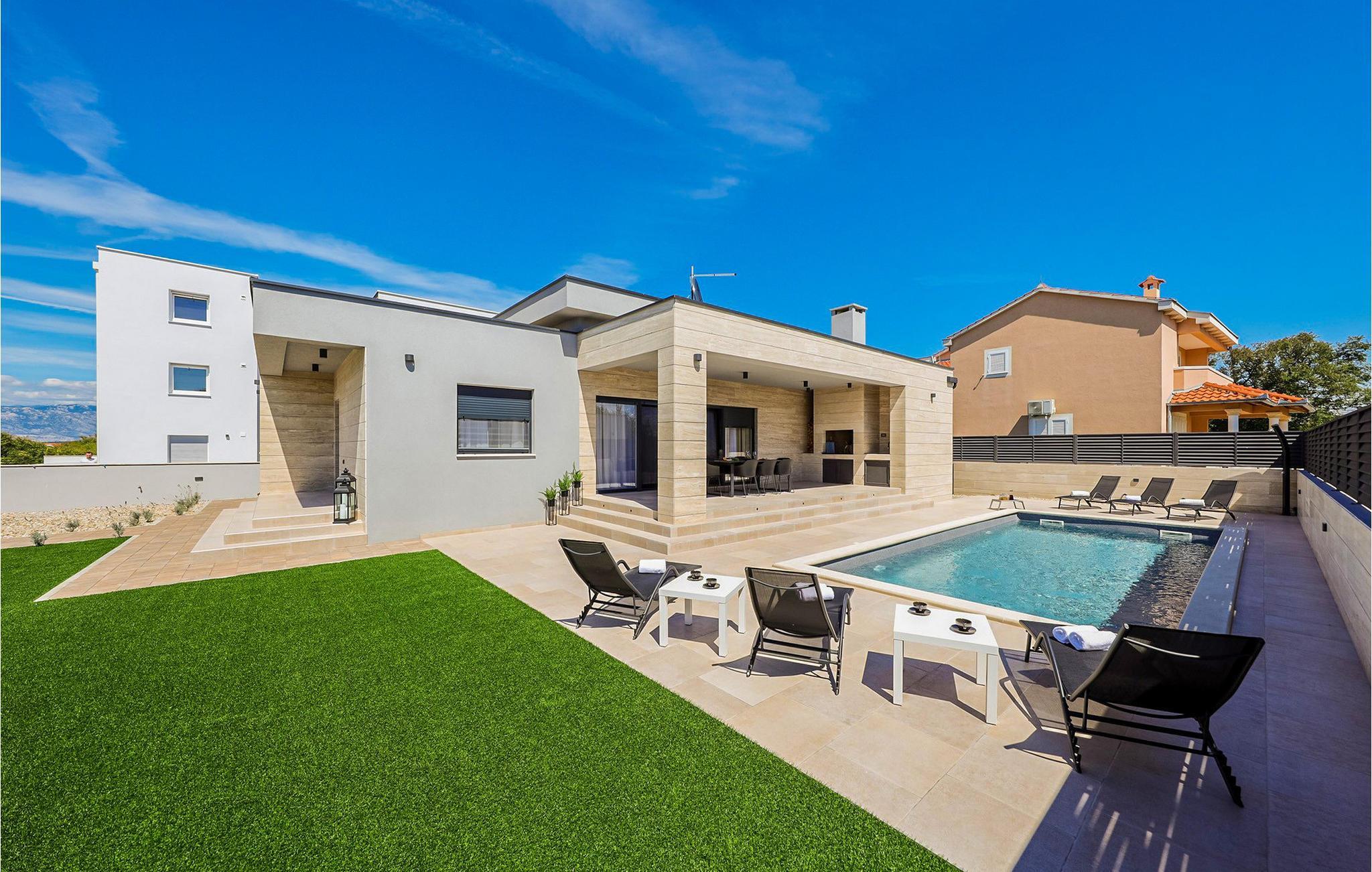 Tilbring en ubekymret ferie i dette eksklusive feriehus nær havet med pool. De smukke opholdsrum i Villa Anlero er noget særligt med en vellykket kombination af moderne design og varme træoverflader, hvilket skaber en stilfuld atmosfære. Rummelige sofaer lægger op til at slappe af, mens den elegante spiseplads med sit store bord er ideel til fælles måltider. Diskrete belysningsdetaljer og smagfulde detaljer skaber en behagelig atmosfære, der er både luksuriøs og hyggelig. Det åbne design giver jer mulighed for at lave mad, spise og slappe af sammen uden at gå på kompromis med udsigten til naturen. En opvarmet swimmingpool venter jer i haven, hvor I kan snuppe en frisk dukkert eller svømme afslappende baner. Bagefter kan I slappe af på en af de komfortable liggestole omkring poolen. børnene kan hoppe på trampolinen eller lege på legepladsen efter hjertens lyst. Der er et udendørs spiseområde til fælles måltider, og I kan tilberede lækre måltider under åben himmel på trækulsgrillen. Tilbring jeres dage på Kraljicina-stranden, der er værdsat for sit helbredende mudder og udsigten over Velebit-bjergene. Eller nyd tiden med familien på den nærliggende Ninska Laguna-strand. Prøv regionale specialiteter i Nins restauranter og taverner, og bliv bekendt med det dalmatiske køkken. Området byder på en række aktiviteter – lige fra cykling, sejlads og ridning til vinture, olivenoliesmagninger eller et besøg på Saltmuseet. Udflugter til Plitvicesøerne, byen Zadar eller øerne i Zadar-øgruppen er også tilgængelige, hvilket gør jeres ophold endnu mere varieret.