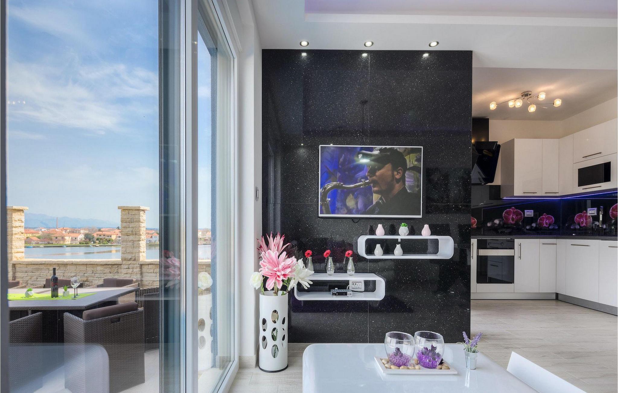 Denne villas unikke karakter er også brugen af den private båd fortøjning lige foran huset. Den maleriske by Nin er beliggende i en lavvandet lagune omgivet af klart hav, i omfavnelsen af lange naturlige sandstrande og forbundet med fastlandet af to stenbroer fra 1500-tallet. Denne lille by, hvis historie rækker tre tusinde år tilbage, er den ældste kroatiske kongeby, den kroatiske kulturs vugge og det første politiske, religiøse og kulturelle centrum i middelalderens Kroatien, som efterlod os adskillige monumenter i området. Byen med den mindste katedral i verden er et af de rigeste arkæologiske fund i Kroatien i dag. Det er også en af de førende destinationer inden for sundhedsturisme.