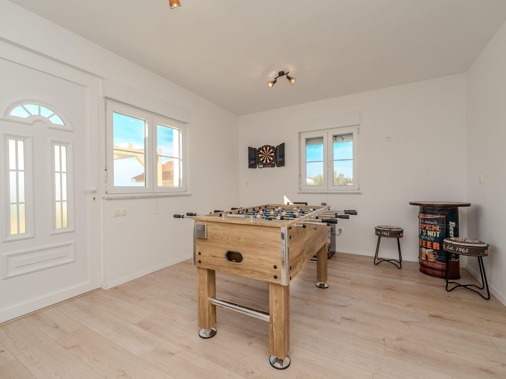 On the ground floor, the flat is divided into a living room with a fully equipped kitchen and dining room, a bedroom with a double bed and a bedroom with two single beds and a bathroom with a shower. The living room has a sofa bed for two people. The flat has a 10 m² covered terrace with table and chairs. On the first floor the flat has a living room with fully equipped kitchen and dining room, a bedroom with double bed and a bedroom with two single beds and a bathroom with shower. Flat includes a 10 m² covered balcony with partial sea view, table and chairs. All rooms are air-conditioned. At the back of the property there is a games room with darts, table football and a children's corner and in the courtyard there is a basketball court, football, trampoline, children's playground, swing, gazebo with table and chairs, barbecue, deckchairs and a parasol.