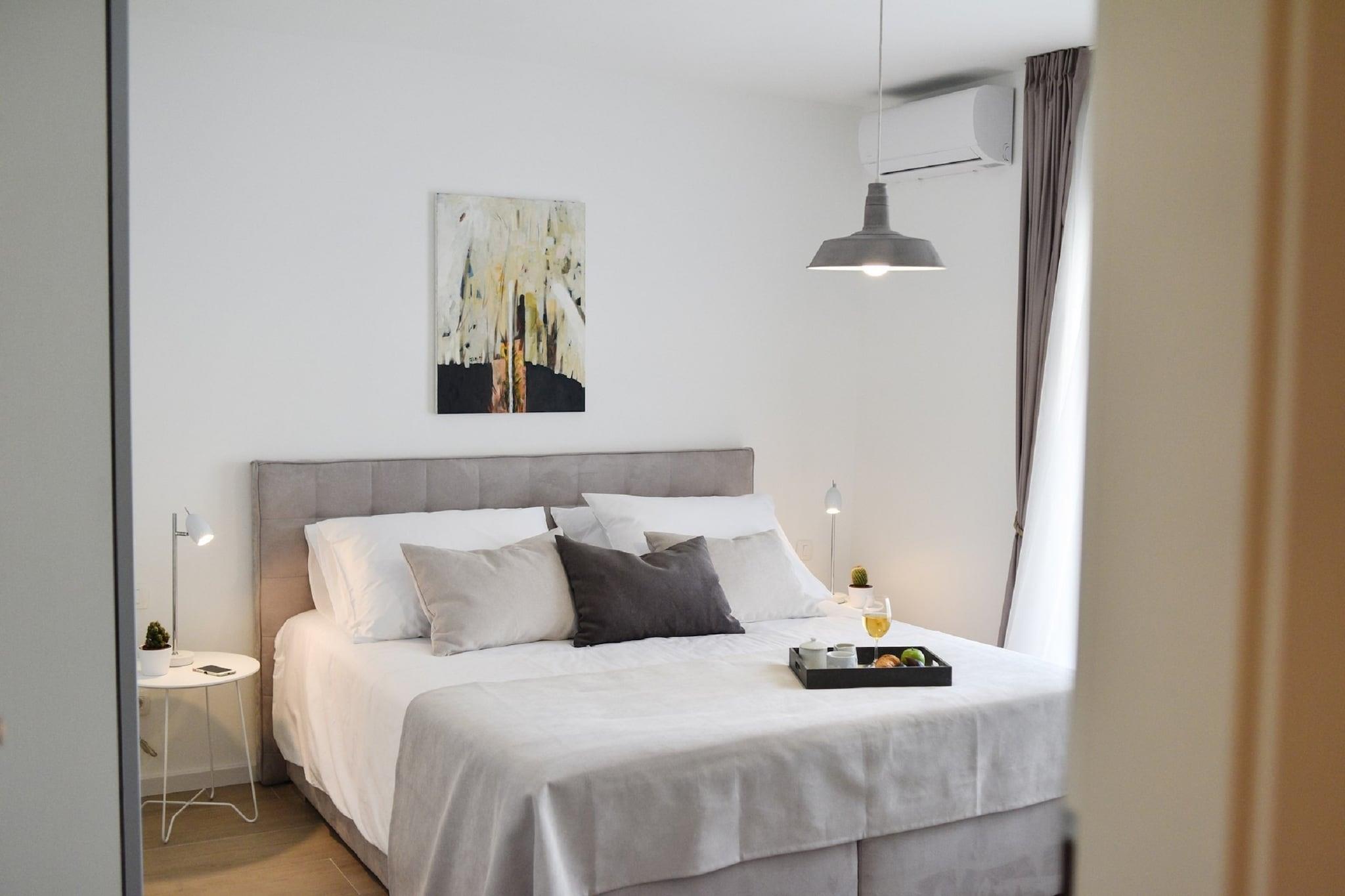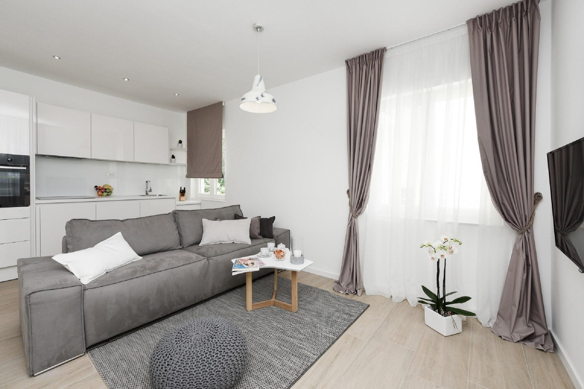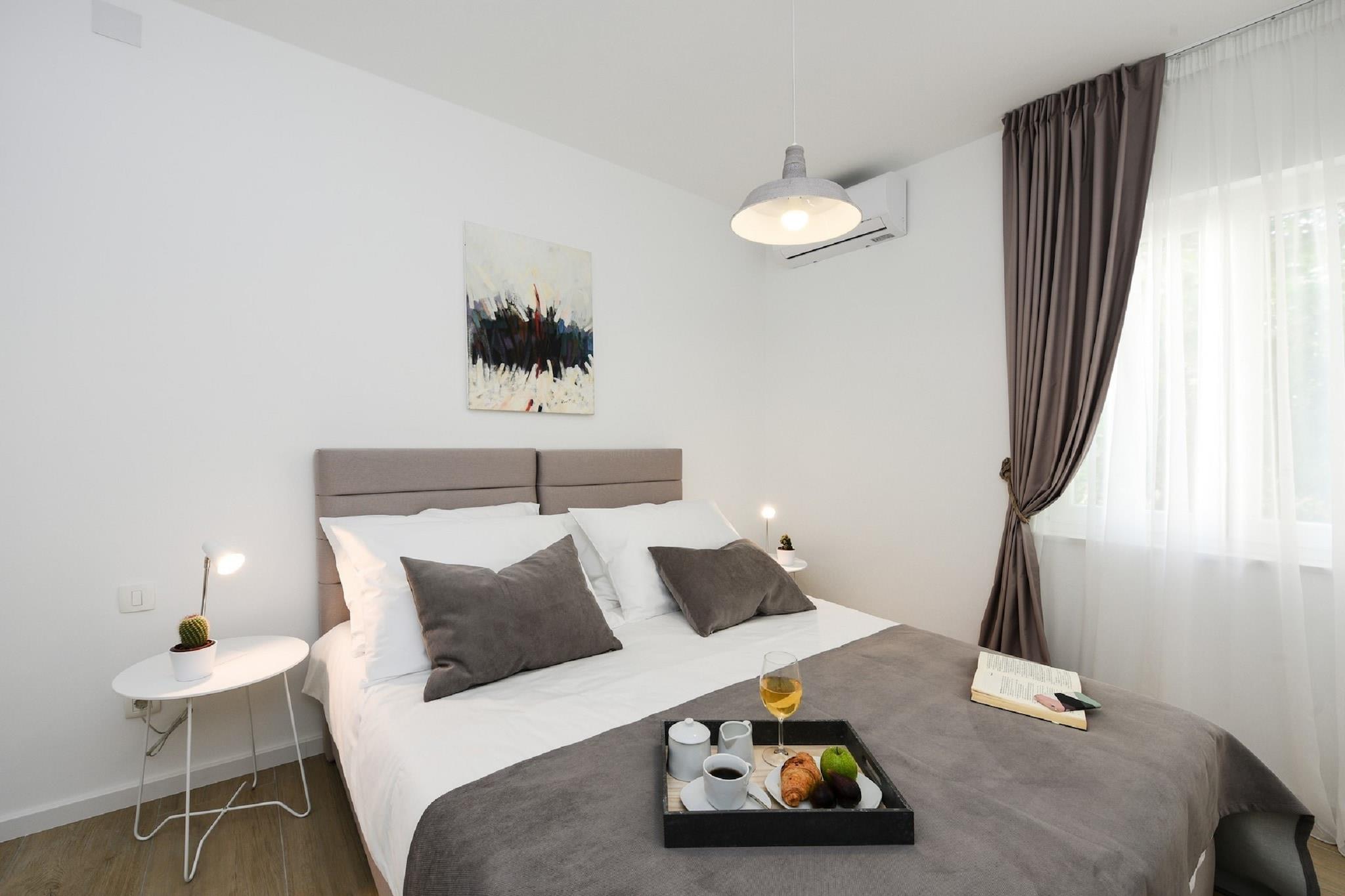 Denne villa lejlighed med overdækket terrasse og fantastisk havudsigt er beliggende i det lille historiske sted Nin. Din fritliggende villa tilbyder komplet komfort, luksuriøse møbler, fuldt udstyret køkken og stue, rummelige og attraktive soveværelser og luksuriøse badeværelser. Indkvartering er det ideelle sted for en afslappende ferie tæt på havet. Intet er et godt sted for folk, der ønsker at nyde den dynamiske ferie og det lokale køkken. Smukke sandstrande og terapeutisk mudder fundet ved strande gør Nin til en af de førende destinationer inden for medicinsk turisme. Der er masser af muligheder for adrenalin-elskere, der omfatter vandsport, organiserede dykkerbaner, vindsurfing og sejlads.