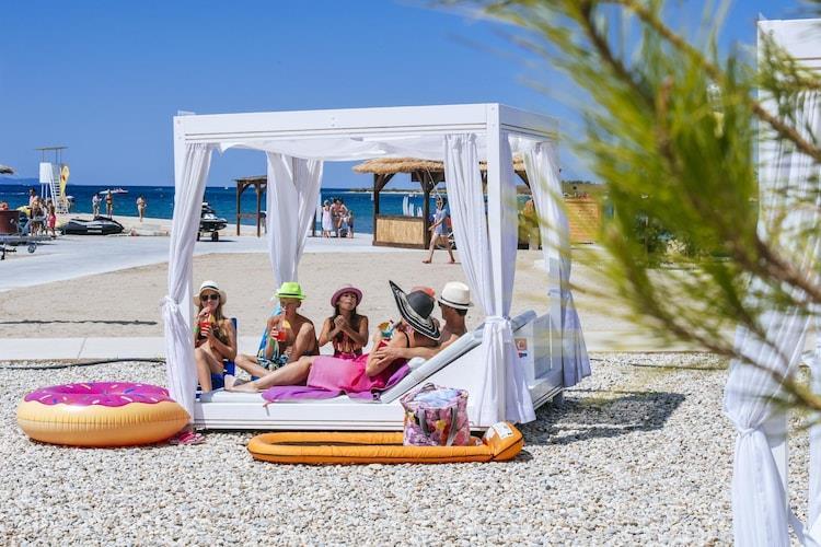 Campingvognspark i en lang, beskyttet bugt nær landsbyerne Nin og Zaton på en 100 hektar stor grund med fyrretræer. Den cirka to kilometer lange og let skrånende sandstrand er også ideel for børn og ikke-svømmere. Siden sommeren 2017 har det familievenlige kompleks fået nyt poolområde med i alt 7 pools på 2.100 kvadratmeter. De fleste af kompleksets faciliteter er placeret på Kalelarga (Corso), feriestedets gågade, som udvikler en munter dynamik med mennesker fra hele verden fra morgen til aften. I komplekset er der udover disse faciliteter frugt- og grøntsagsboder, konfekture, isbar, bageri og klimatiseret à la carte-restaurant med stor terrasse på stranden. Lige ved stranden ligger også MORE forlystelsescenter med dansemusik, mens du i amfiteatret kan nyde et farverigt animationsprogram og udendørs koncerter. Højdepunkter inkluderet: besøgendes skat, sengelinned, håndklæder, WiFi, parkeringsplads. Aktiviteter i nærheden: Gratis: joggingsti, børneunderholdning i mini (3 - 6), maxi (7 - 10) og teenagerklub (11 - 15 år), svømmeskole. Mod betaling: adventuregolf, minigolf, parasailing, dykkerskole, vandsportscenter, fitnesscenter, massage. Zaton Holiday Resorts tenniscenter har i alt 12 grusbaner, hvoraf fire er oplyste. Der er også en tennisskole for interesserede begyndere. Leje af liggestol og parasol på stranden. Mobilitet: Ikke egnet til personer med begrænset mobilitet. Morgenmad og halvpension: kan bestilles på stedet, i buffetrestauranten, børnerabatter.