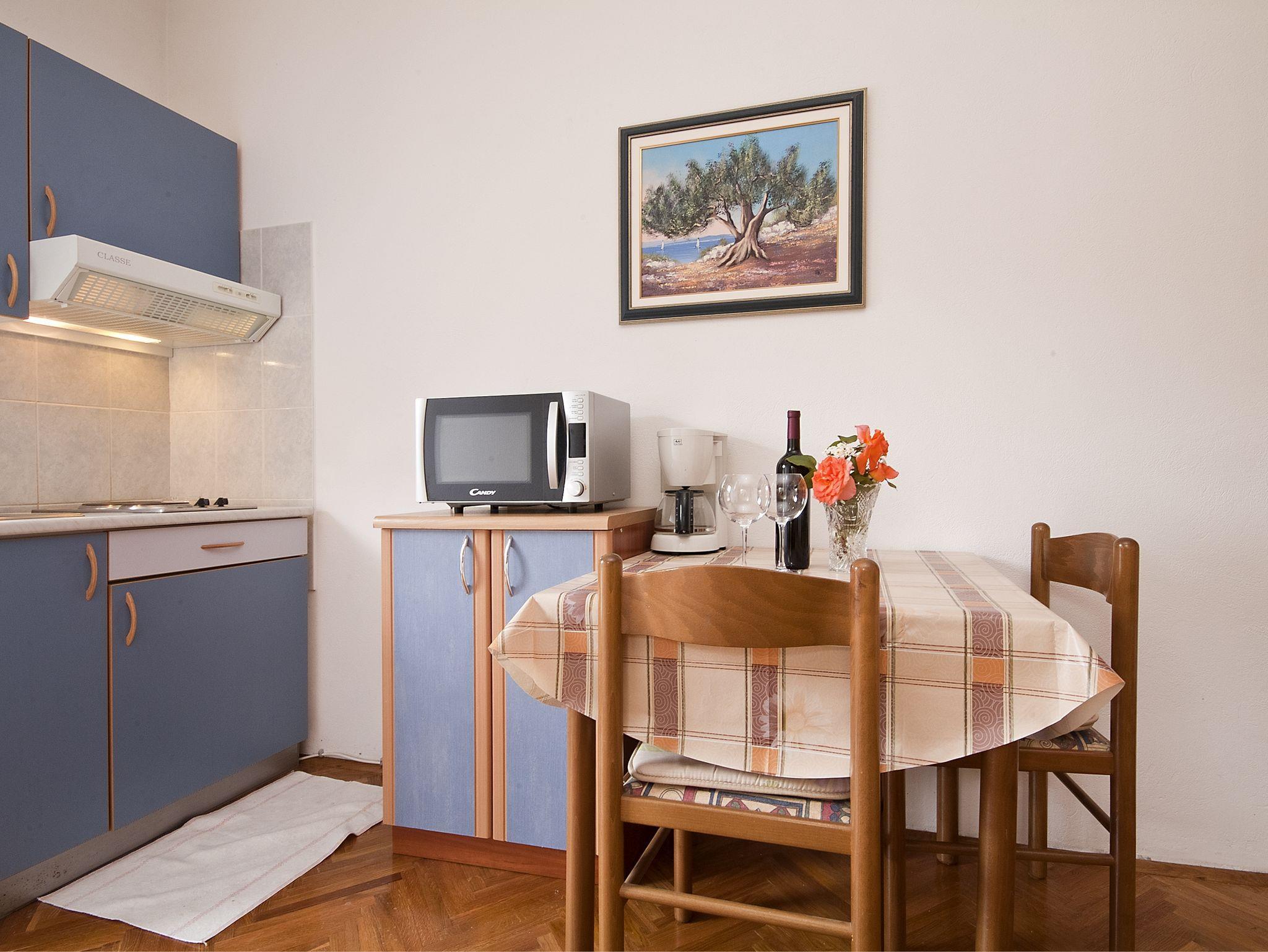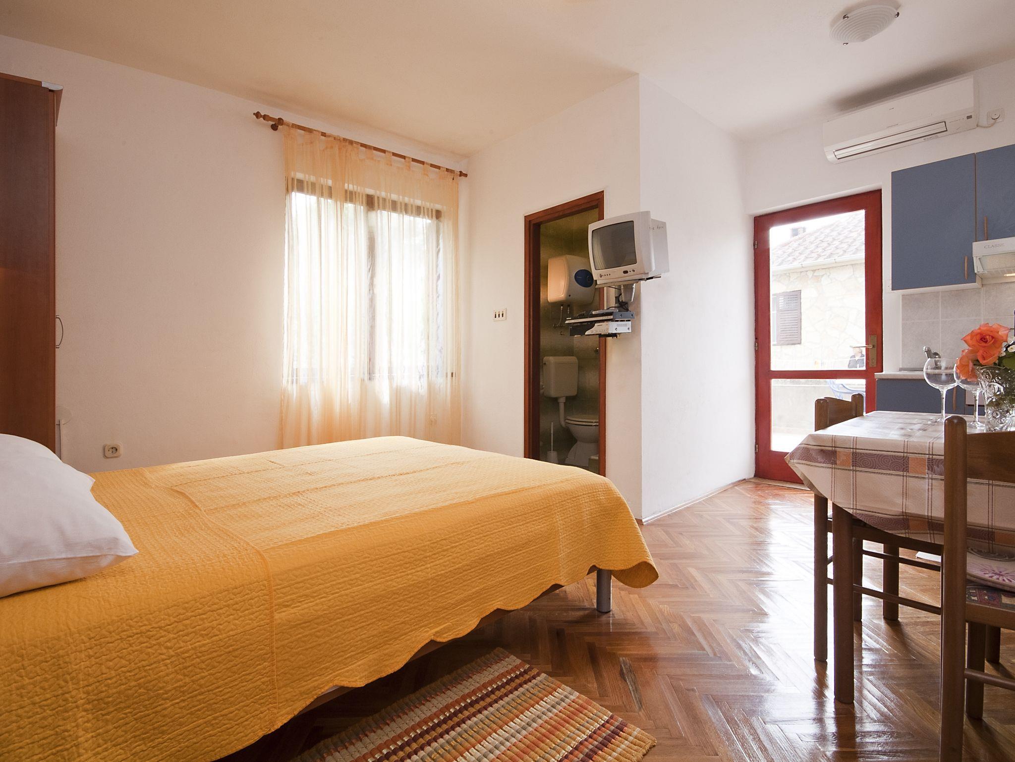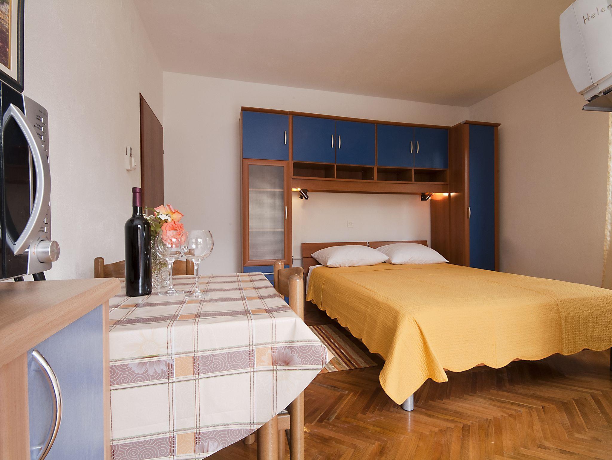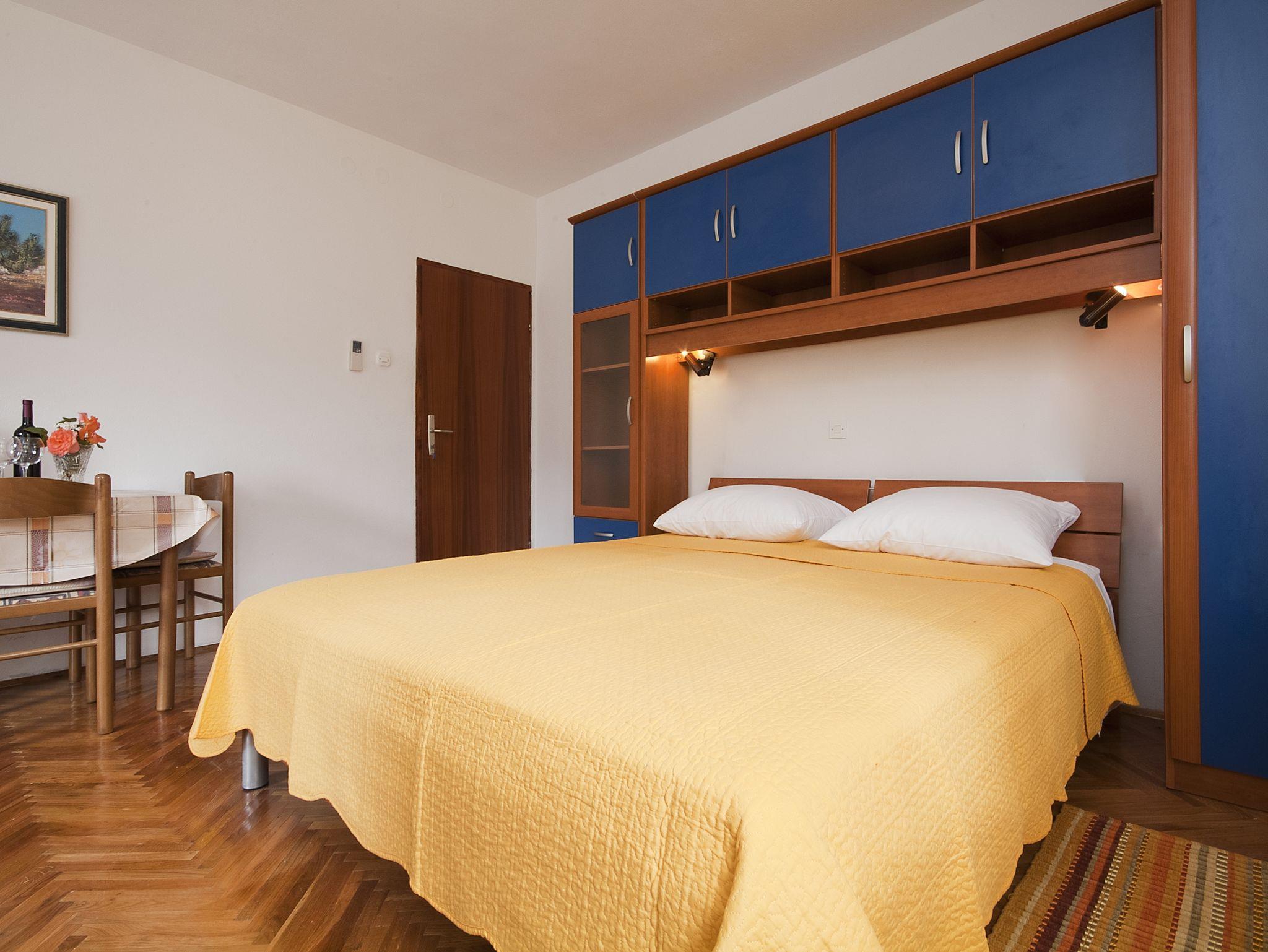 Studio bietet Platz für 2 Gäste. Die Betten sind in Schlafzimmern, die es 1 gibt, innerhalb einer Gesamtfläche von 19m2, angeordnet. Die Gäste haben eine eigene Terrasse zur Verfügung, auf der sie in warmen Sommernächten genießen können. Das Studio-Apartment bietet Meerblick. Es ist erlaubt, Speisen auf dem Gemeinschafts-Grill vorzubereiten. Während ihres Aufenthalts können Gäste das gemeinsam zur Nutzung stehende Schwimmbad benutzen. IM PREIS INBEGRIFFEN: Kurtaxe, Endreinigung, Klimatisierung, Pool, Parkplatz, Internet, Wäschewaschen, Föhn, Sonnenschirm, Liegestühle. UNVERBINDLICHE ZUSÄTZLICHE KOSTEN: Fahrrad (15,00 € täglich (pro Stück)), Zusatzbett (15,00 € pro Nacht). Die Verfügbarkeit zusätzlicher Dienstleistungen in Ihrem reservierten Termin und die Preise derselben (falls nicht aufgeführt) müssen im Voraus überprüft werden. Zusätzliche Dienstleistungen die in der Zahlungsaufforderung nicht aufgeführt sind werden direkt beim Vermieter bezahlt, angenommen der Gast nutzt auch diese.