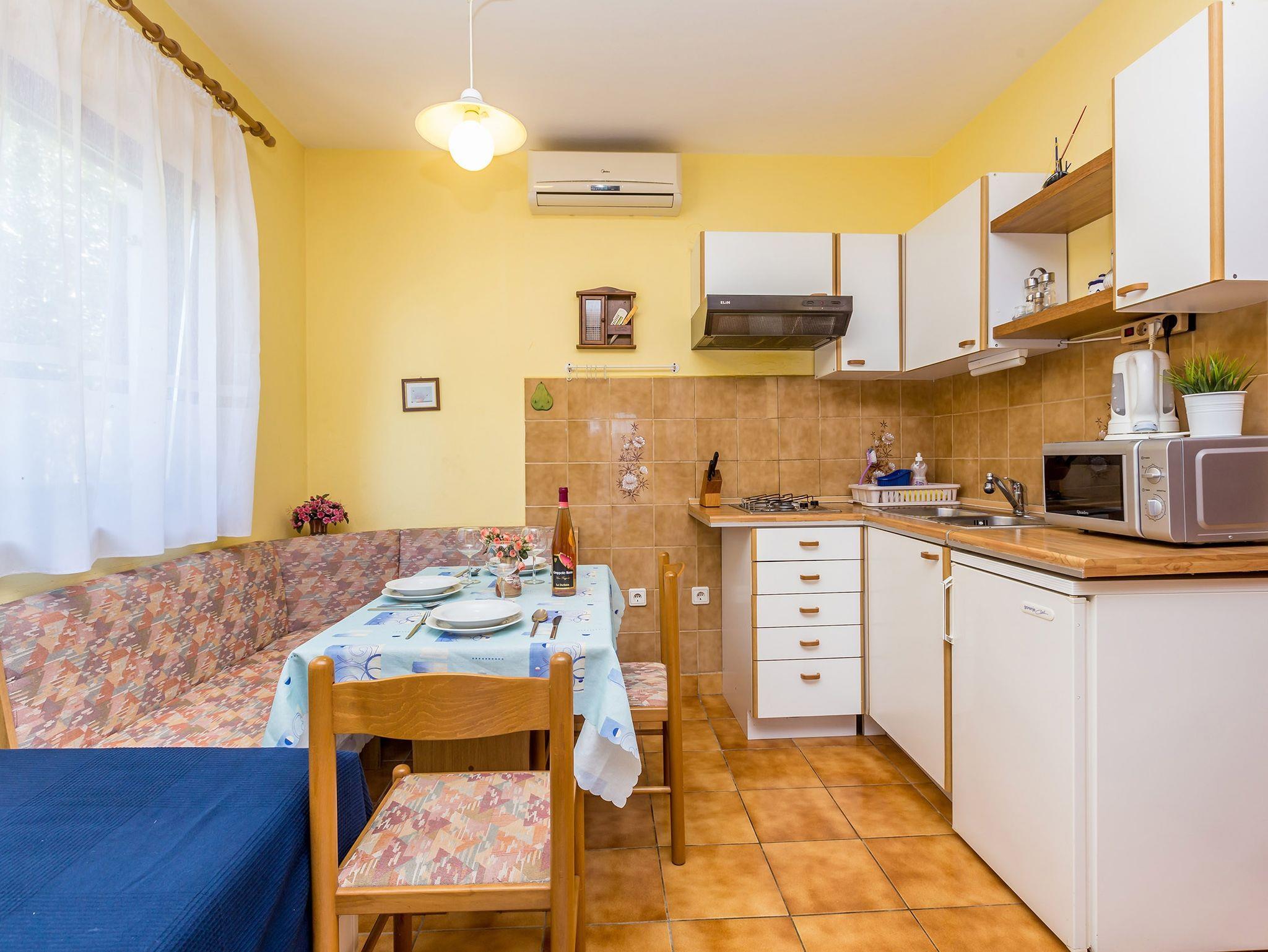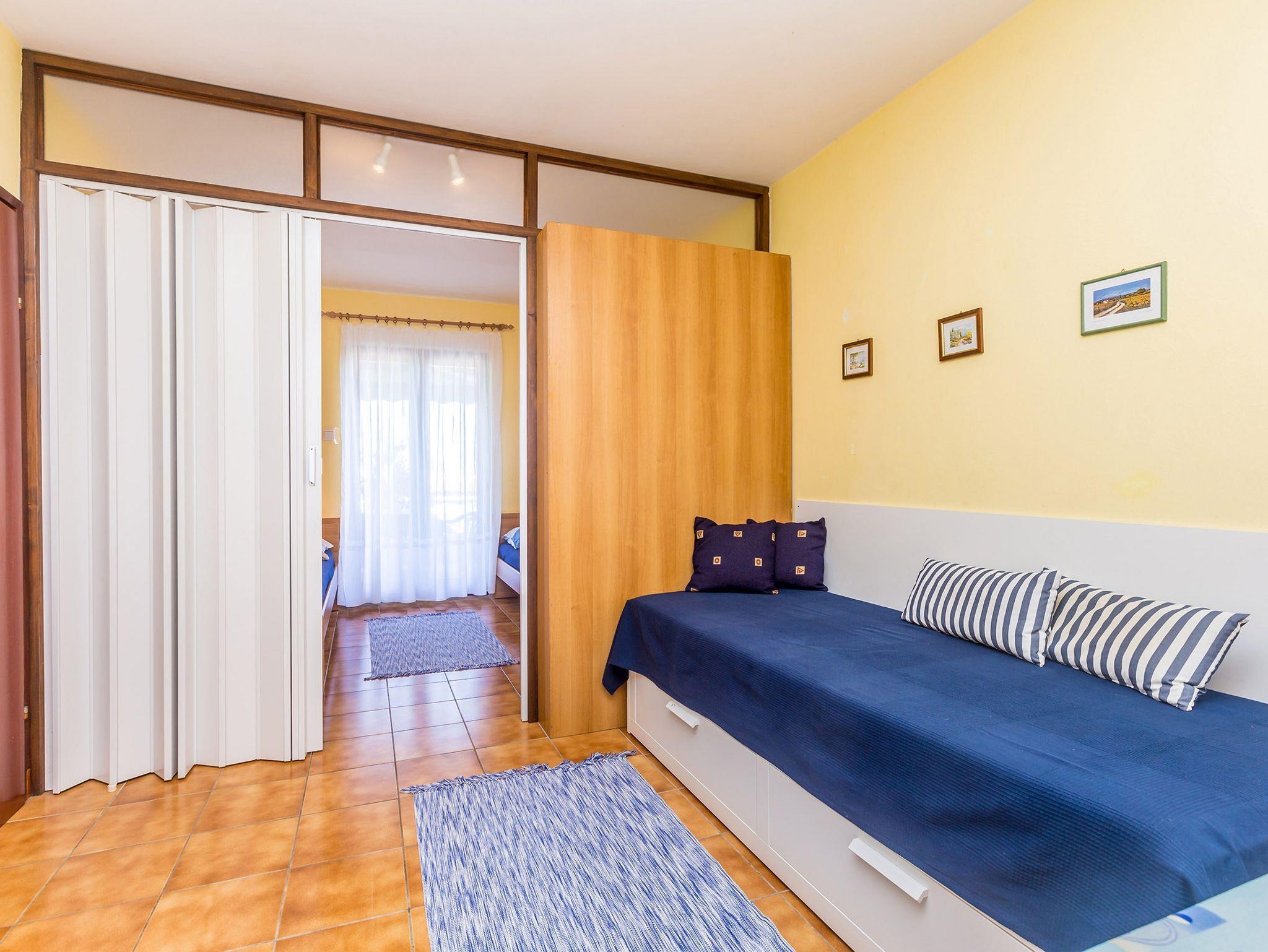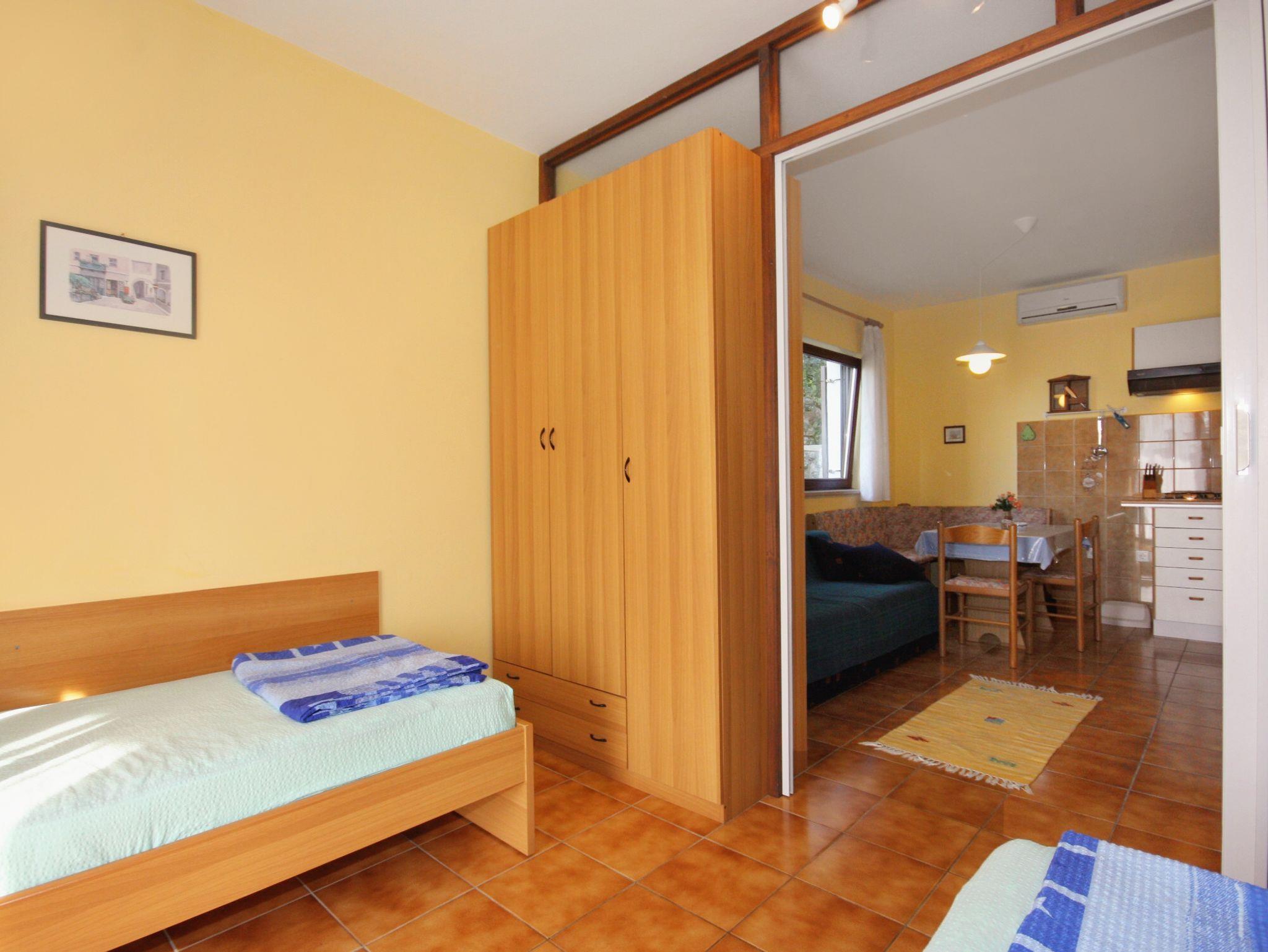 Studio bietet Platz für 4 Gäste. Die Betten sind in Schlafzimmern, die es 1 gibt, und in Esszimmer, innerhalb einer Gesamtfläche von 24m2, angeordnet. Die Gäste haben eine eigene Terrasse zur Verfügung, auf der sie in warmen Sommernächten genießen können. Das Studio-Apartment bietet Meerblick. Es ist erlaubt, Speisen auf dem Gemeinschafts-Grill vorzubereiten. In der Unterkunftseinheit besteht die Möglichkeit des Mitbringens von Haustieren gegen Aufpreis. IM PREIS INBEGRIFFEN: Kurtaxe, Endreinigung, Klimatisierung, Parkplatz, Internet, Wäschewaschen, Kinderbett, Zusatzbett, Bügeleisen, Bügelbrett, Föhn, Sonnenschirm, Liegestühle. VERBINDLICHE ZUSÄTZLICHE KOSTEN: Aufzahlung für Kurzaufenthalte (prozentualer Zuschlag pro Nächtigungsanzahl: 30% - 1, 20% - 2, 10% - 3). UNVERBINDLICHE ZUSÄTZLICHE KOSTEN: Haustiere (5,00 € pro Nacht), Fahrrad (12,00 € täglich (pro Stück)). Die Verfügbarkeit zusätzlicher Dienstleistungen in Ihrem reservierten Termin und die Preise derselben (falls nicht aufgeführt) müssen im Voraus überprüft werden. Zusätzliche Dienstleistungen die in der Zahlungsaufforderung nicht aufgeführt sind werden direkt beim Vermieter bezahlt, angenommen der Gast nutzt auch diese. Ermäßigung auf den Grundpreis: Gratistag 21=19 (bei einem Aufenthalt von 21 Tagen oder mehr erhalten Sie 2 Gratistage für den Aufenthalt bis 31.12.26).