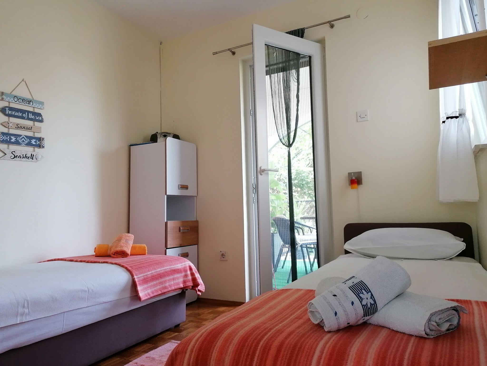 Ferienwohnung bietet Platz für 4 Gäste. Die Betten sind in Schlafzimmern, die es 2 gibt, innerhalb einer Gesamtfläche von 43m2, angeordnet. Die Gäste haben eine eigene Terrasse zur Verfügung, auf der sie in warmen Sommernächten genießen können. Es ist erlaubt, Speisen auf dem Gemeinschafts-Grill vorzubereiten. In der Unterkunftseinheit besteht die Möglichkeit des Mitbringens von Haustieren gegen Aufpreis. IM PREIS INBEGRIFFEN: Kurtaxe, Endreinigung, Klimatisierung, Parkplatz, Internet, Kinderbett, Bügeleisen, Bügelbrett, Föhn. VERBINDLICHE ZUSÄTZLICHE KOSTEN: Aufzahlung für Kurzaufenthalte (prozentualer Zuschlag pro Nächtigungsanzahl: 30% - 1, 20% - 2, 10% - 3). UNVERBINDLICHE ZUSÄTZLICHE KOSTEN: Wäschewaschen (2,00 € Waschen), Haustiere (10,00 € pro Nacht). Die Verfügbarkeit zusätzlicher Dienstleistungen in Ihrem reservierten Termin und die Preise derselben (falls nicht aufgeführt) müssen im Voraus überprüft werden. Zusätzliche Dienstleistungen die in der Zahlungsaufforderung nicht aufgeführt sind werden direkt beim Vermieter bezahlt, angenommen der Gast nutzt auch diese. Ermäßigung auf den Grundpreis: Gratistag 14=13 (bei einem Aufenthalt von 14 Tagen oder mehr erhalten Sie einen Gratistag für den Aufenthalt bis 31.12.26).