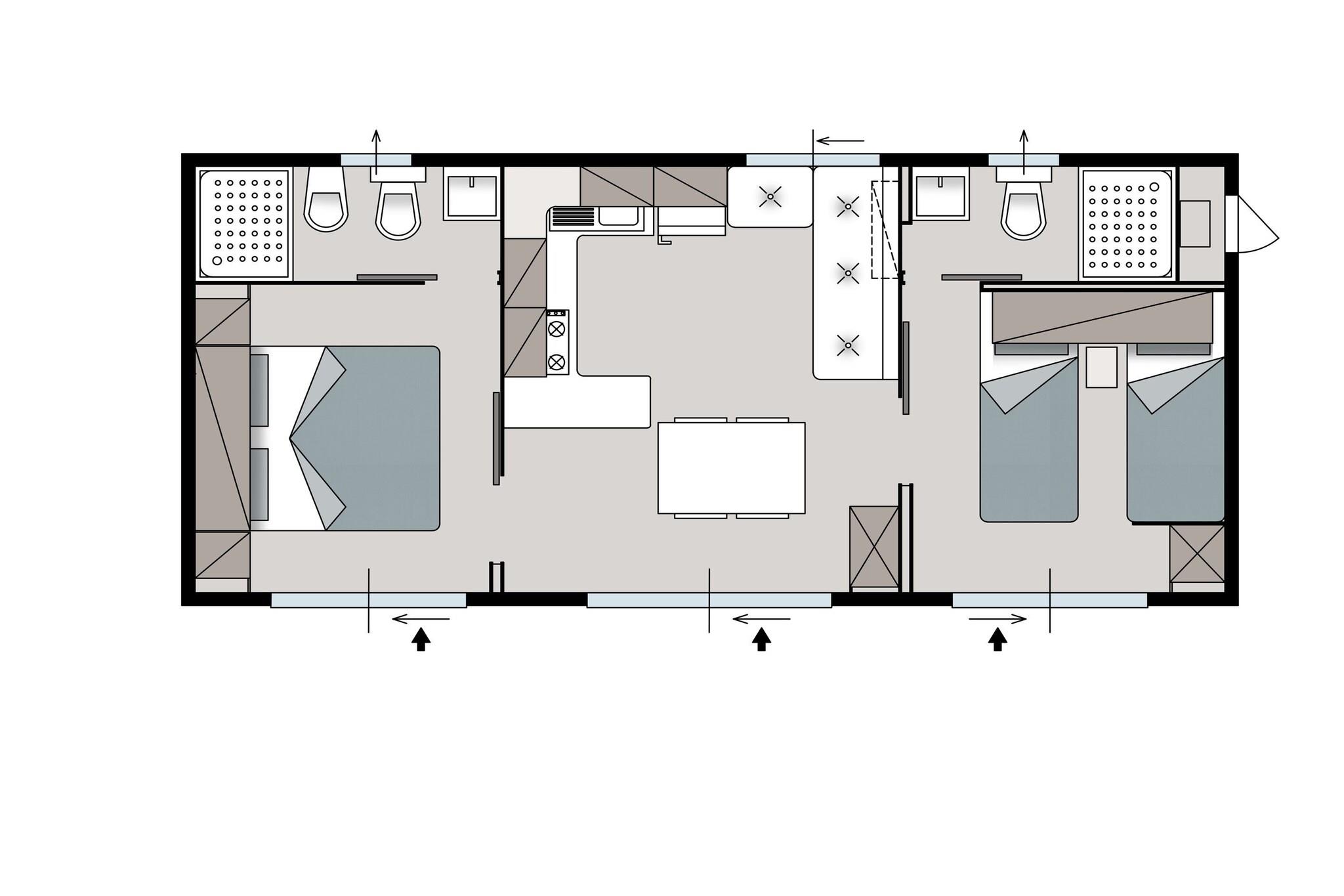 Stueetage: (Stue(enkeltsovesofa, Fjernsyn(parabol)), åbent køkken(spisebord, kogeplade(Komfur med fire kogeplader, gas), kaffemaskine, mikrobølgeovn, køle-fryseskab), soveværelse(dobbeltseng), soveværelse(enkeltseng, enkeltseng), badeværelse(bruser, toilet), badeværelse(bruser, toilet), klimaanlæg, terrasse(overdækket), havemøbler, baldakin) Reception, Spabad, Supermarked, Bordtennis, Cykeludlejning, Kanoudlejning, Strand, Basketball, Restaurant, Bar, solstole, parkering, swimmingpool(deles med andre gæster), tennisbane, fitnessapparater