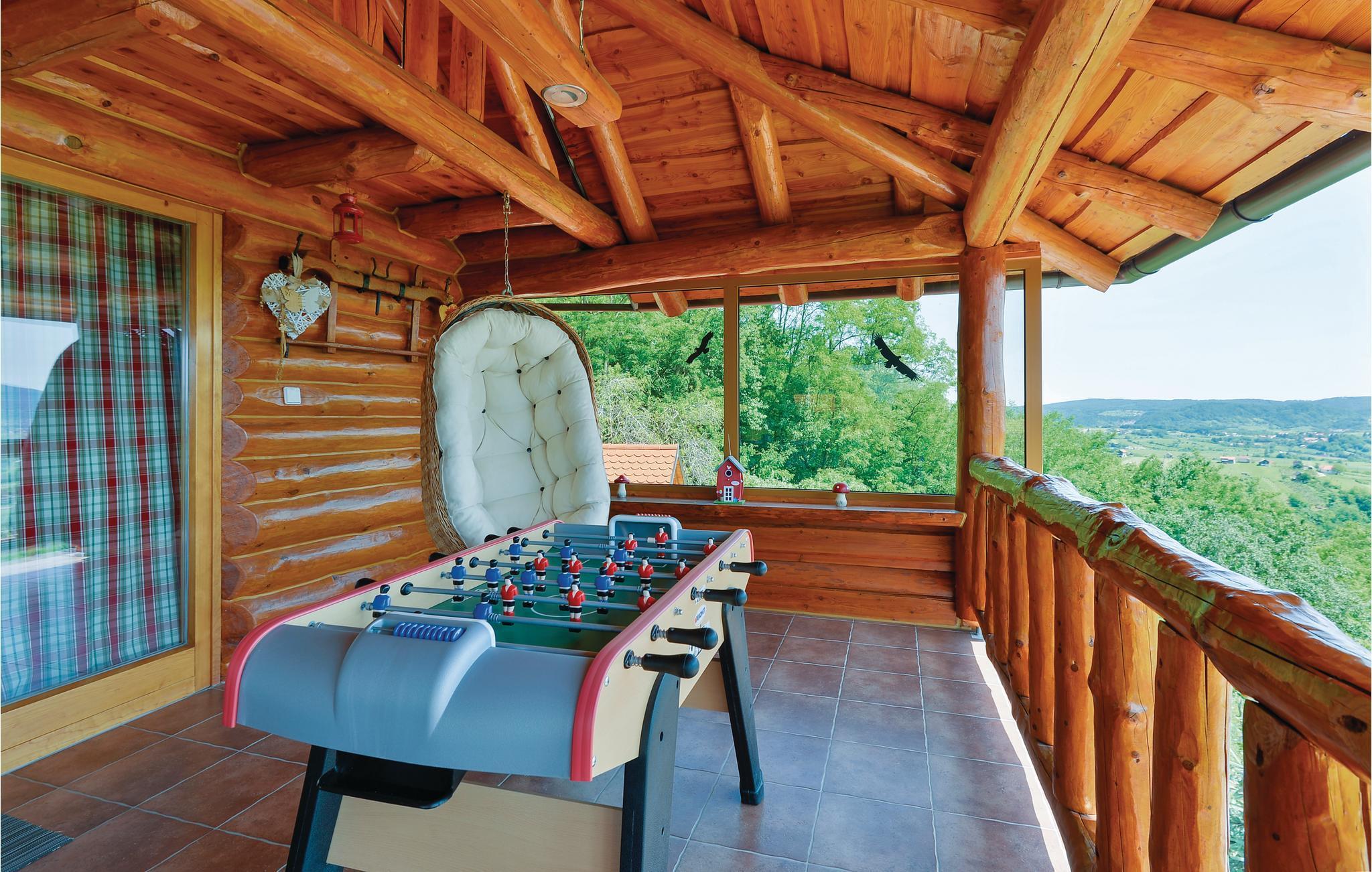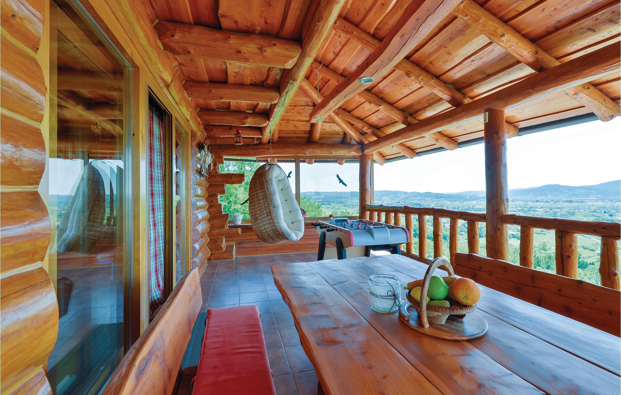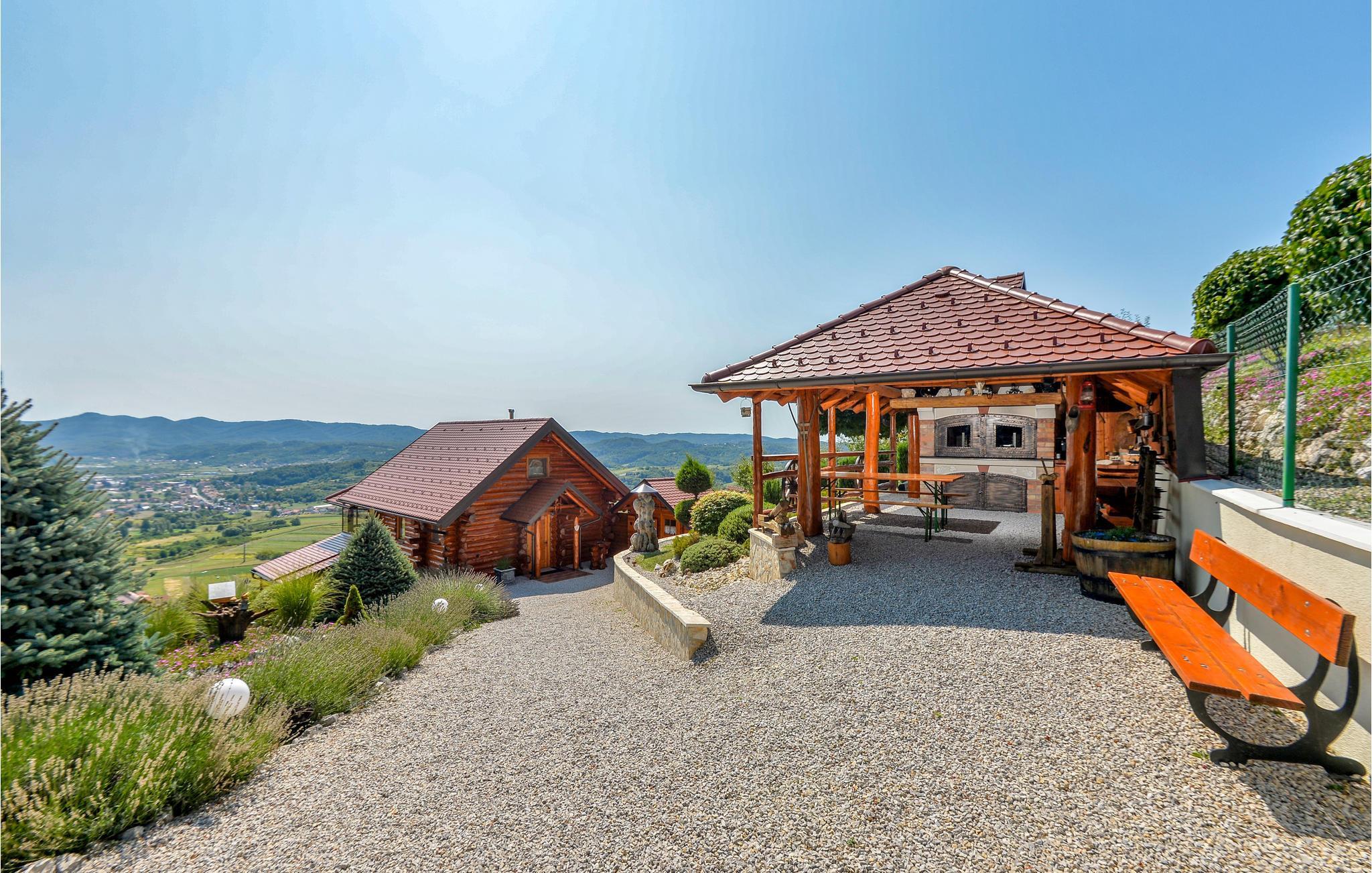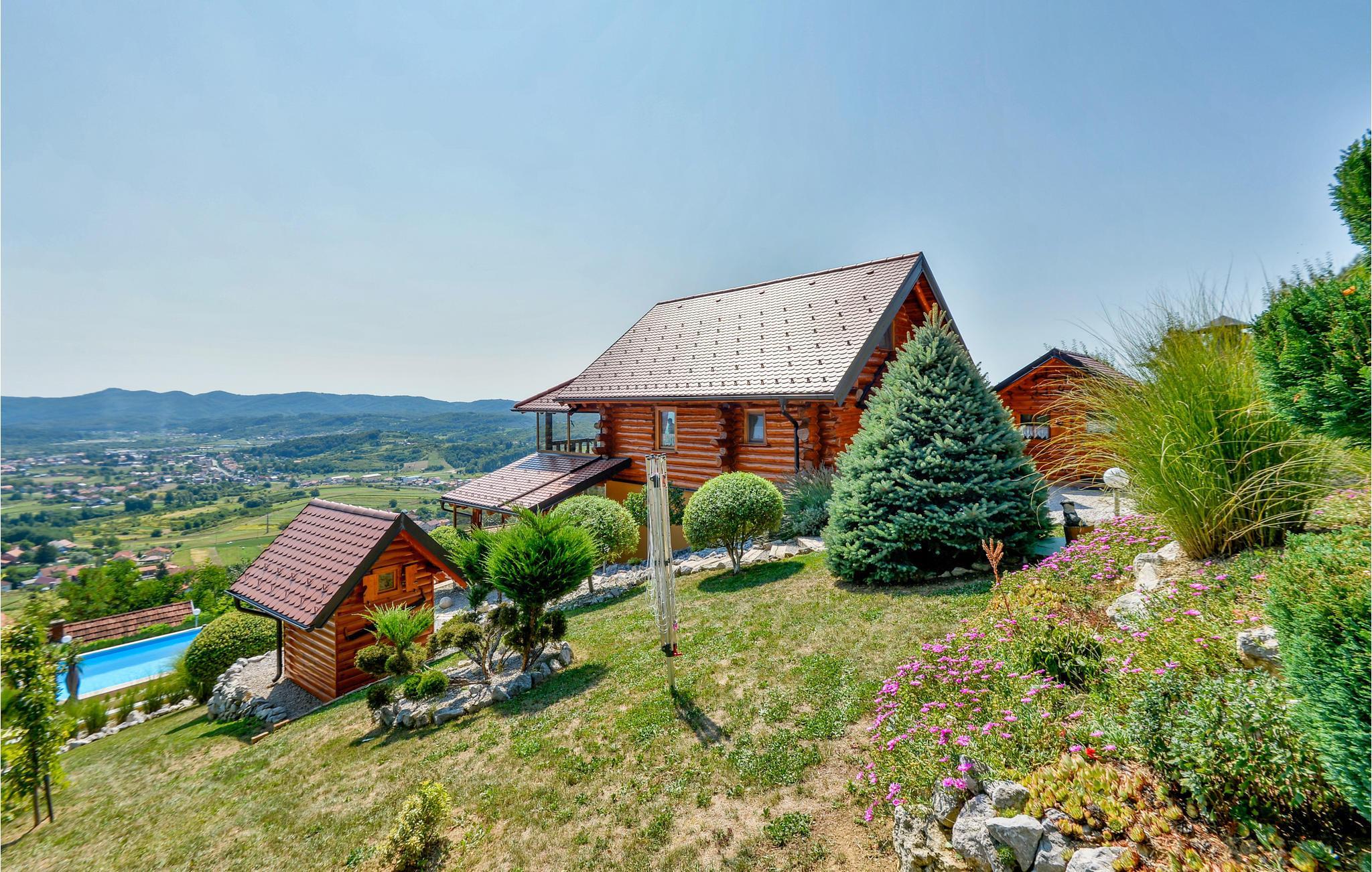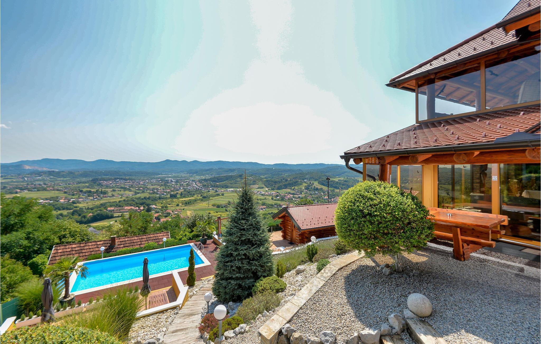Dette feriehus er bygget af træ, ligger på et bjerg, med en fantastisk udsigt over dalen og de omliggende bjerge. Slap af på jeres altan og lad jer fortrylle af det fantastiske panorama. Foran huset er der en skøn pool med solterrasse og whirlpool og desuden er der et lille anneks med sauna og brusebad. Bag huset er der en overdækket terrasse med grill og sommerkøkken. Lær Varaždins rige historie at kende, med barokpaladser og romantiske små stræder. I nærheden ligger Varaždinske Toplice med sine kurbade, samt mange former for sports- og fritidsaktiviteter. Mod bestilling og betaling kan ejer sørge for catering. Laveste loftshøjde pga skrå vægge er 50 cm i siden.