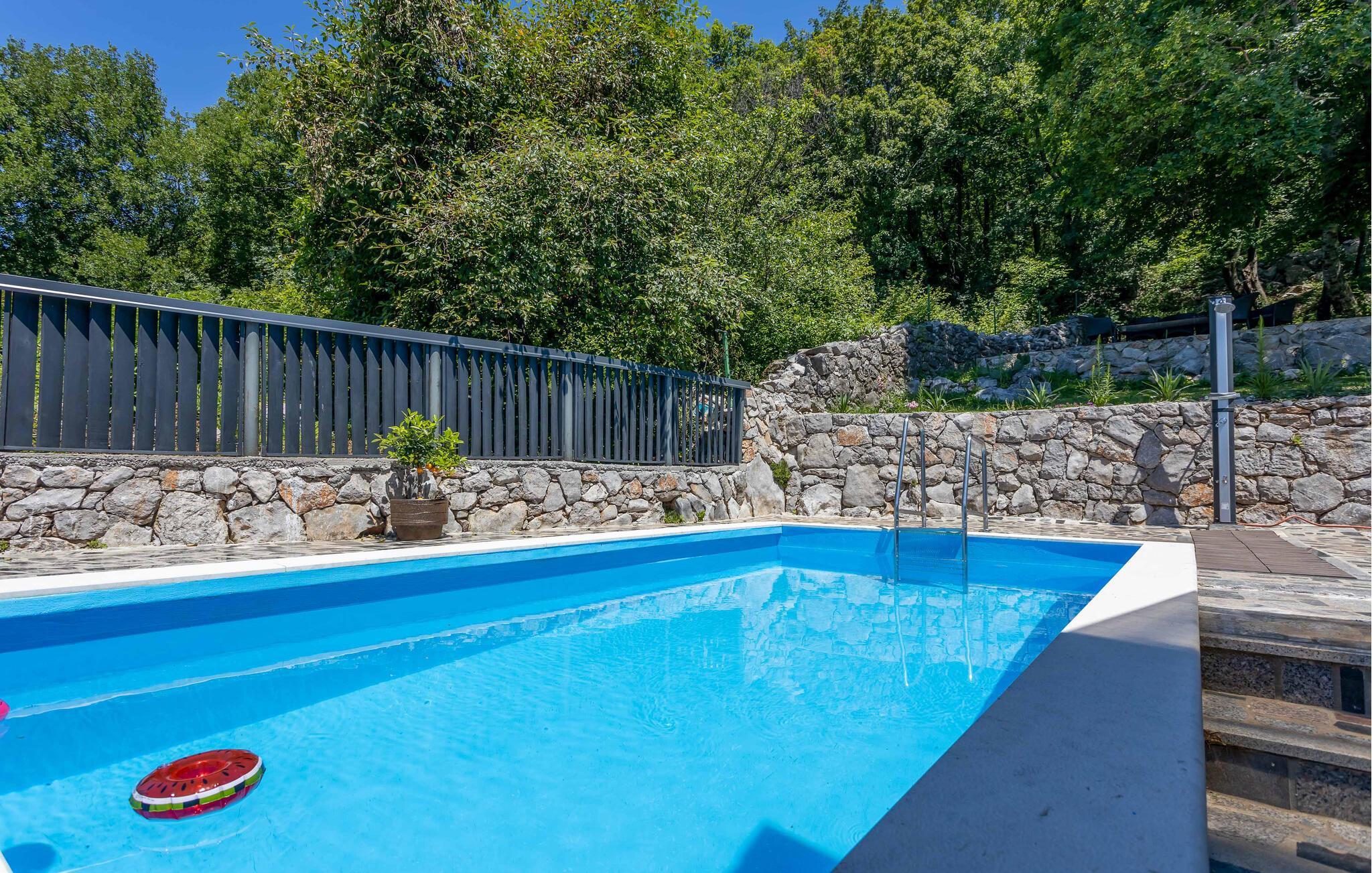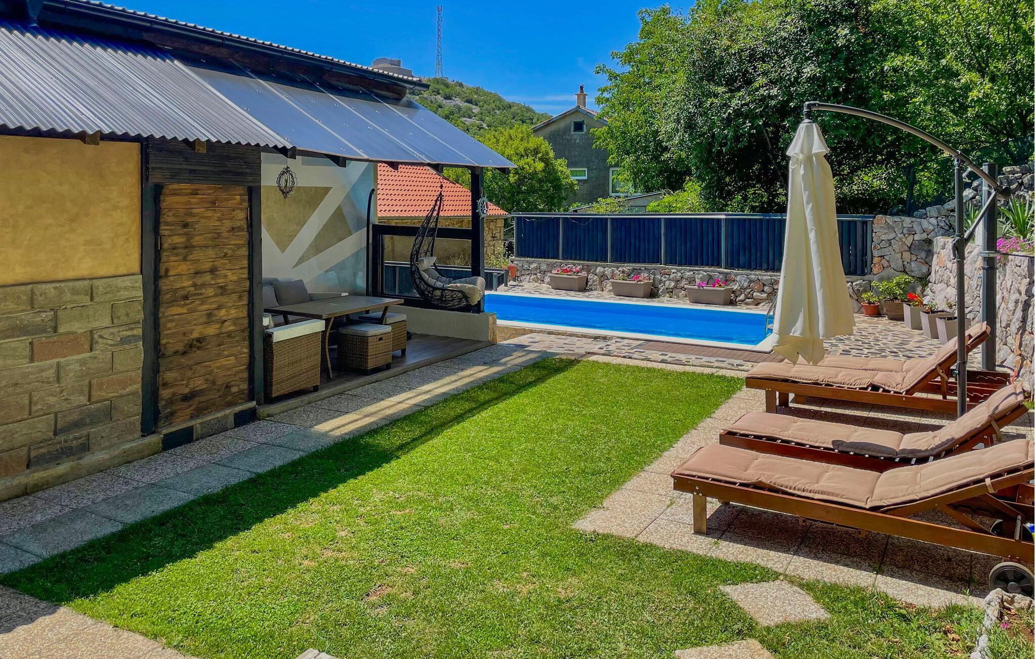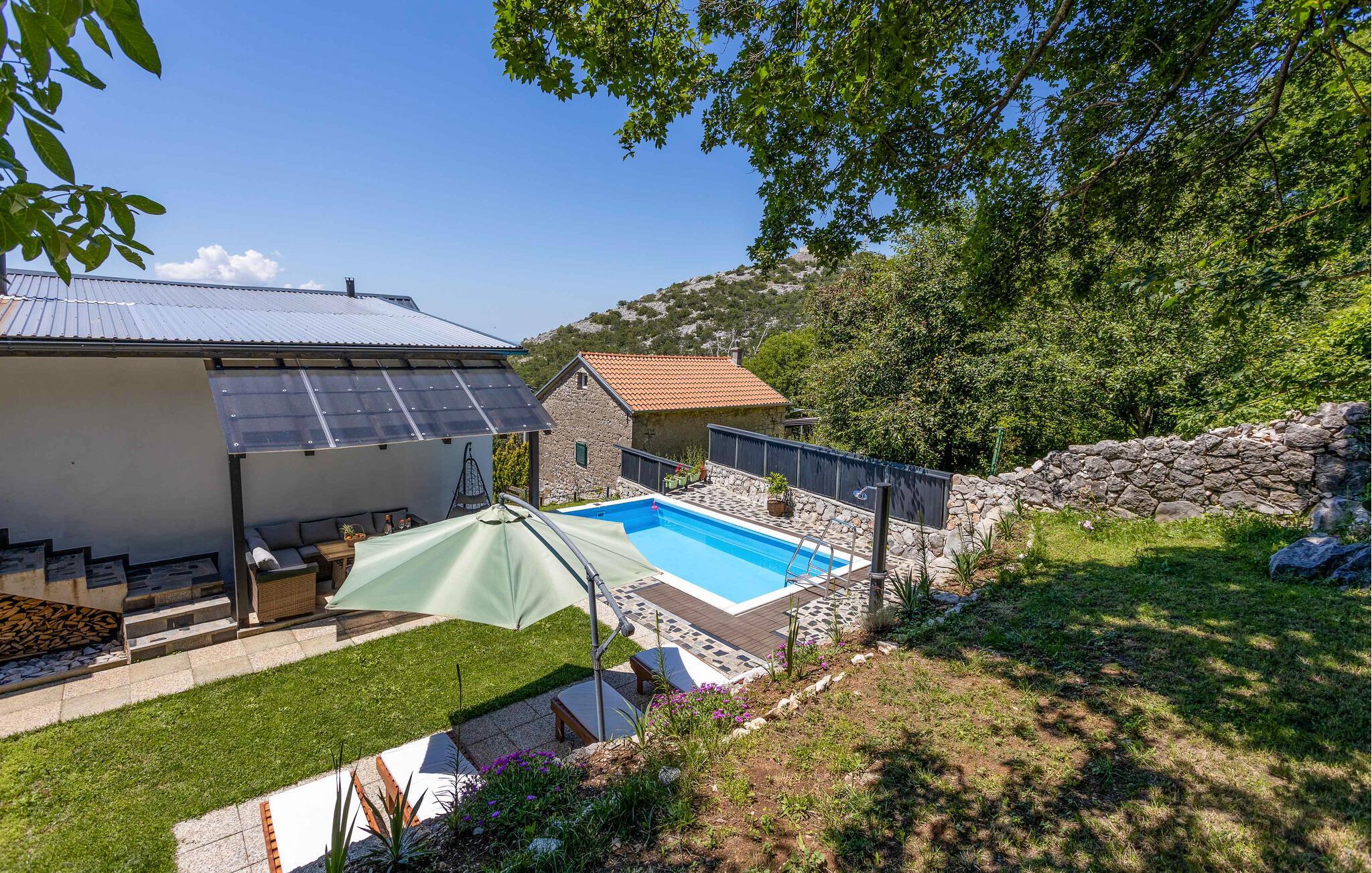Nyd den private pool, som er omgivet af en stor terrasse og frodige grønne områder. Slå jer ned på de komfortable liggestole og mærk den varme kroatiske sol. Tag en forfriskende dukkert i poolen eller slap af i det hyggelige udendørs opholdsområde, mens I nyder den friske luft, naturens stilhed og udsigten over det omkringliggende bjerglandskab.