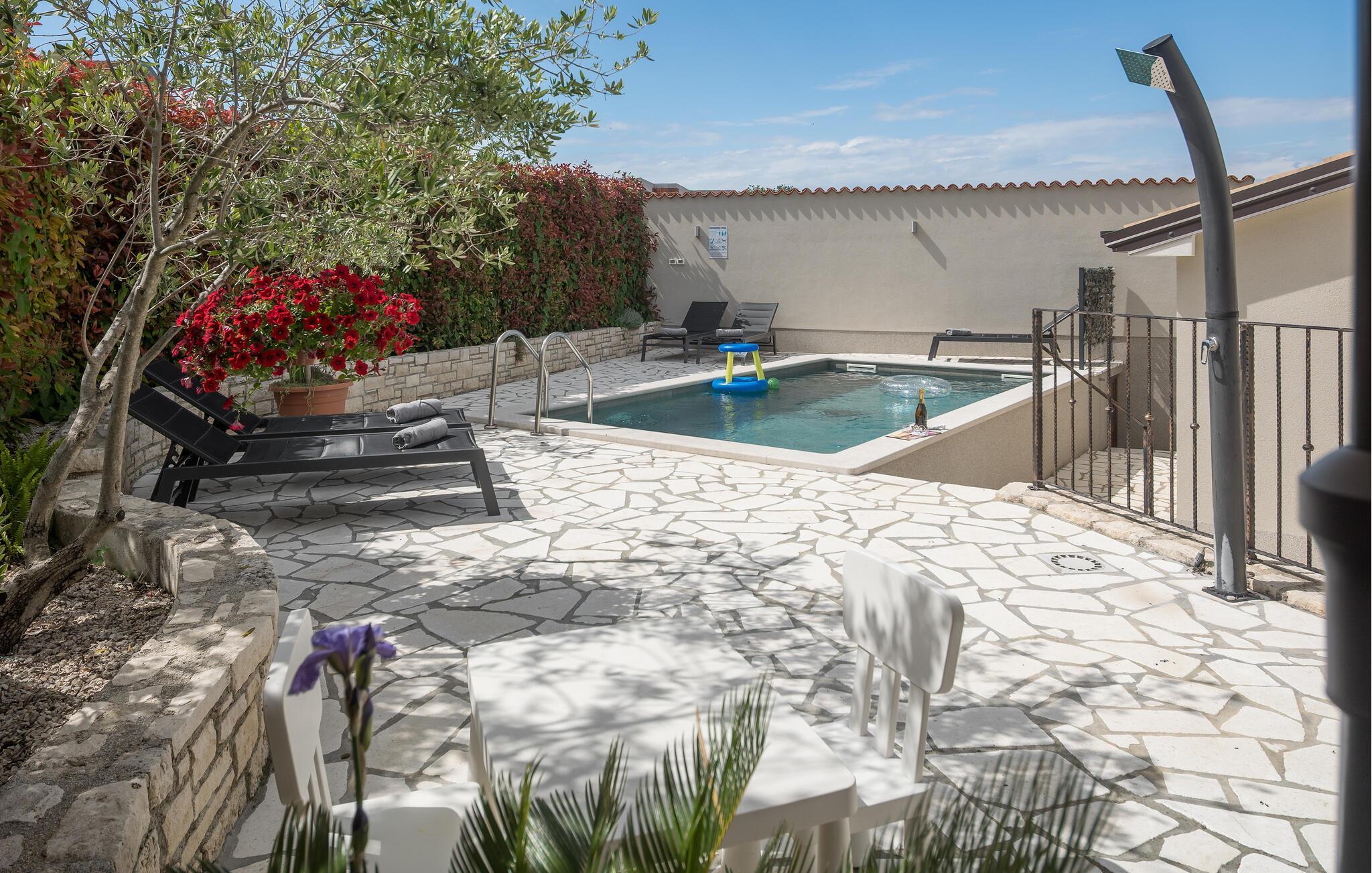 Her bor I i et komfortabelt, moderne hus og kan nyde den smukke, landlige beliggenhed. Slap af på terrassen ved poolen og nyd udsigten over landskabet.