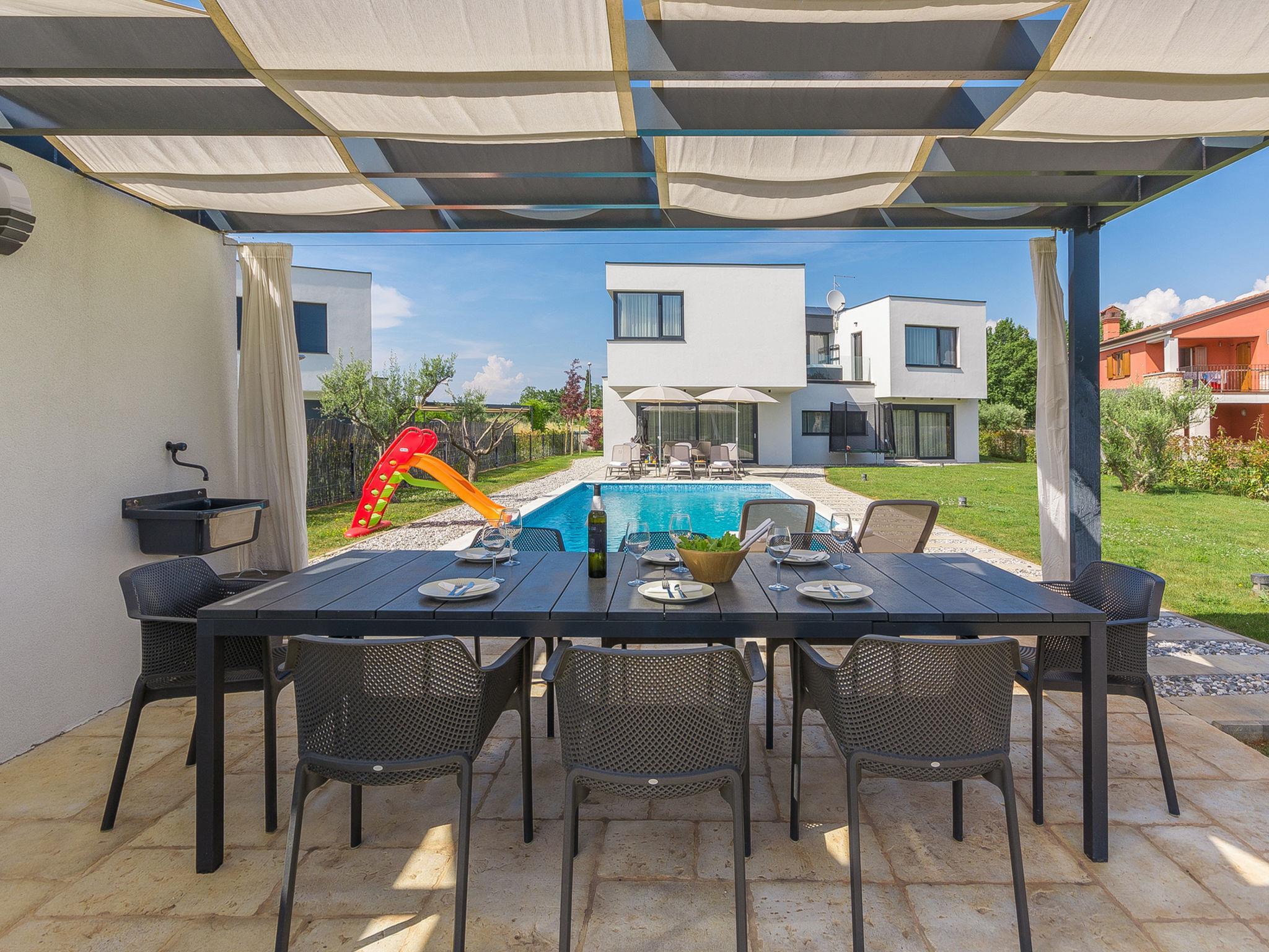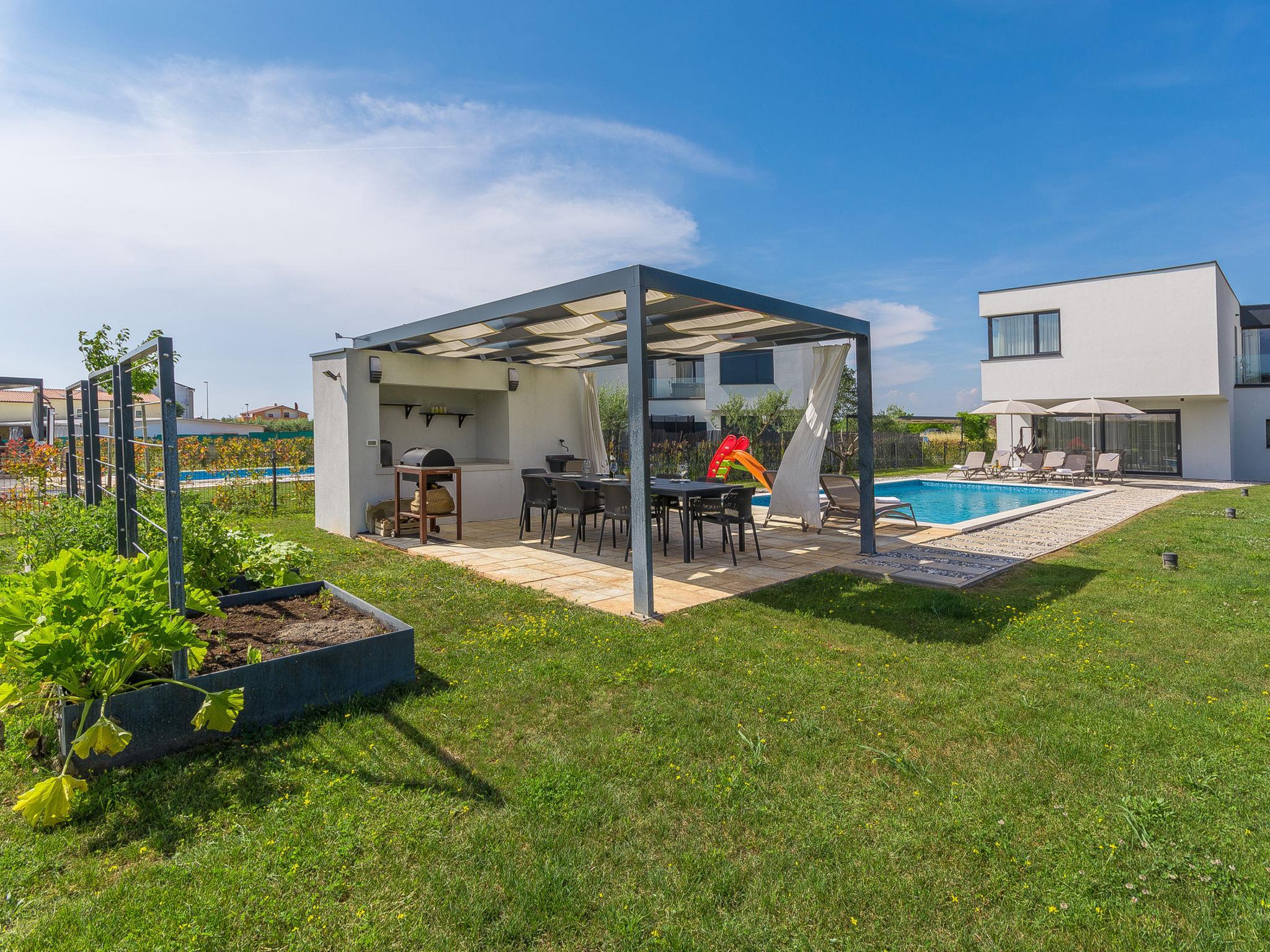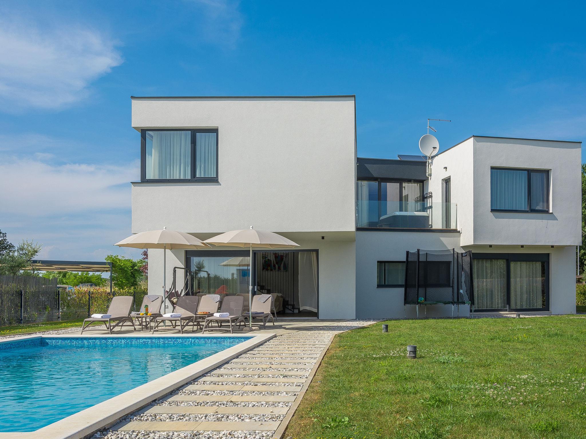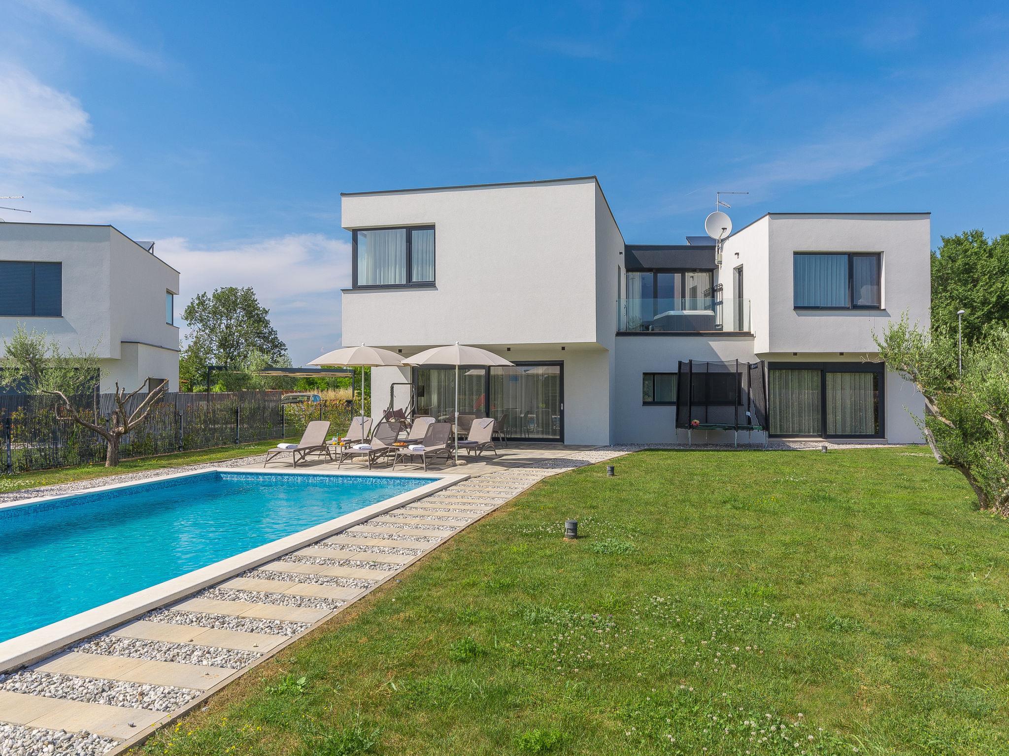 Modern villa "Paolo", 2 storeys. In the hamlet Stancija Vinjeri 2 km from the centre of Novigrad, in a sunny position, 3 km from the sea, 3 km from the beach. Private: property 1'100 m2 (fenced), garden with lawn, swimming pool angular, heated (9 x 5 m, depth 140 cm, seasonal availability: 01.Jan. - 31.Dec.) with internal staircase. Outdoor shower, hot tub, arbour (20 m2), terrace, garden furniture. In the house: internet access, sauna, table football, trampoline, washing machine, tumble dryer. Parking (for 3 cars) at the house on the premises. Shop 1.5 km, supermarket 1.5 km, restaurant 500 m, bus stop 2 km, pebble beach 3 km, rocky beach 3 km. Tennis 2 km, walking paths from the house 500 m, cycle lane 550 m. Nearby attractions: Aquapark 5 km. Please note: airfield 20 km from the property. Swimming pool heated (extra). It is necessary to announce 7 days in advance if the pool heating is required. Available: garden with organic, seasonal fruit and vegetables (included in the price).